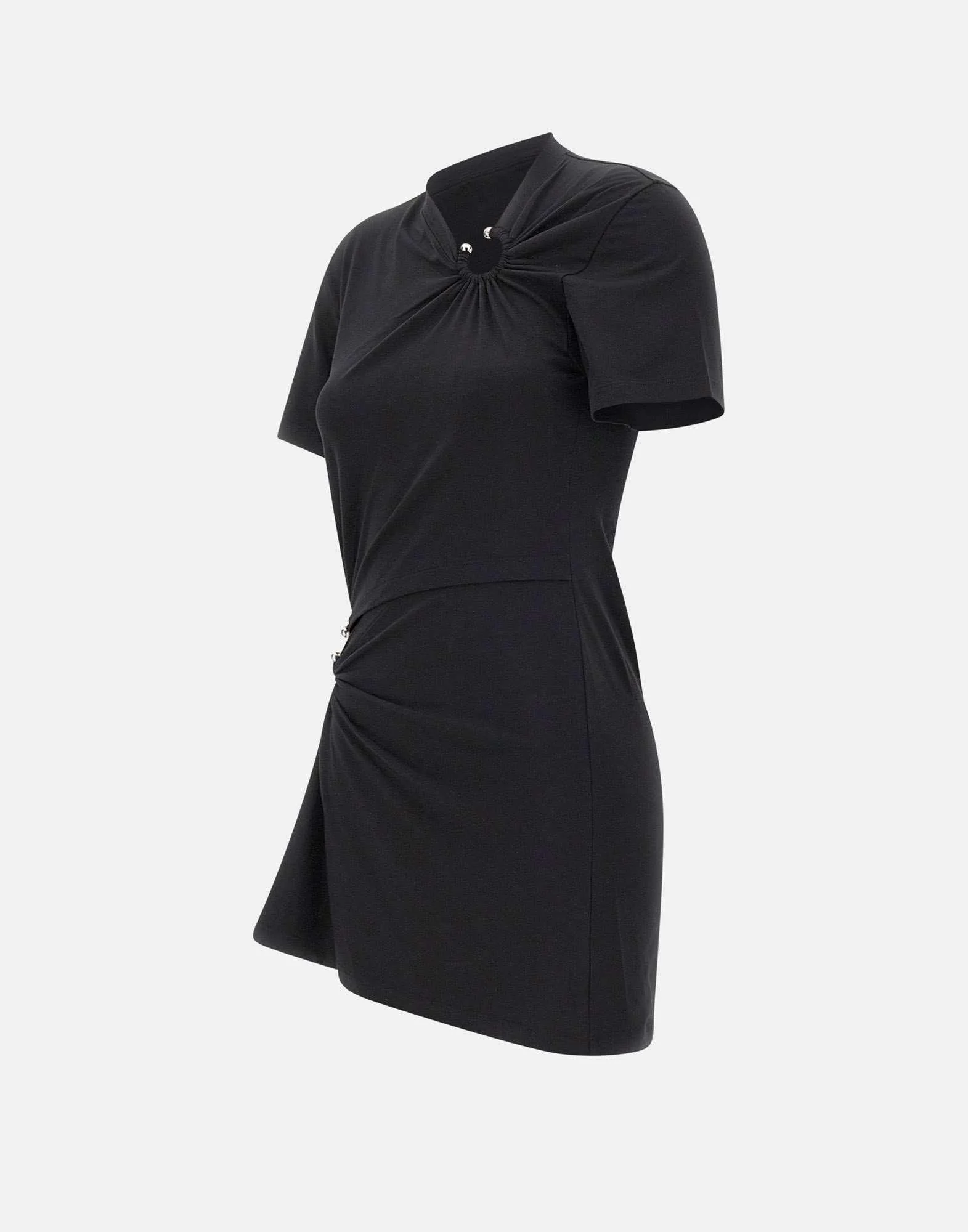 Abito corto Rabanne in cotone elasticizzato color nero, a maniche corte, pensato per un look contemporaneo e deciso. Il design è caratterizzato da dettaglio cut-out sulla pancia e da anelli che creano arricciature sullo scollo e in vita, definendo la silhouette con un effetto grafico e femminile. Sul retro è applicato un logo metallico che firma il capo con un tocco distintivo. Vestibilità slim, ideale come abito corto per outfit da sera e occasioni speciali.