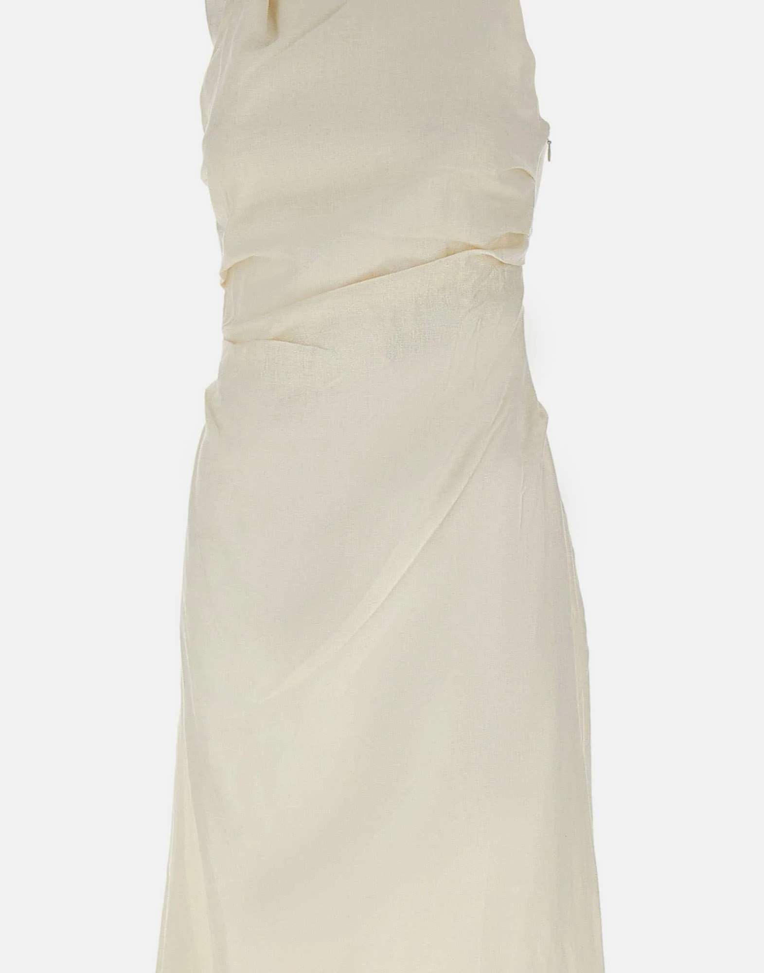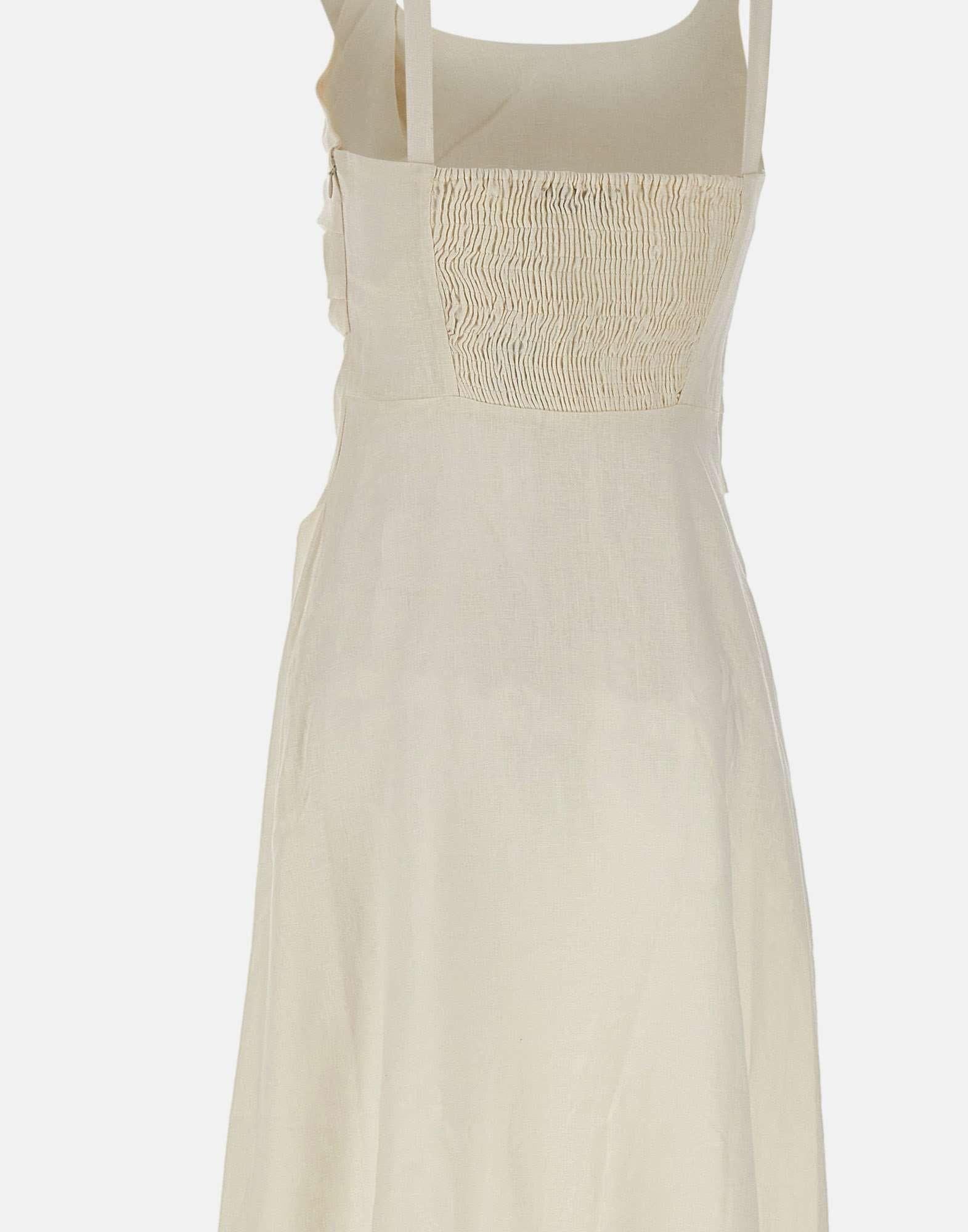 Abito lungo Faithfull “Cera” realizzato in 100% lino color panna, pensato per un’eleganza naturale e leggera. Il modello presenta scollo tondo e maniche a giro, con arricciature sui fianchi che valorizzano la silhouette con un effetto morbido e femminile. E’ caratterizzato da una piega sulla spallina destra e da un dettaglio smock sulla schiena che aggiunge comfort e definizione. Chiusura con zip laterale invisibile per una linea pulita. Vestibilità regolare, ideale come abito in lino per look estivi e quotidiani.