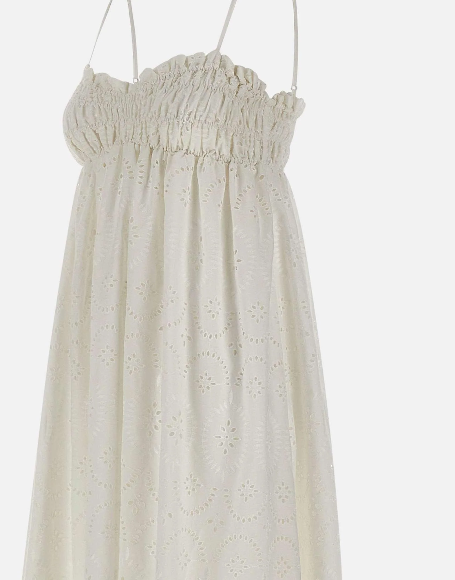 Abito lungo Faithfull The Brand “Etta” realizzato in delicato pizzo di cotone color bianco, con ispirazione vintage e un’eleganza leggera. Il busto è arricciato e rifinito da un delicato dettaglio a balza lungo la scollatura, completato da spalline sottili regolabili in lunghezza. La vita impero arricciata definisce la silhouette e accompagna una gonna a trapezio dal movimento naturale. Il busto elasticizzato offre ulteriore elasticità, rendendo questo abito lungo ideale per giornate di sole e serate miti. Vestibilità regolare.
