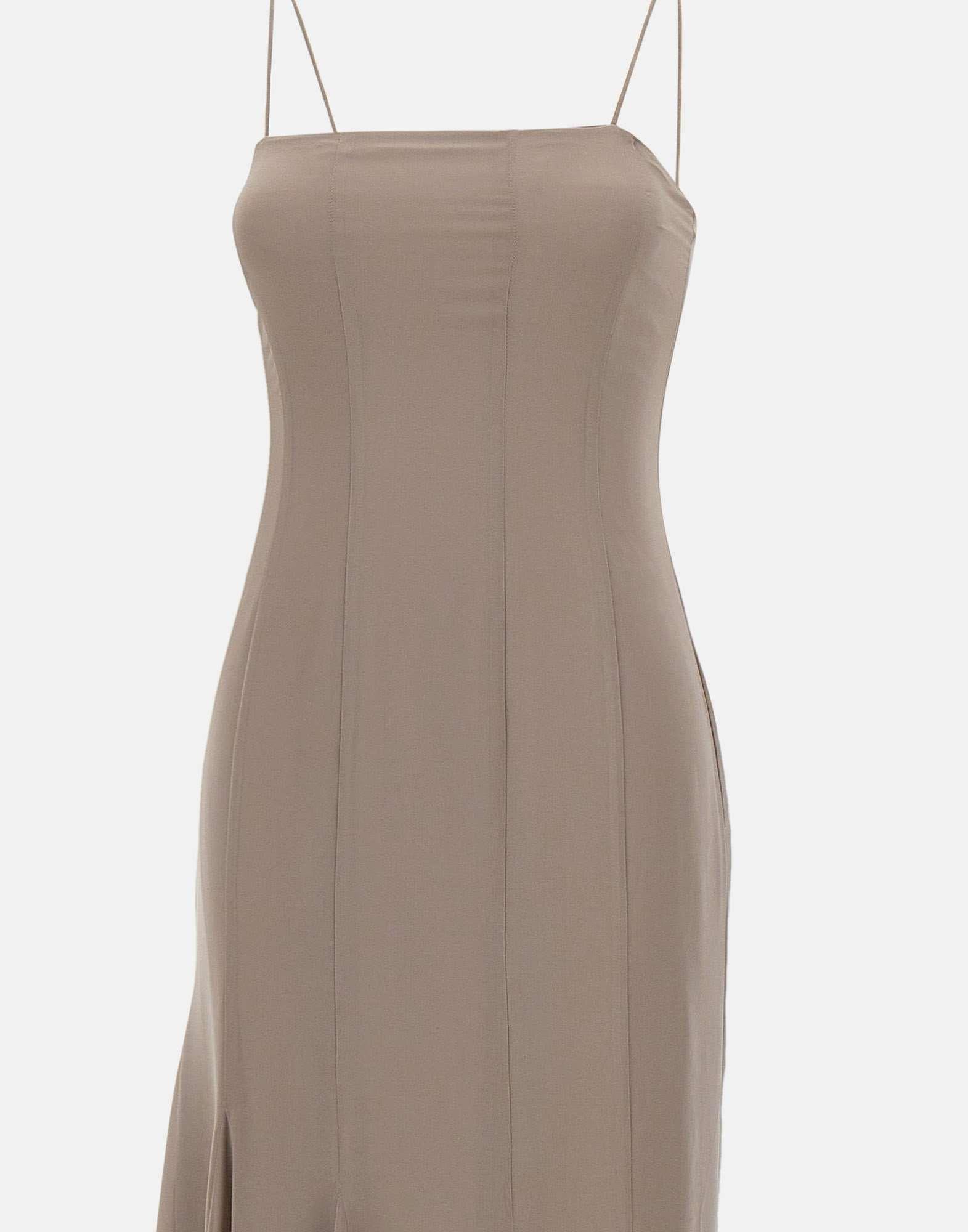 Abito lungo Rotate realizzato in chiffon color talpa, con silhouette lunga, fluida ed elegante. Il design minimal presenta spalline sottili e scollatura dritta per un look pulito e contemporaneo, mentre le cuciture verticali seguono la linea del corpo e accompagnano l’orlo leggermente svasato, creando un movimento scorrevole. Lo chiffon leggero risulta arioso e semi trasparente, mantenendo una forma allungata e raffinata, completata da fondo con balze e chiusura con zip invisibile sul retro per una finitura ordinata.