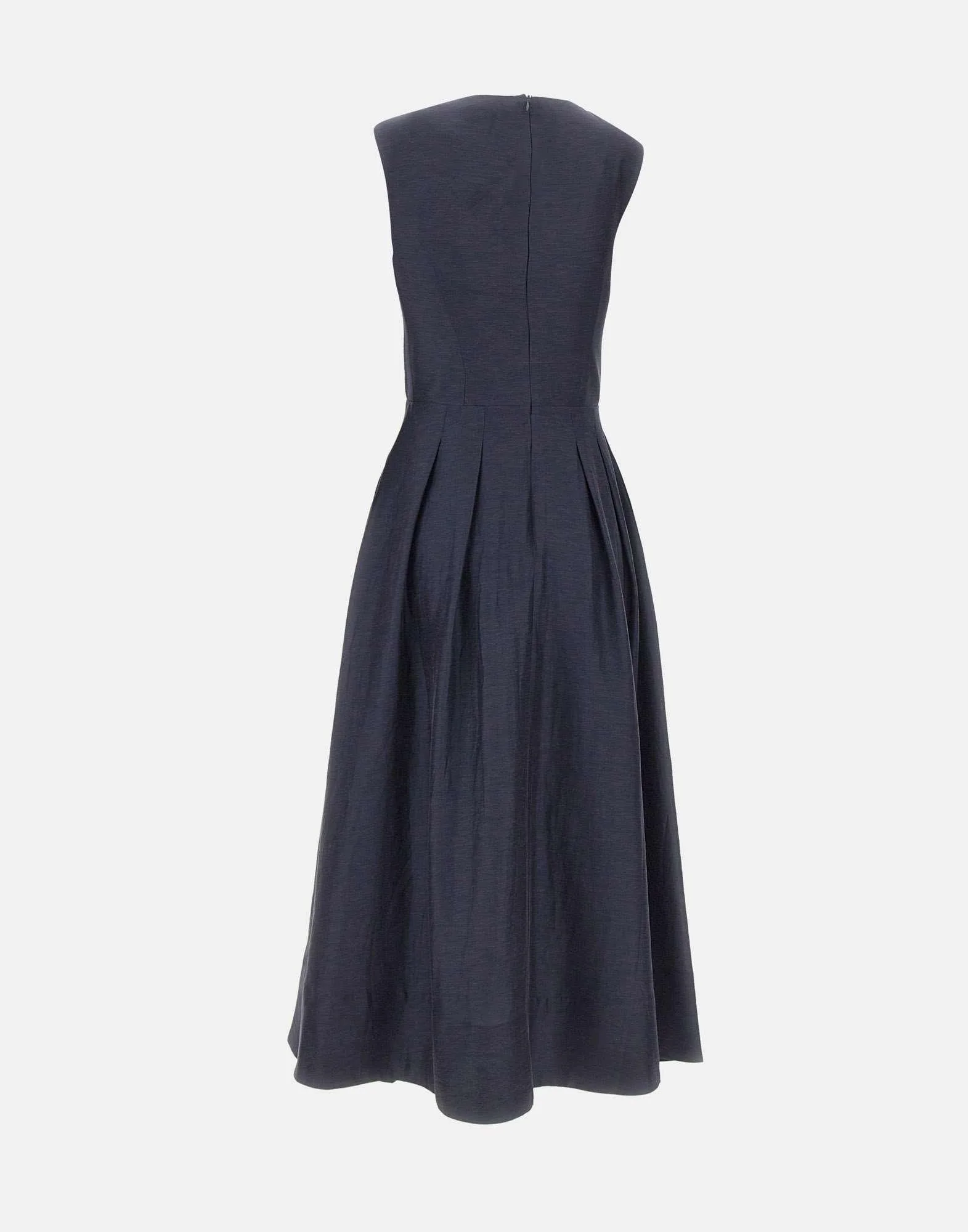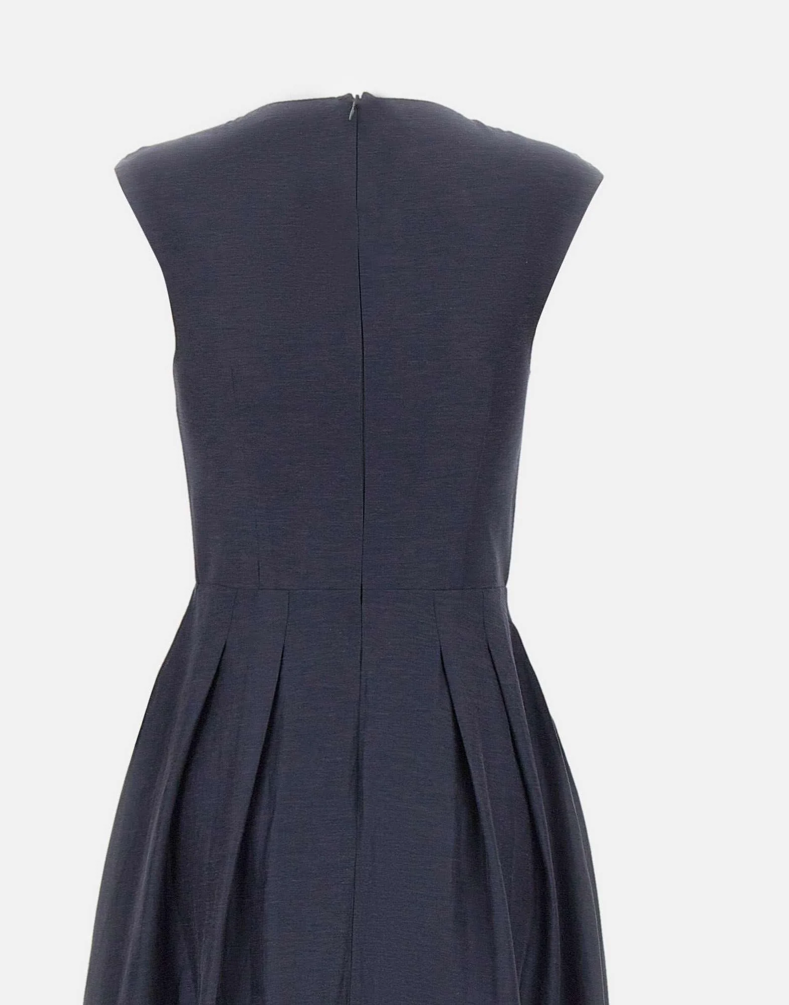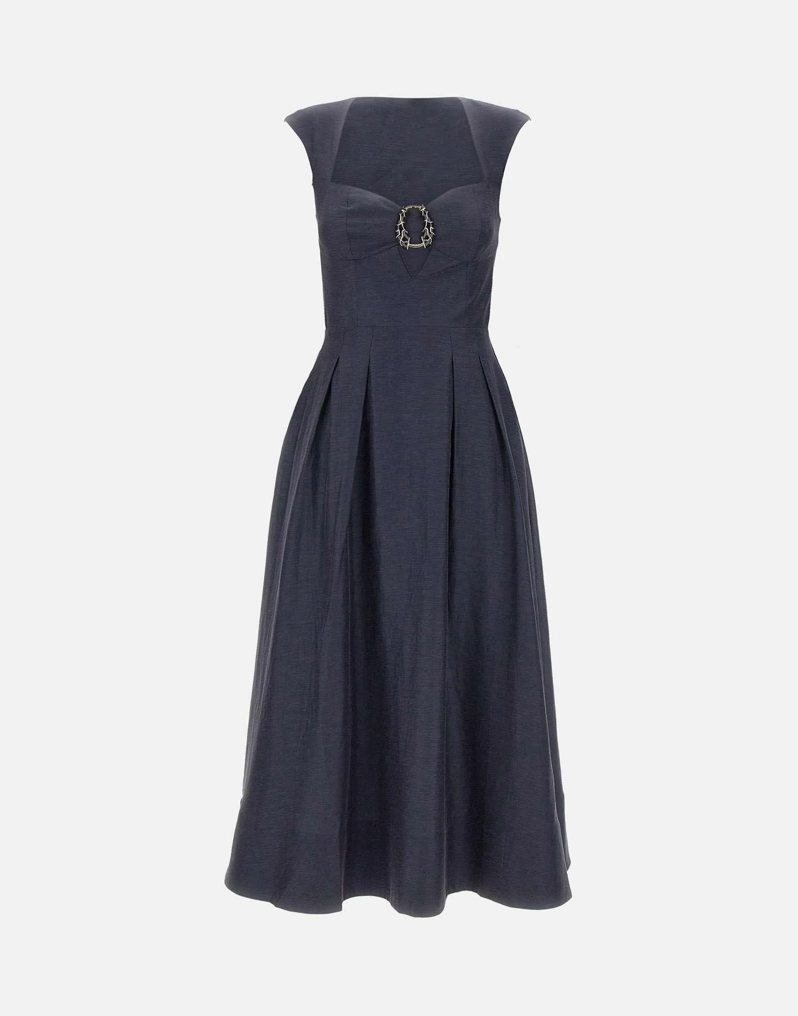 Abito midi Rebecca Vallance “Serenity” color blu navy, caratterizzato da finiture art deco che aggiungono un dettaglio raffinato e distintivo. Il design presenta scollatura a cuore e corpetto aderente con cut-out frontale, completati da maniche ad aletta che definiscono la linea con un tocco femminile. La vita segnata valorizza la silhouette, mentre la gonna midi circolare crea volume elegante ed è rifinita da tasche laterali per maggiore praticità. Abito completamente foderato e chiuso con zip invisibile sul retro per una vestibilità scorrevole e una finitura pulita, ideale per occasioni speciali e look contemporanei dal gusto senza tempo.