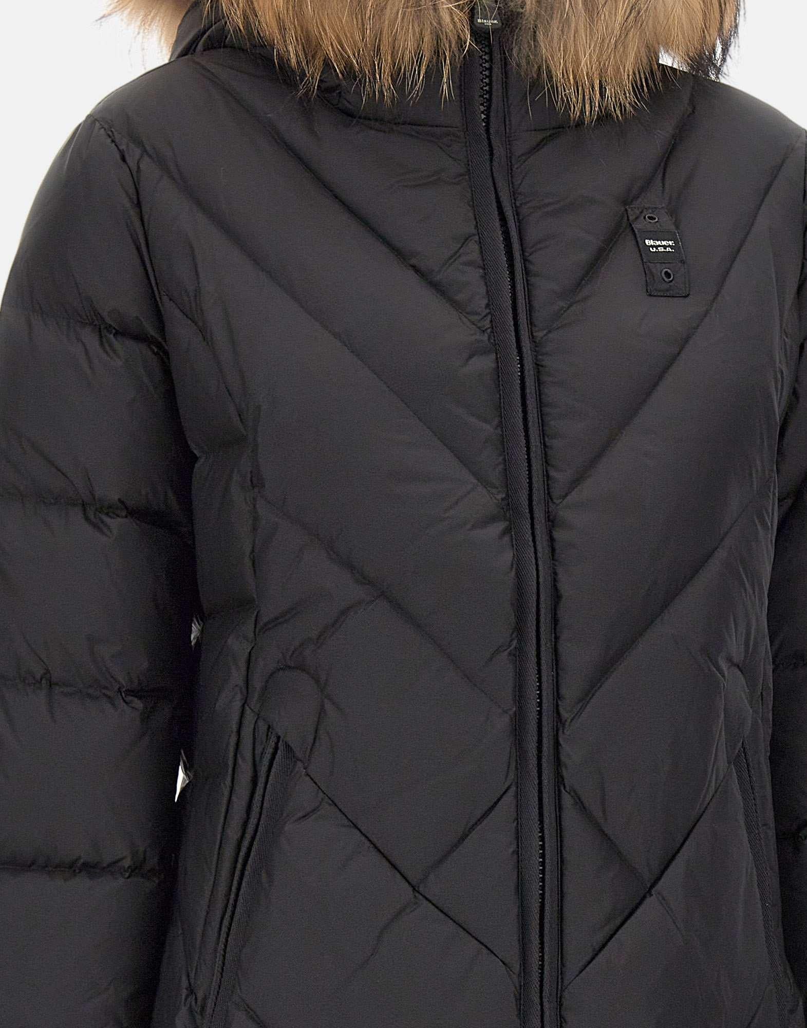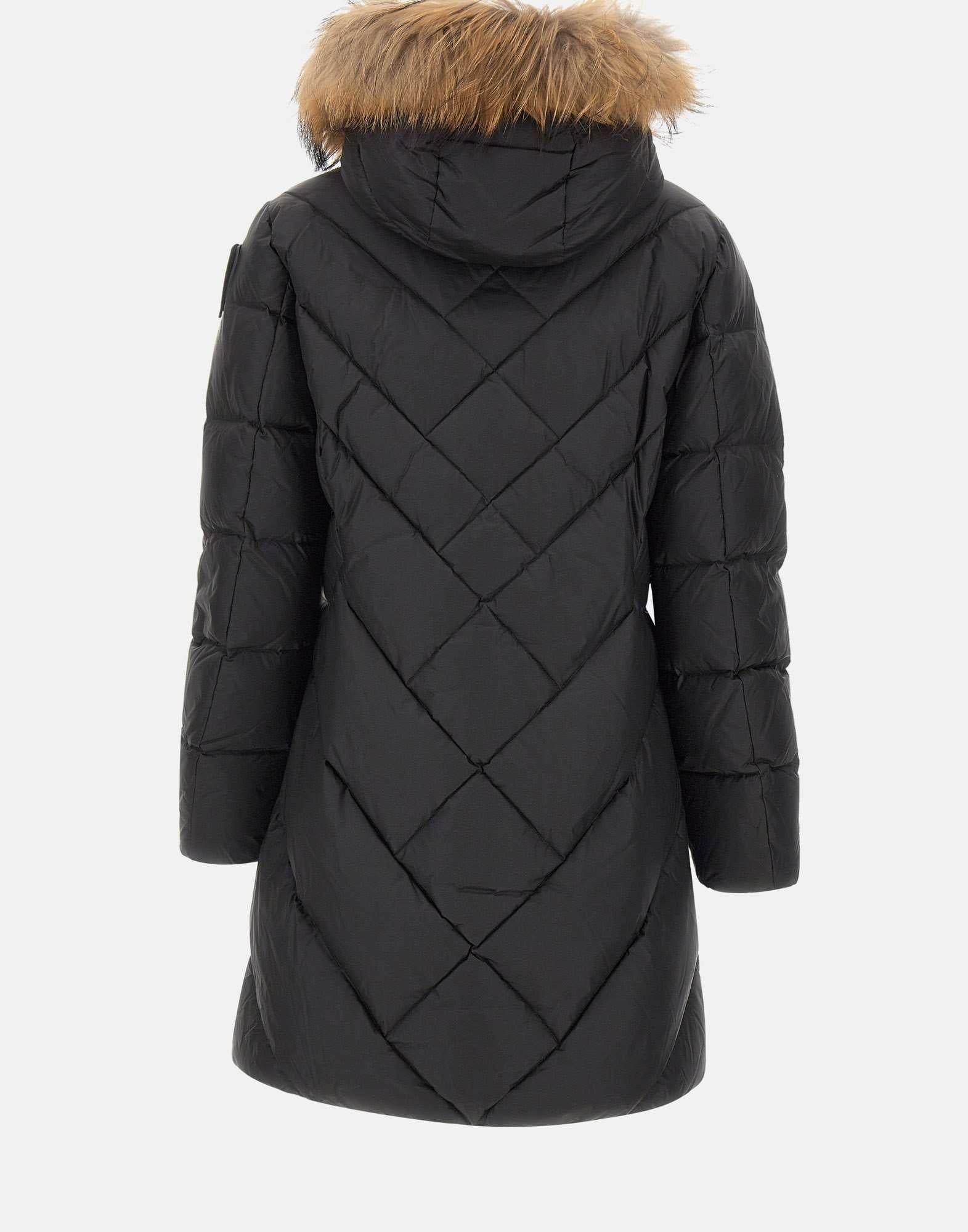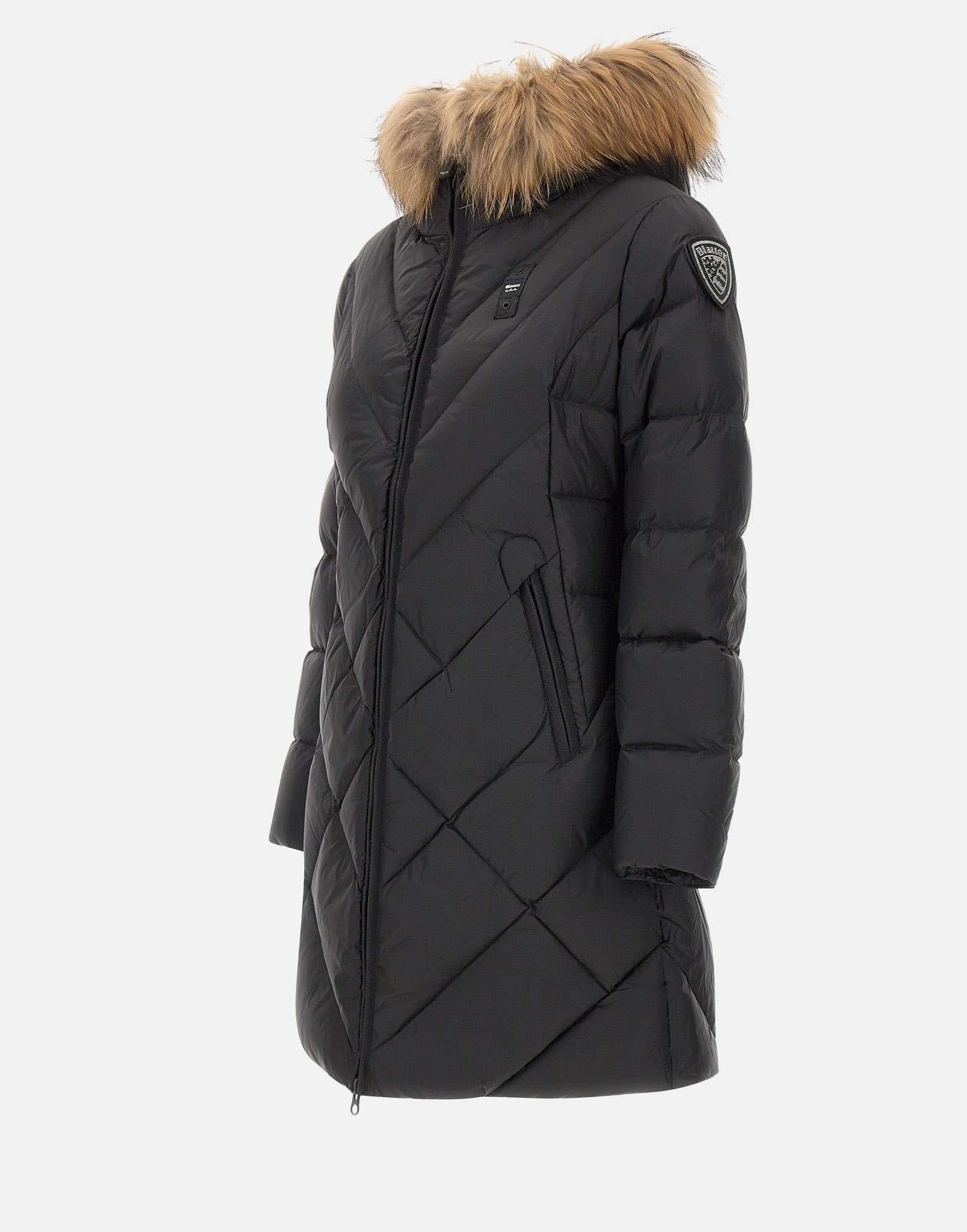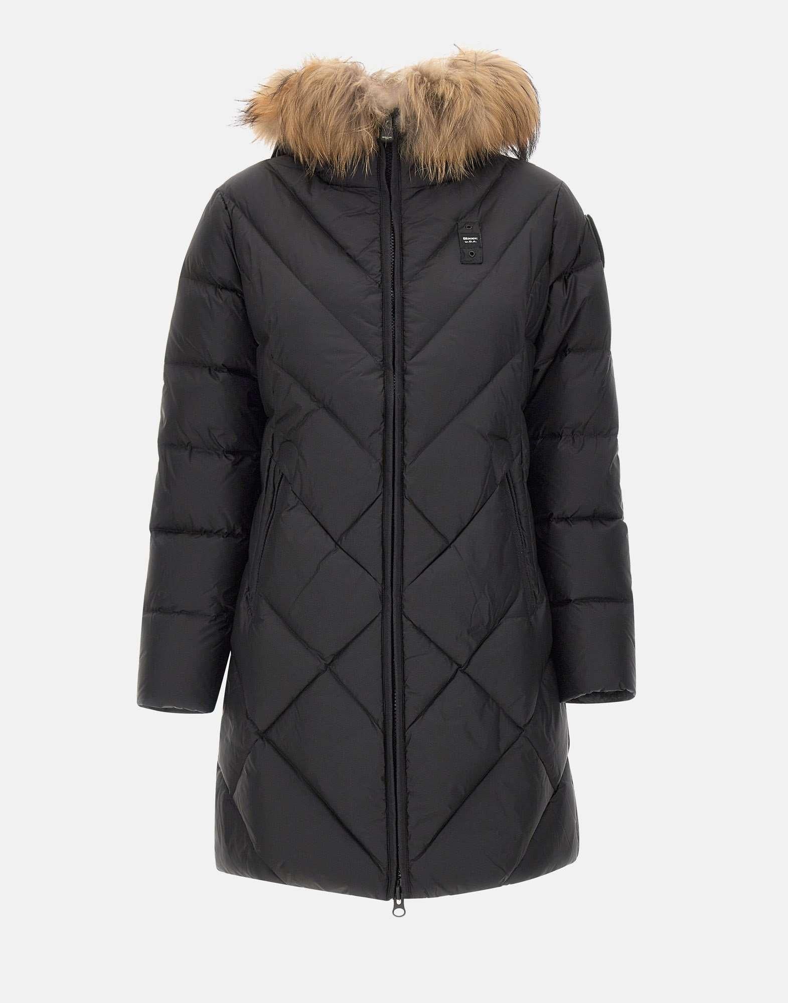 Blauer “Althea”, nero, unisce stile urbano e funzionalità. Realizzato con imbottitura in piuma doca, assicura calore e leggerezza ideali per la stagione invernale. Il design slim fit è definito dalla trapuntatura a spiga mista a quella orizzontale, dal cappuccio con bordo in vera pelliccia removibile, dalle tasche laterali con zip e dalla chiusura frontale con zip a due vie, completata da tasche interne pratiche e funzionali. I bordi nastrati, il passante Blauer cucito sul petto e lo scudo glitterato sulla manica sinistra arricchiscono un capo sofisticato, pensato per una femminilità contemporanea.