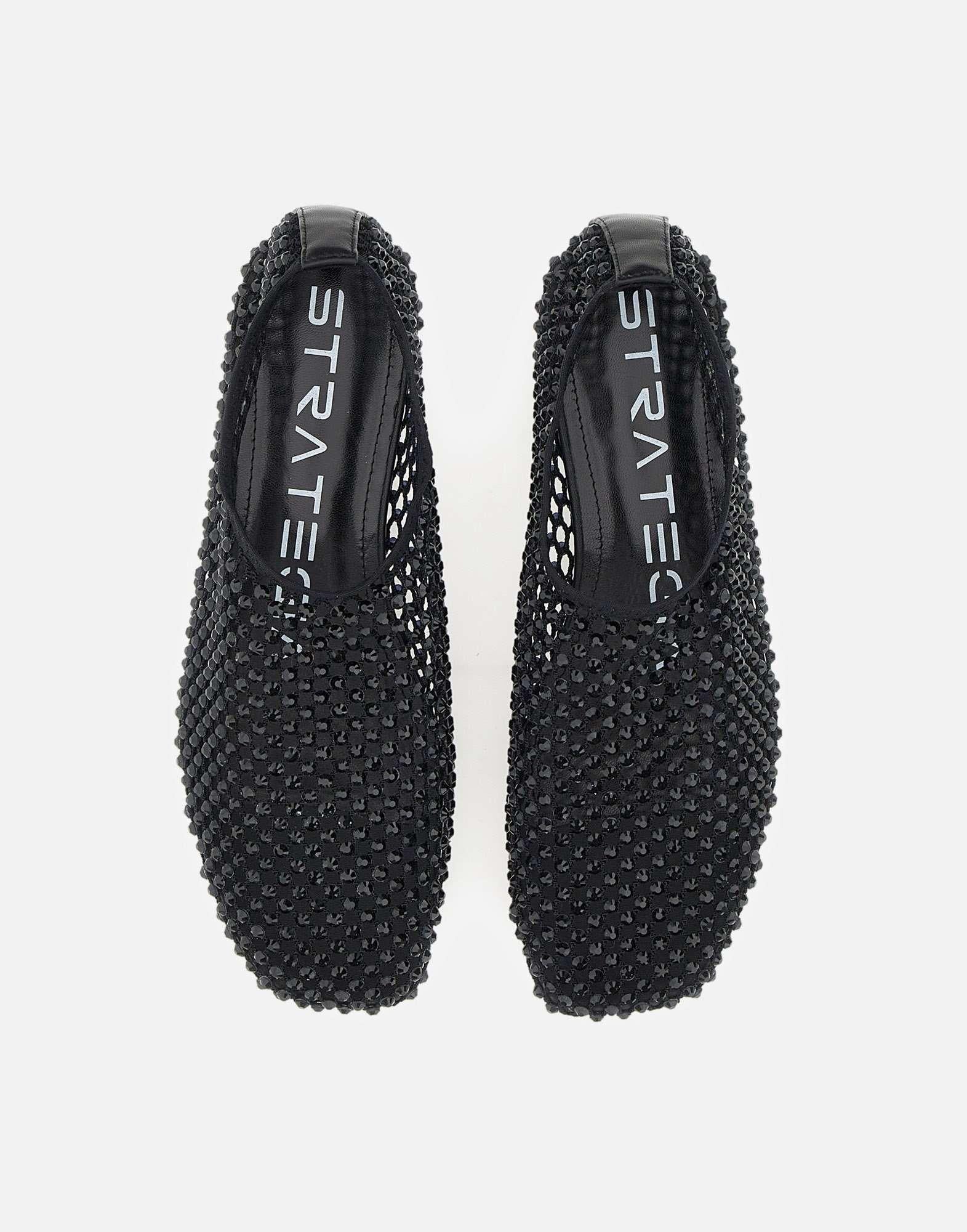 Ballerine Strategia “BijouxR11”, colore nero, tomaia in tessuto full strass, tacco 5mm, suola in cuoio, inserto in pelle sul retro, calzata regolare. Perfetta per una serata glamour o per aggiungere un tocco di lusso a un outfit da giorno. Made in Italy