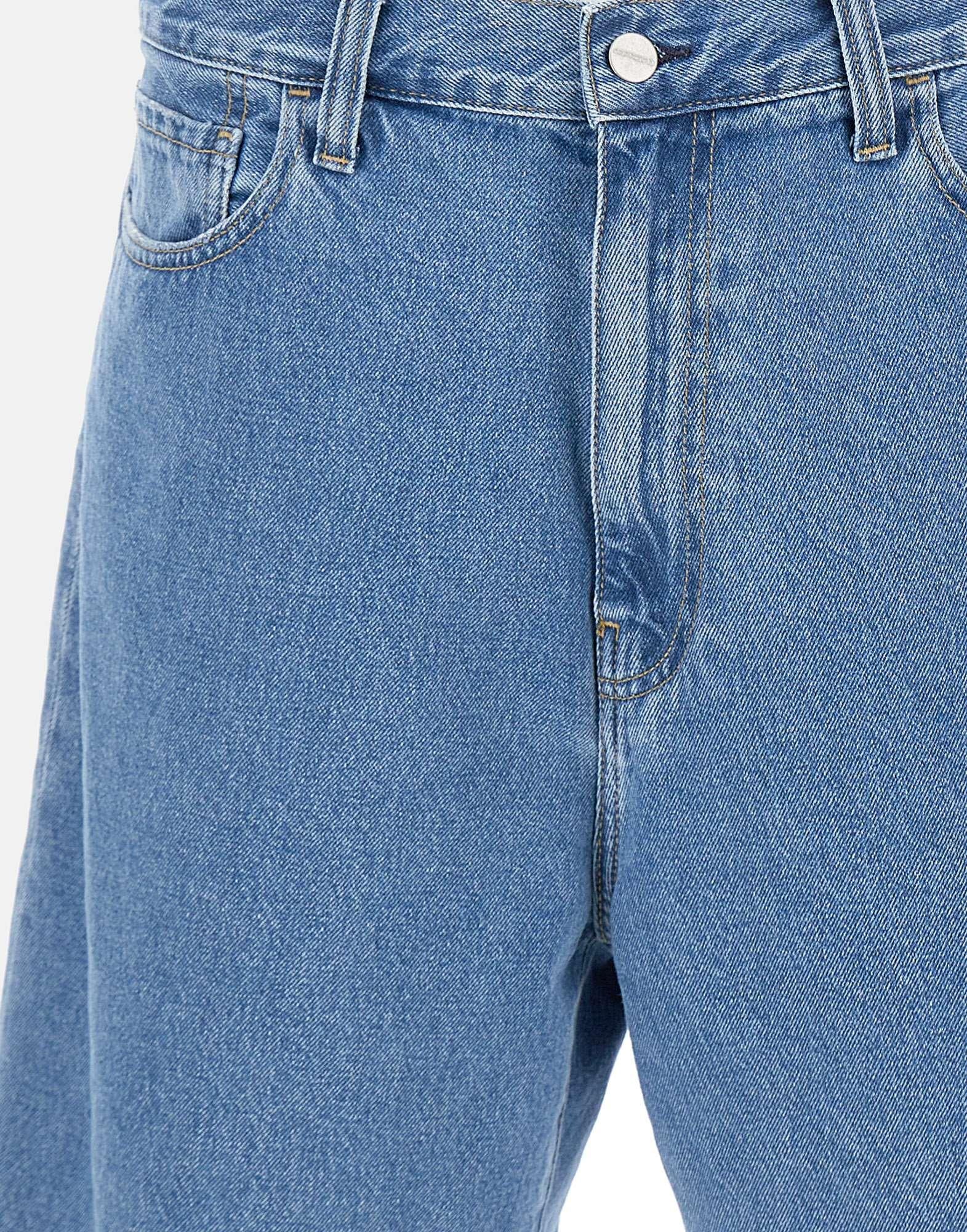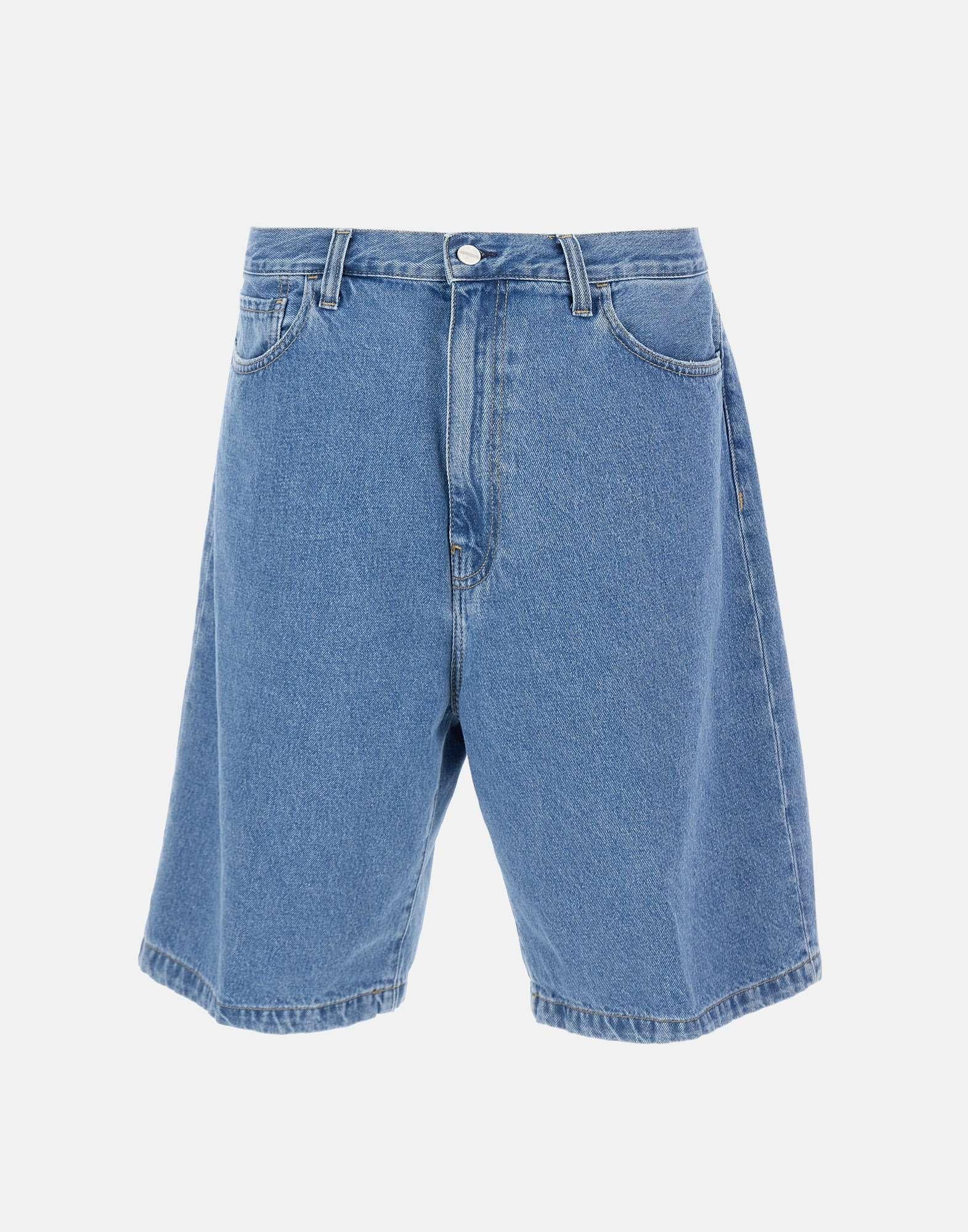 Bermuda uomo “Landon Short” Carhartt Wip, colore blu denim, cotone denim Robertson, modello cinque tasche, vita regolare con passanti per cintura, chiusura con bottone logato e zip, etichetta logo su retro. Loose Fit.