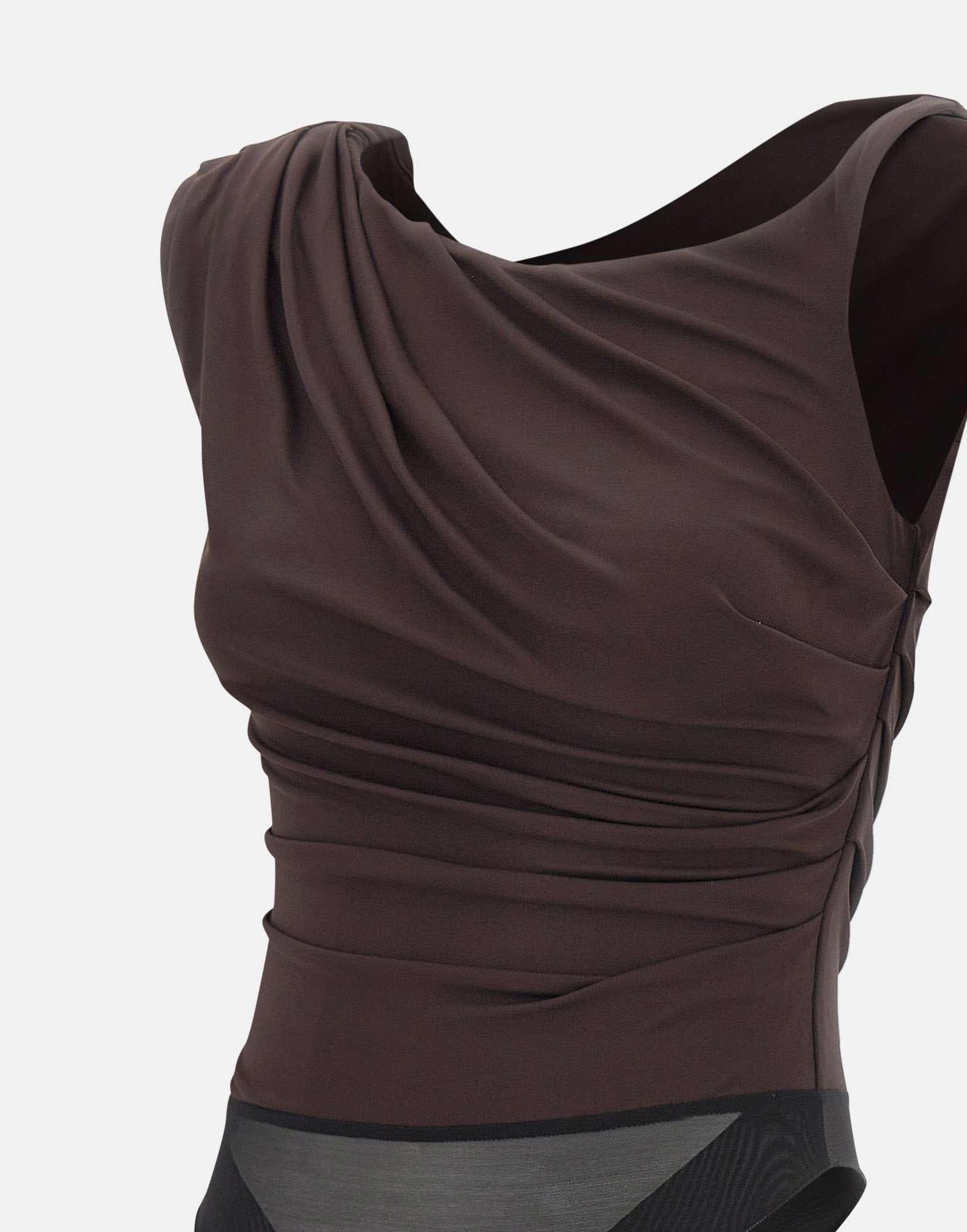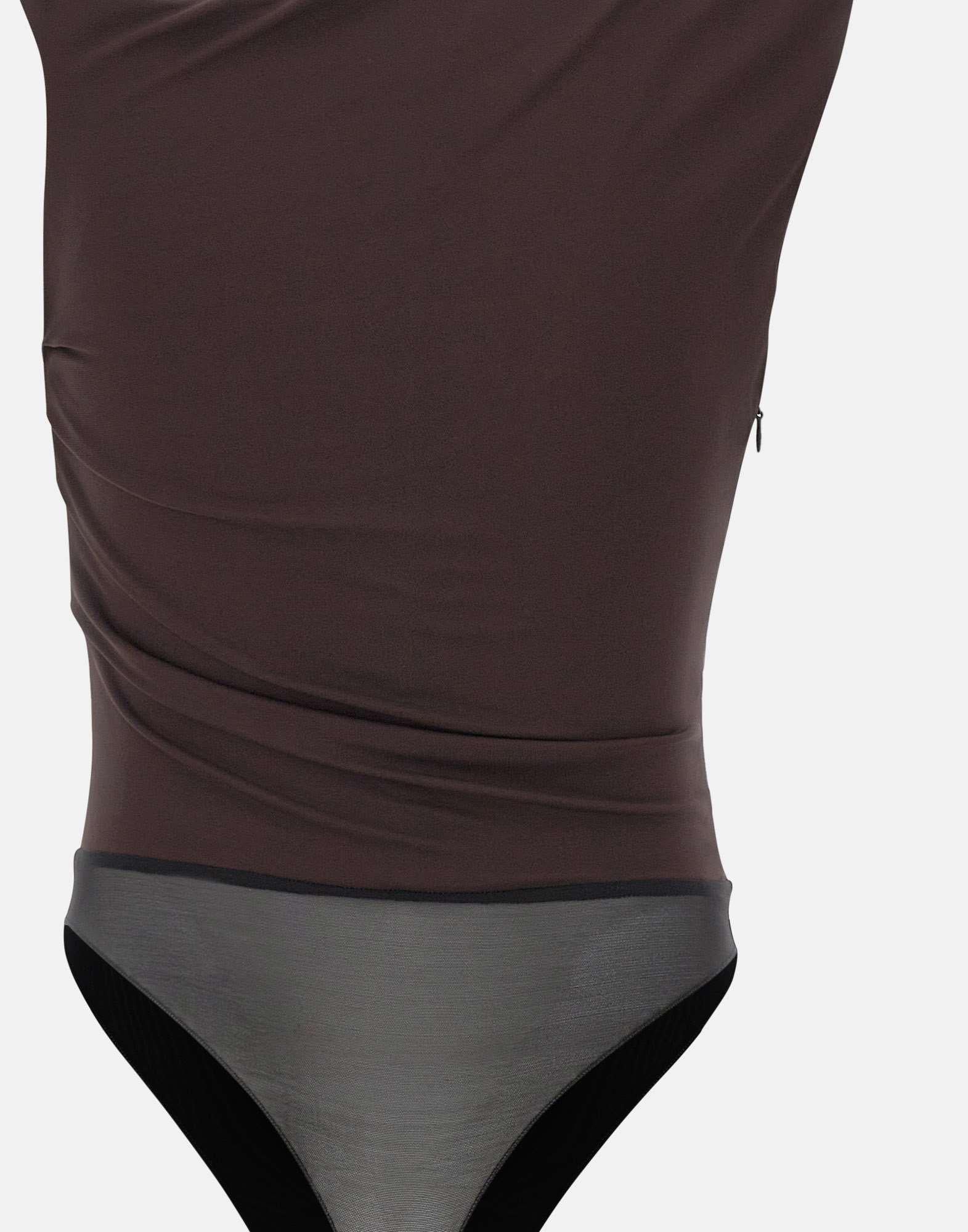 Body Elisabetta Franchi realizzato in jersey color marrone scuro, con vestibilità aderente per valorizzare la silhouette. Il design monospalla è definito da una spallina imbottita e strutturata, chiusa dalla mezzaluna in metallo dorato che aggiunge una nota luminosa e distintiva. I drappeggi creano volume e definizione, dando carattere al capo senza rinunciare a una linea raffinata. Slip in tulle e chiusura con zip invisibile laterale completano il modello con comfort e pulizia estetica. Made in Italy.
