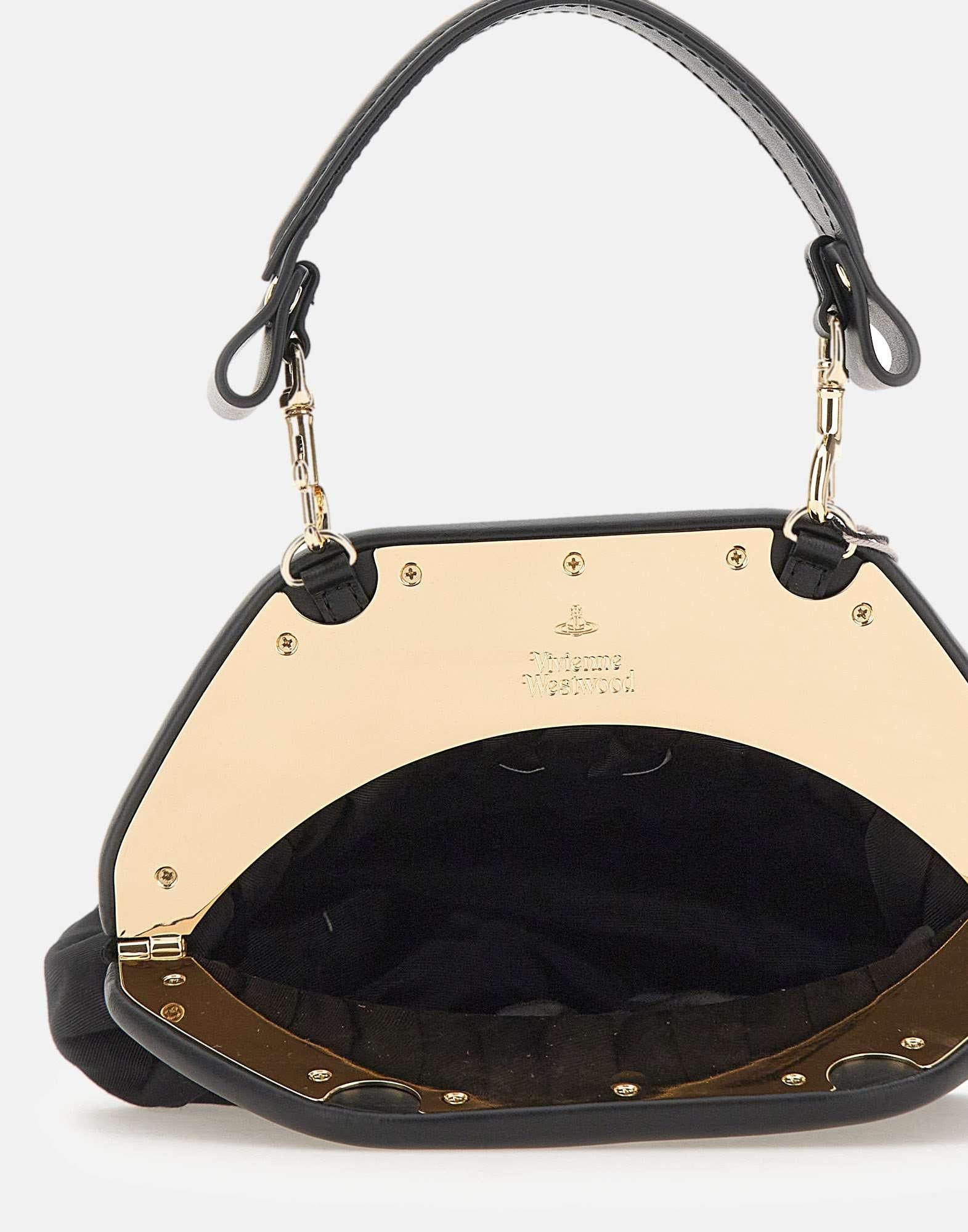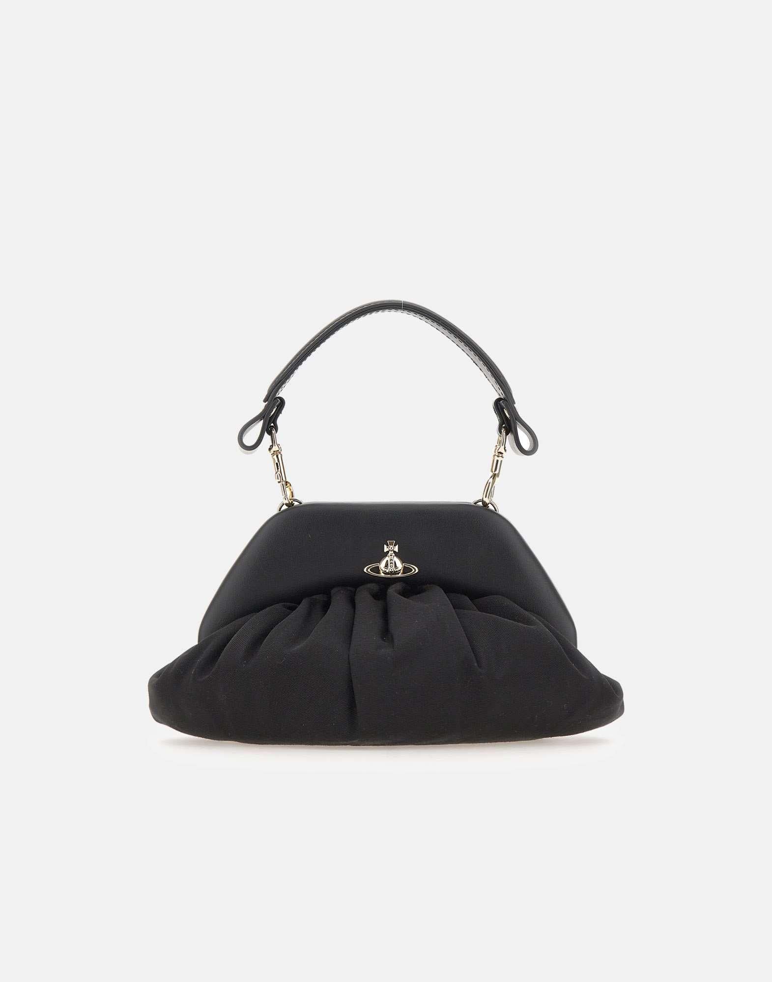 Borsa a mano donna Vivienne Westwood “Brooke Clutch” realizzata in morbida viscosa nera, ispirata alle borse con arricciatura degli anni ’40 per richiamare la storia degli accessori femminili del secondo dopoguerra. Il design è caratterizzato da pieghe decorative che definiscono la silhouette e aggiungono un tocco raffinato. Dotata di piccolo manico removibile e tracolla removibile per diverse opzioni di portabilità, si adatta sia a look da sera sia a styling più contemporanei. Sulla parte superiore rigida spicca il motivo Orb in metallo al centro, firma iconica dell’estetica Vivienne Westwood. Inclusa dust bag. Dimensioni: 21x20x3 cm.