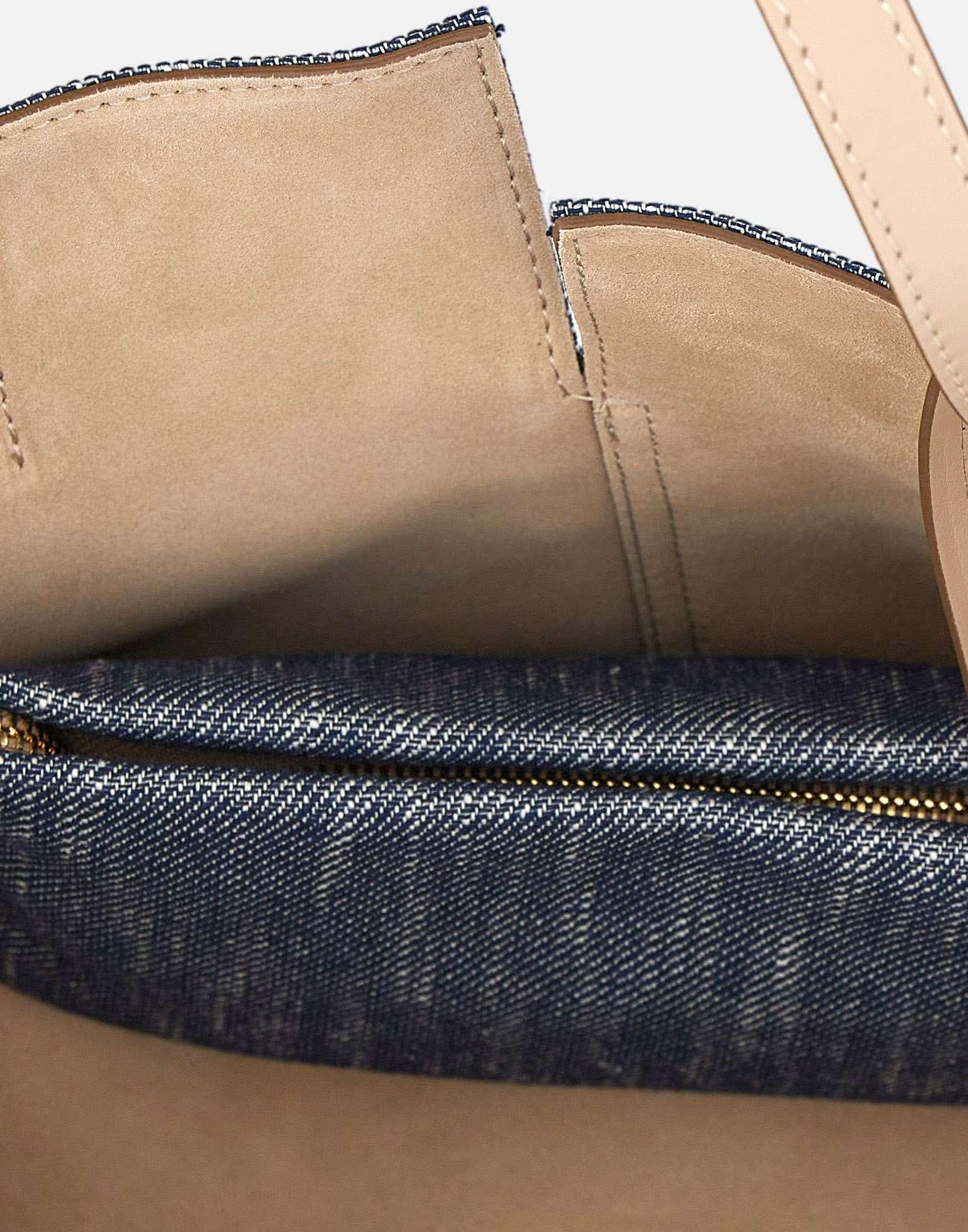 Borsa a spalla donna Gianni Chiarini “Maia” realizzata in tela di cotone effetto denim blu, con inserti in pelle liscia beige, utilizzati per i due manici e per il patch logo applicato sul fronte. Il design è valorizzato dallo spacco centrale sull’orlo di entrambi i lati, dettaglio che dona movimento e leggerezza alla silhouette. L’interno è completato da una pochette coordinata con chiusura a zip, pensata per una gestione pratica degli oggetti. Borsa reversibile, presenta una fodera in pelle scamosciata beige. Un accessorio elegante e contemporaneo, ideale per accompagnare i look quotidiani con naturale raffinatezza. Made in Italy. Dimensioni: 32x26x12 cm.