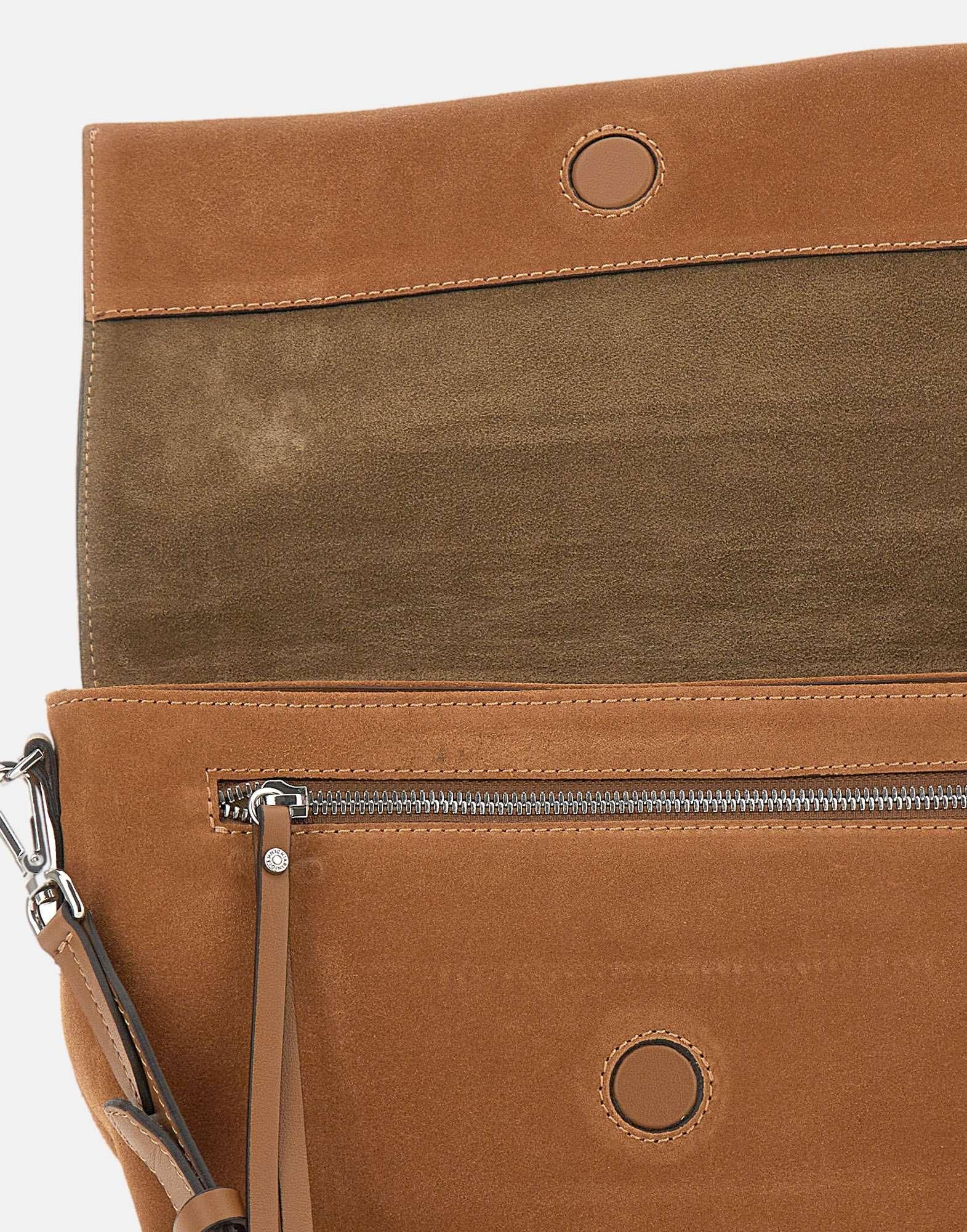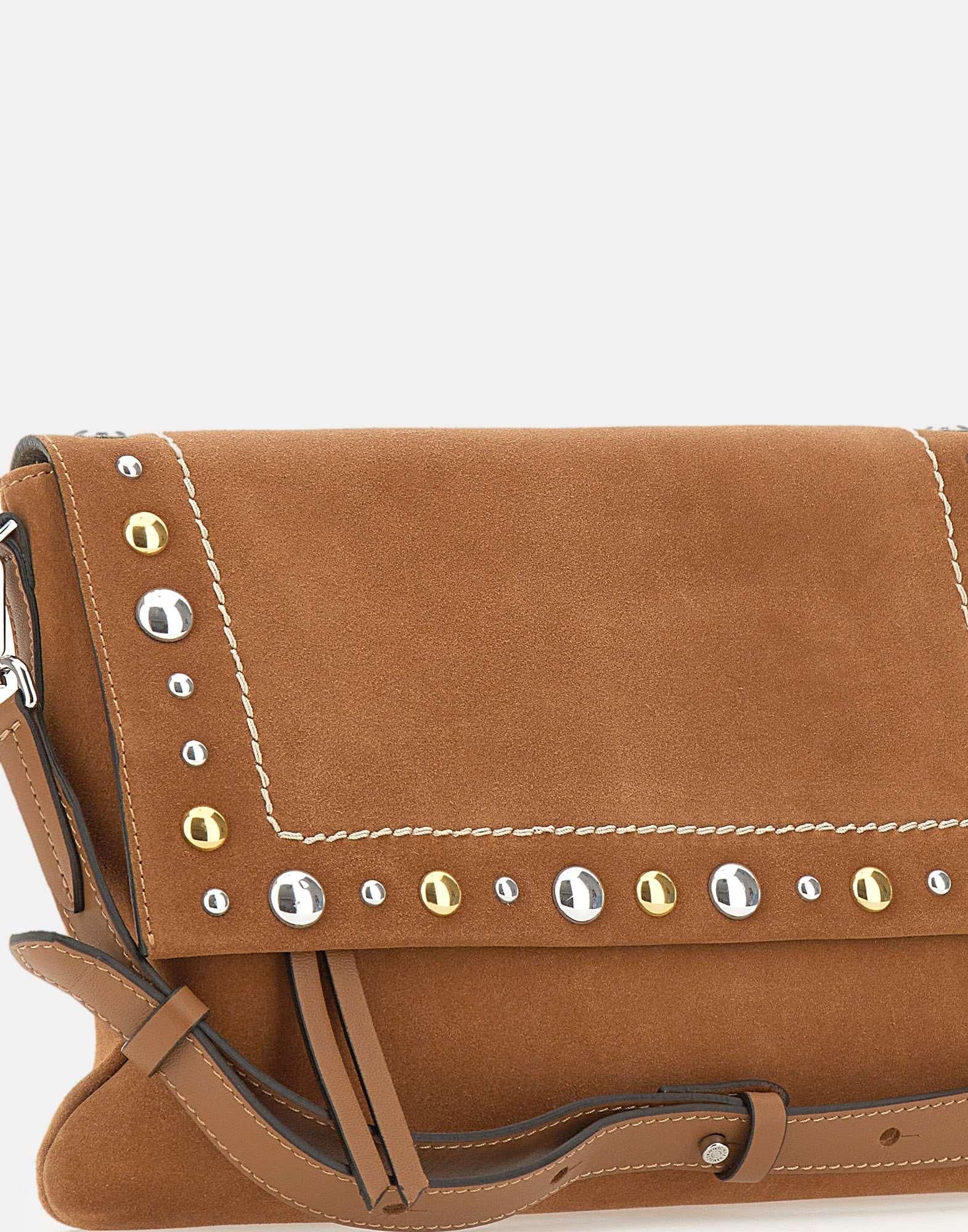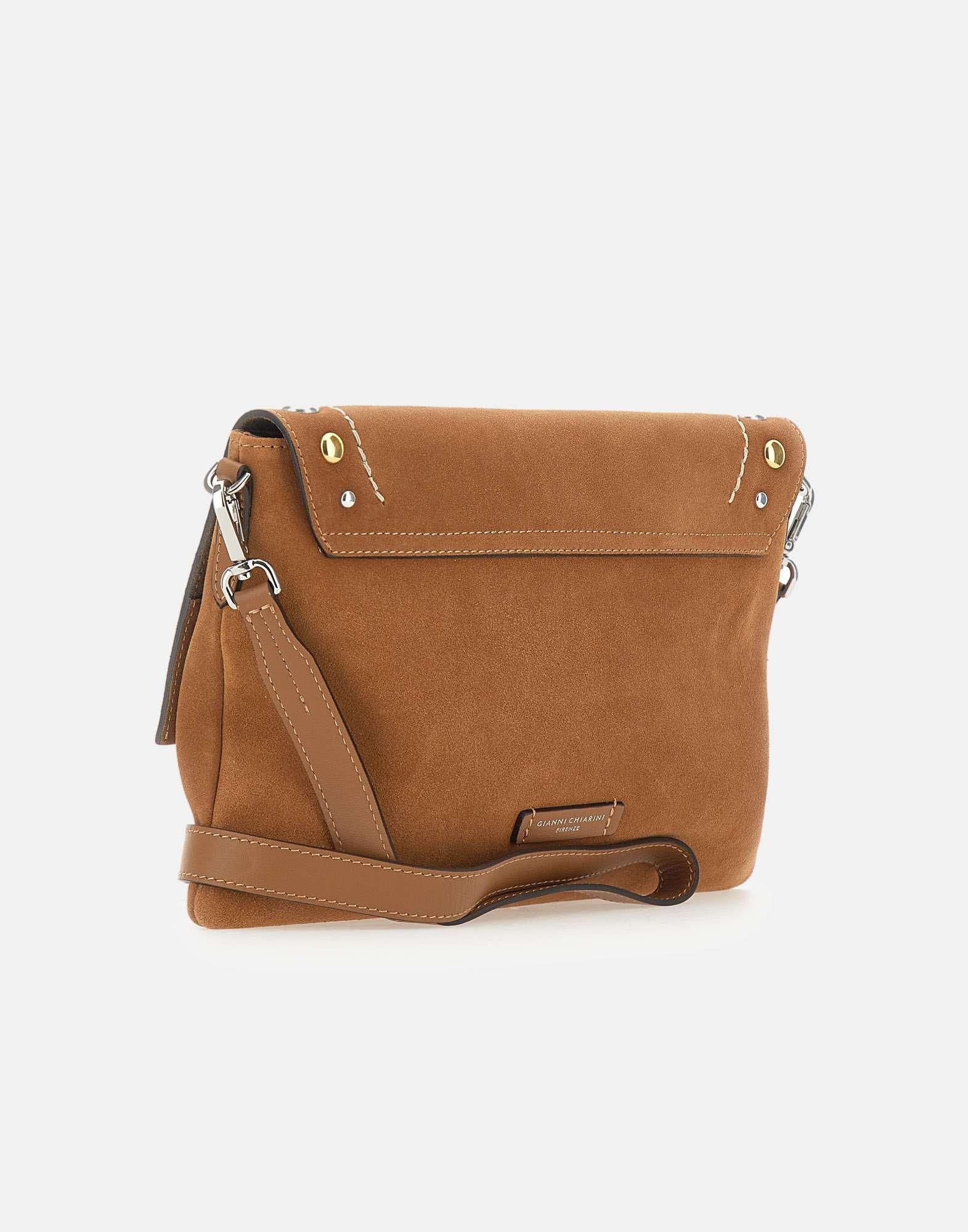 Borsa a tracolla donna Gianni Chairini “Elisa” realizzata in pelle scamosciata color caramello, con cuciture a cotrasto e borchie oro e argento sulla patta che illuminano il design. La chiusura con patta e bottone magnetico è abbinata a una tasca con zip sotto la patta, ideale per organizzare gli essenziali. Dotata di tracolla in pelle coordinata regolabile e removibile per indossarla anche crossbody. Sul retro è presente un patch logo in pelle. All’interno trovi una tasca applicata e una tasca con zip. Include dust bag. Made in Italy. Dimensioni: 30x20x3 cm.