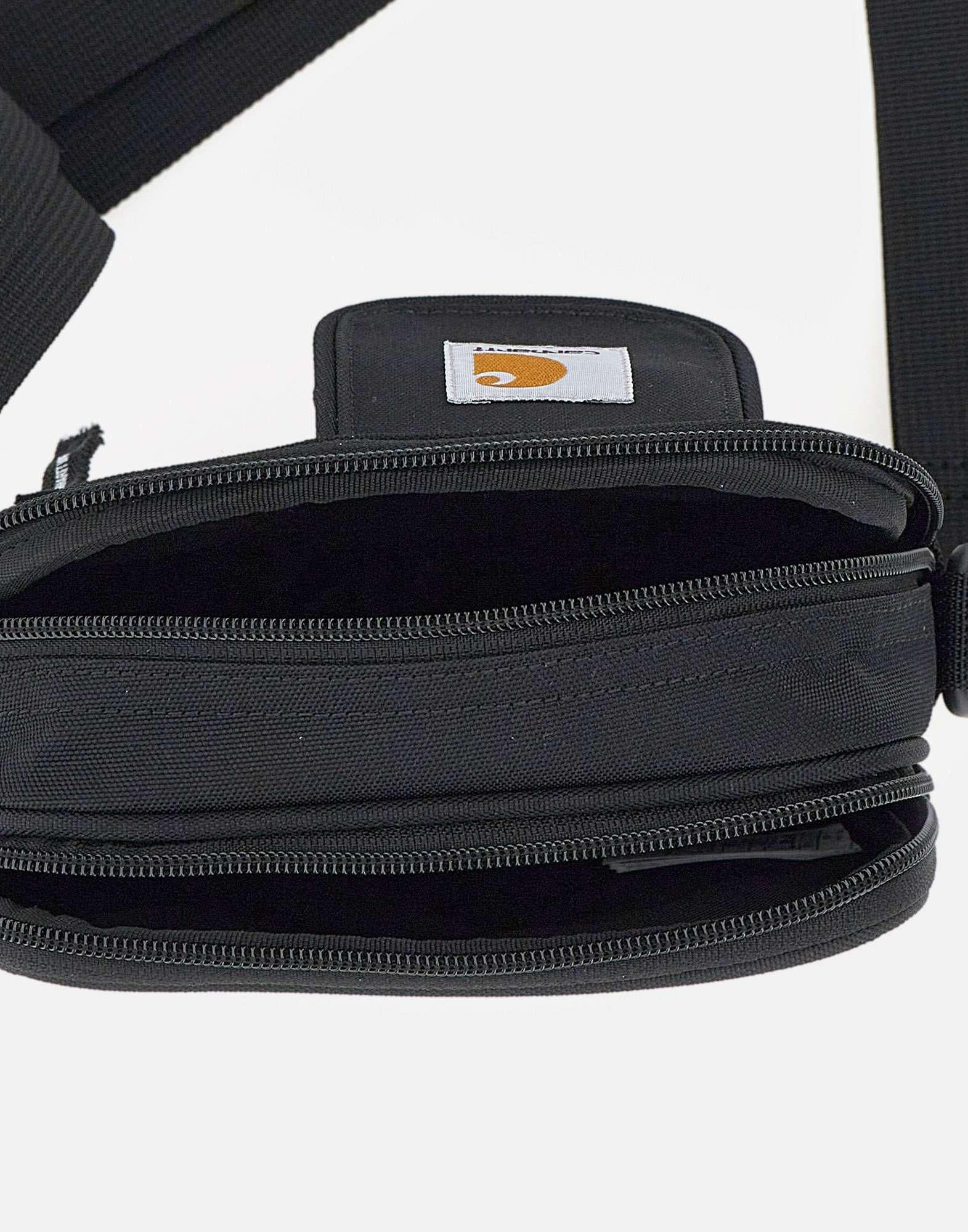 Borsa a tracolla uomo Carhartt realizzata in tela misto poliestere riciclato color nero, impermeabile e pensata per un uso quotidiano pratico. Totalmente foderata, presenta due aperture principali richiudibili con zip per organizzare al meglio l’essenziale. E’ dotata di una tasca con Velcro con patch logo e di una piccola tasca anteriore con zip per un accesso rapido. Tracolla in tessuto regolabile e removibile. Dimensioni: 17×16,5×6 cm.