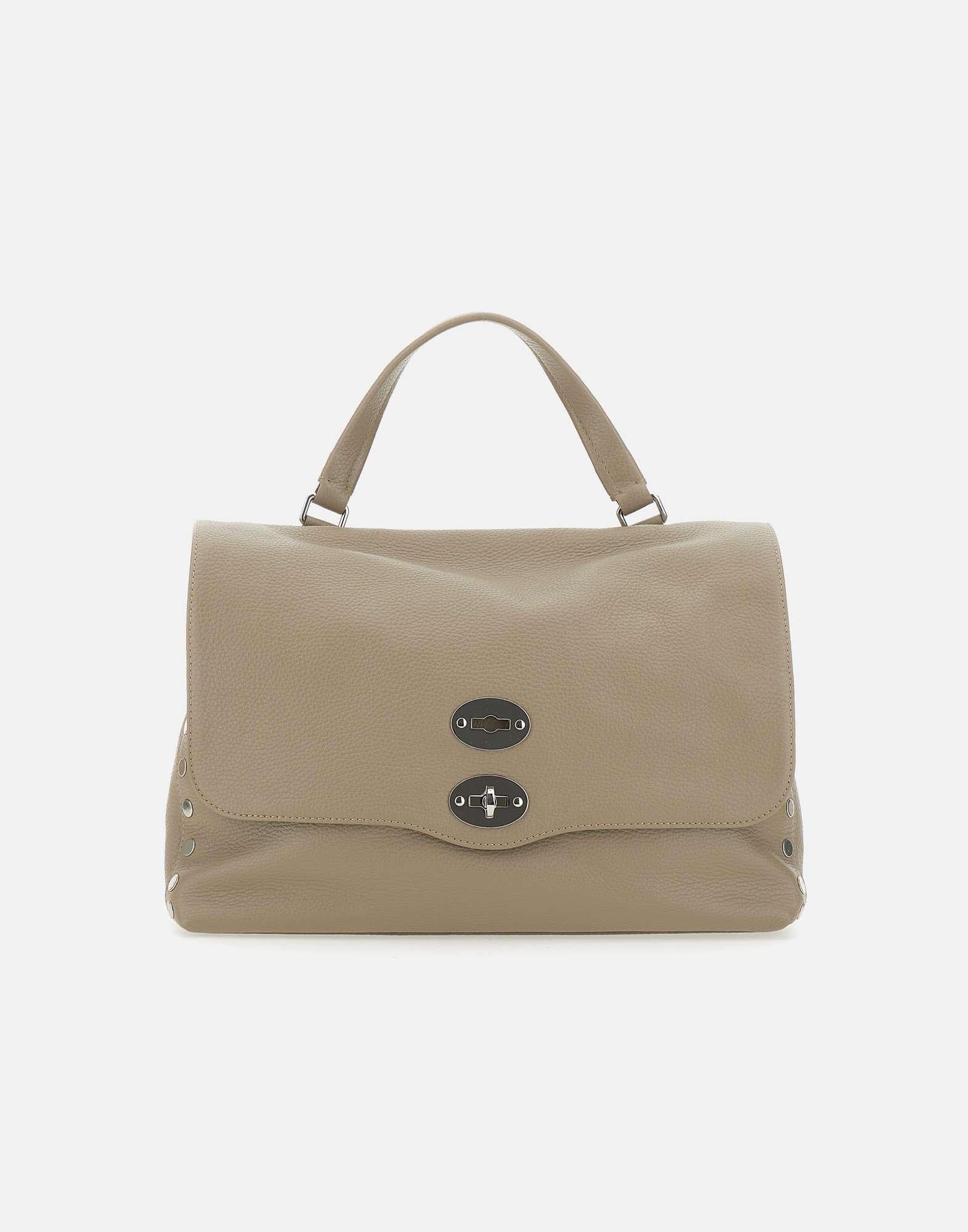 Borsa a tracolla Zanellato “Postina Daily S” in pelle, modello iconico della maison, colore grigio fango in pelle, classica grana dollaro regolare, soft e leggermente lucida, tracolla regolabile e removibile 90 cm circa, un manico superiore, chiusura con doppio meccanismo a girella, finiture metalliche silver lucido, dettaglio borchie laterali, piedini di sostegno alla base, tasca interna a bustina e tasca con cerniera, fodera a contrasto color cammello. Made in Italy.