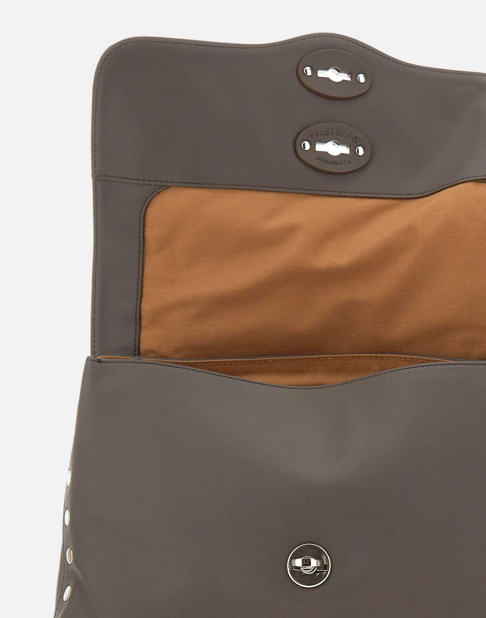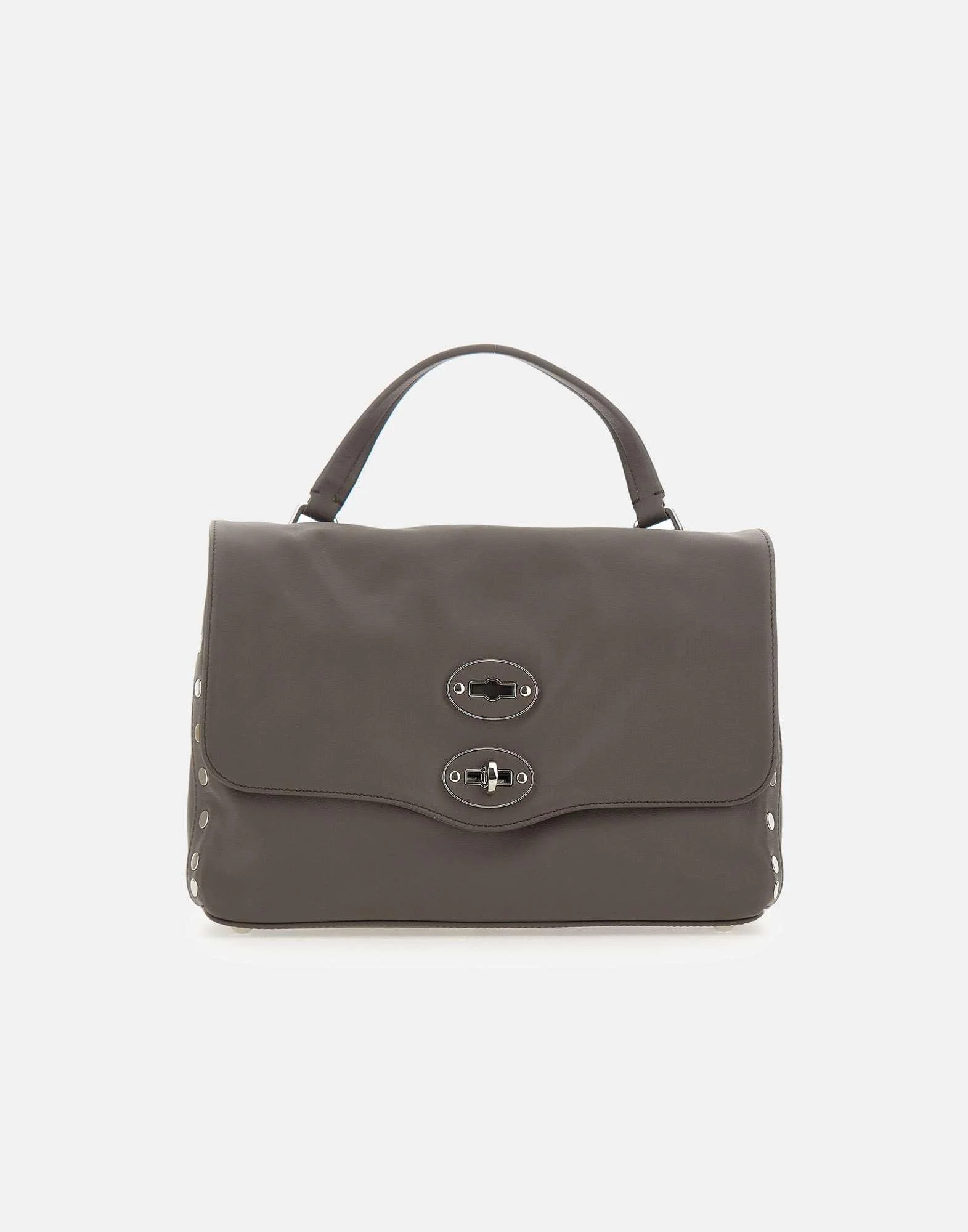 Borsa a mano Zanellato “Postina Saeta Small” realizzata in pelle color marrone scuro, dal design iconico e funzionale. Il modello presenta manico superiore e tracolla regolabile e removibile di circa 80 cm, per una portabilita versatile. La chiusura con meccanismo metallico a girella e le finiture silver lucido definiscono lestetica riconoscibile del brand. Linterno in tessuto e organizzato in due scomparti con tasca interna con zip, pensati per una gestione pratica degli oggetti personali. Completano il design le borchiette decorative e i piedini metallici al fondo, che garantiscono protezione e stabilita. Dimensioni: 30 x 20 x 12 cm. Dustbag inclusa. Made in Italy.