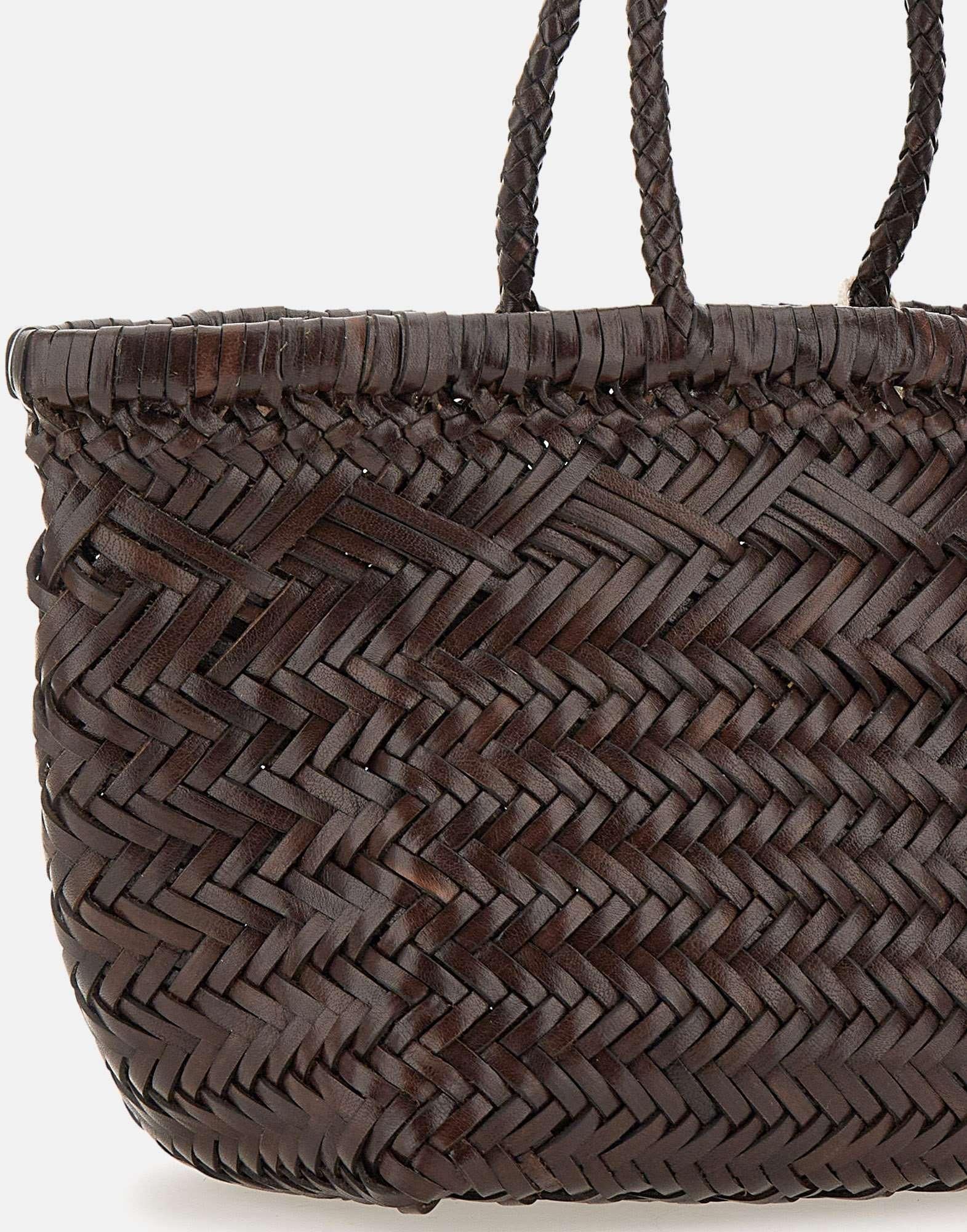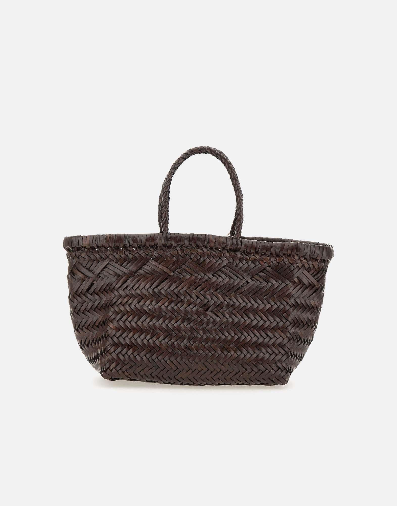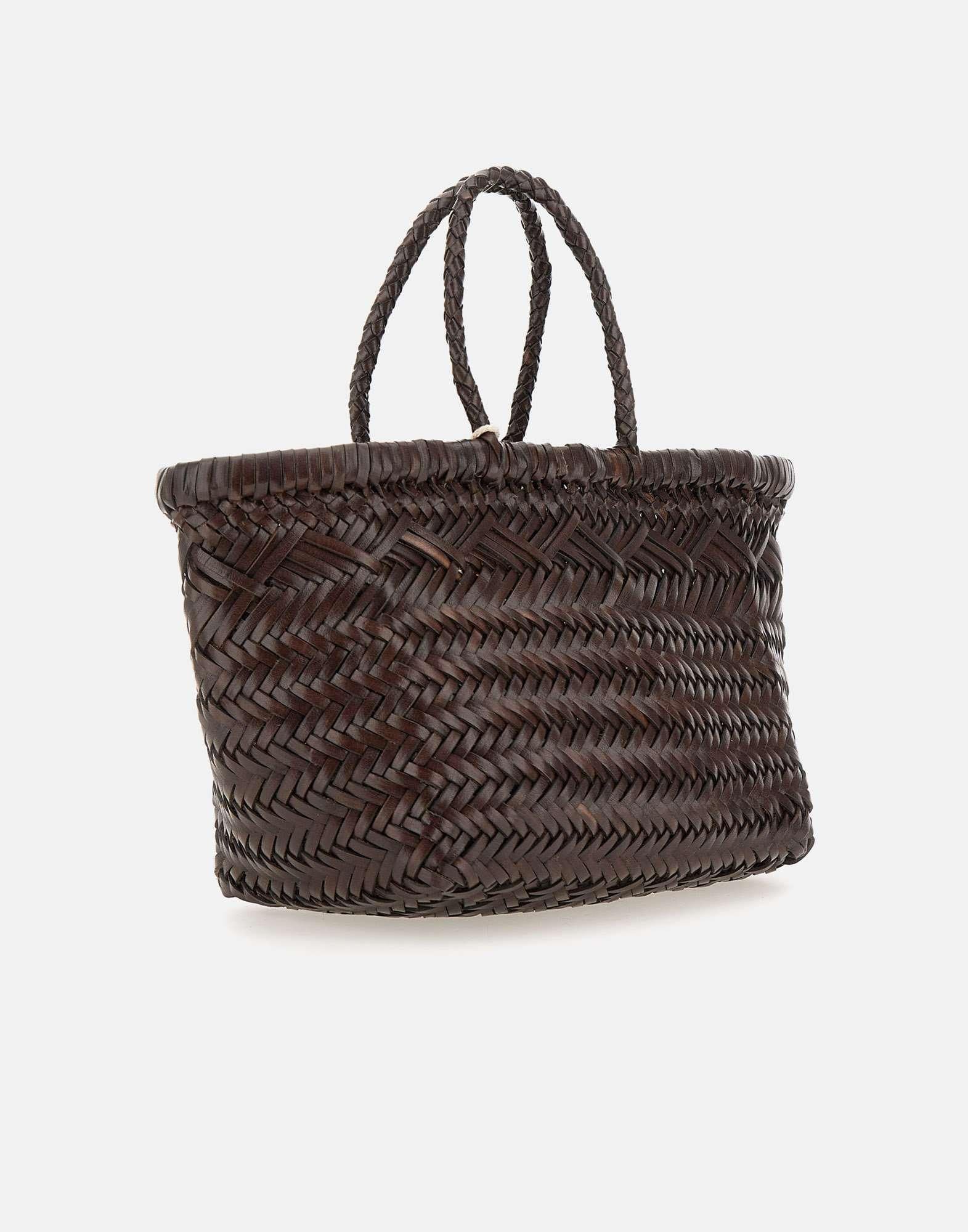 Borsa a mano Dragon Diffusion “triple jump small” in pelle di vitello, cioccolato, lavorazione ad intreccio interamente a mano trama diagonale chevron ,m doppio manico superiore, sfoderata, medaglietta di St Cristoforo protettore dei viaggiatori all’interno. Misure:altezza 20cm, lunghezza 23cm alla base, profondità 14cm.