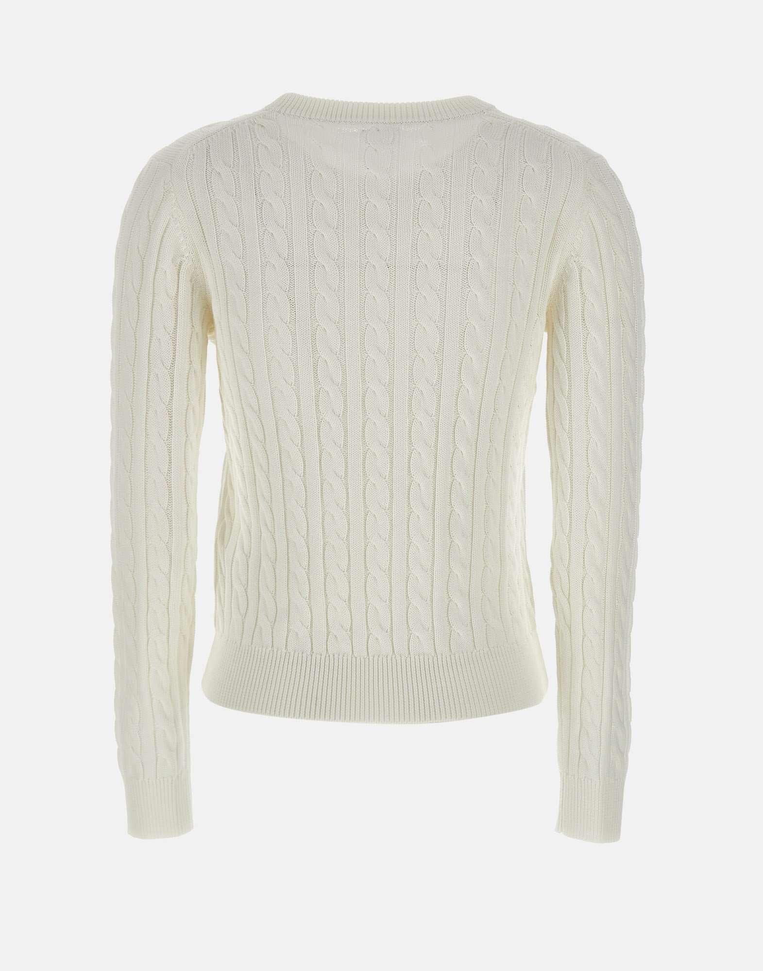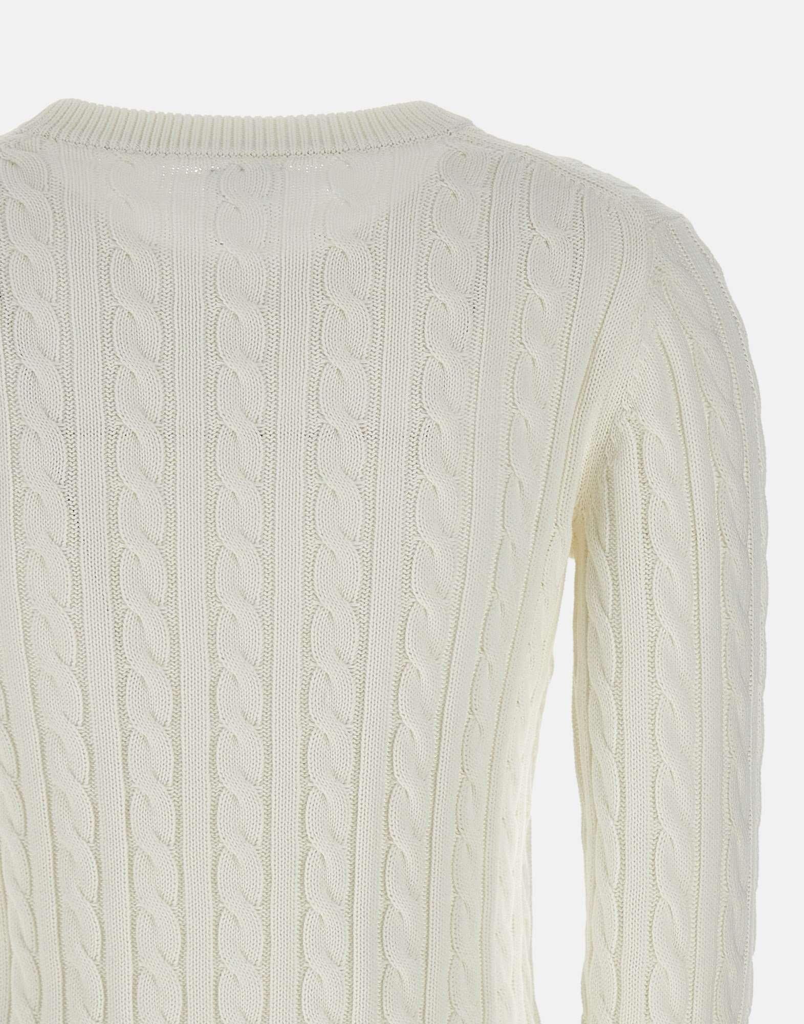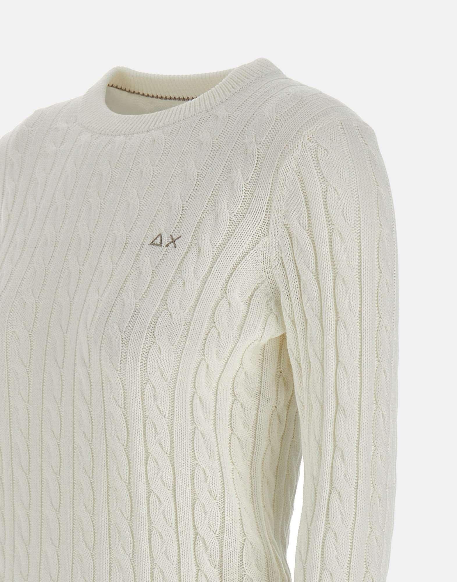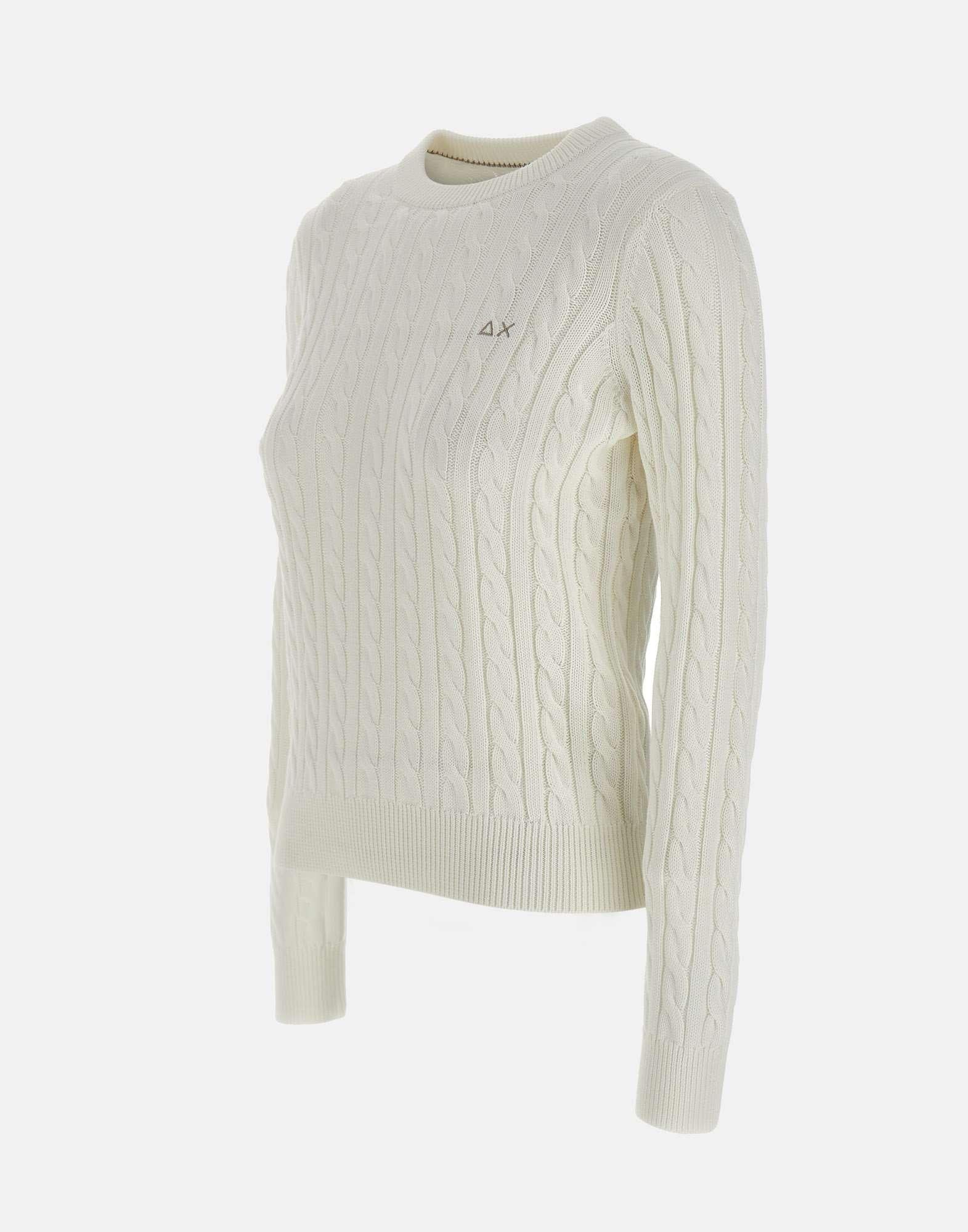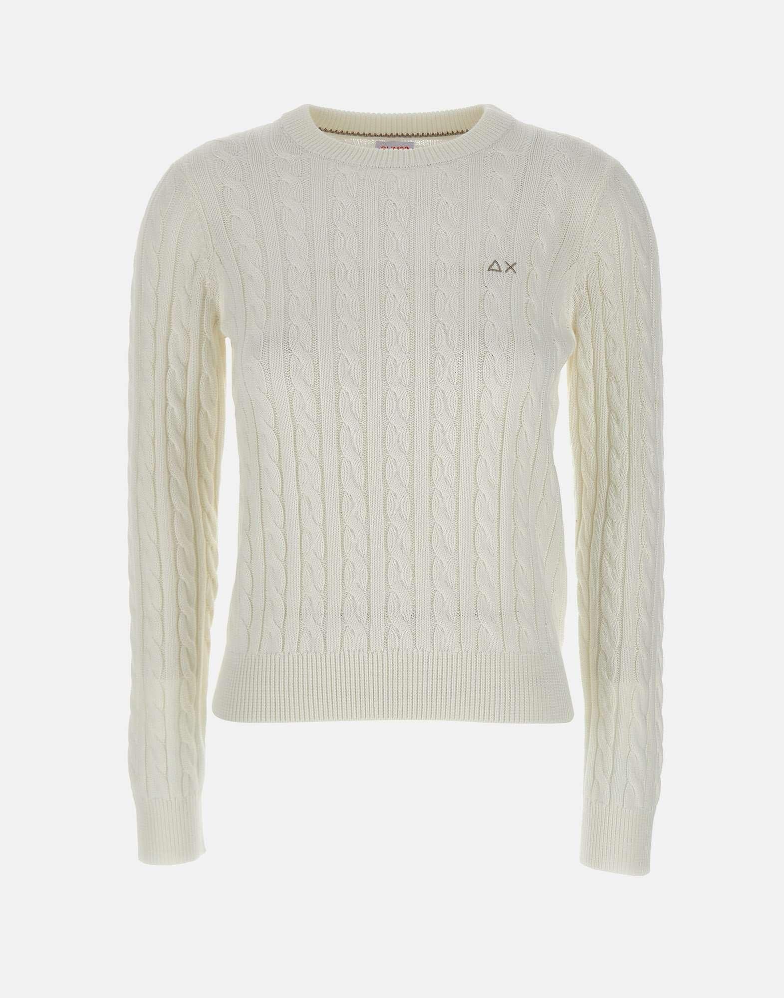 “Cable knit sweater” Sun68 donna, colore bianco, in cotone, trama a trecce, maniche lunghe, girocollo, bordi a costine, logo a ricamo sul petto, regular fit