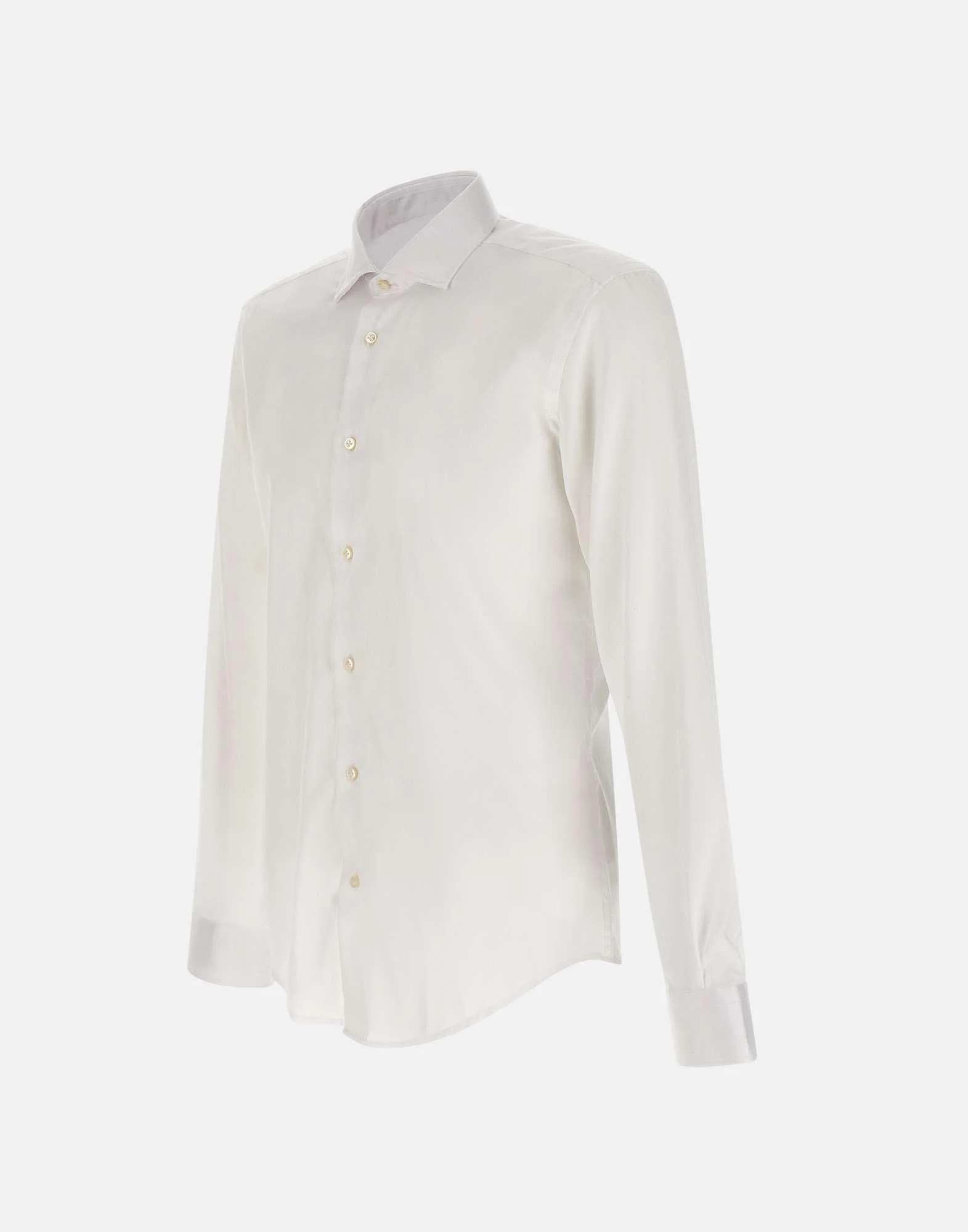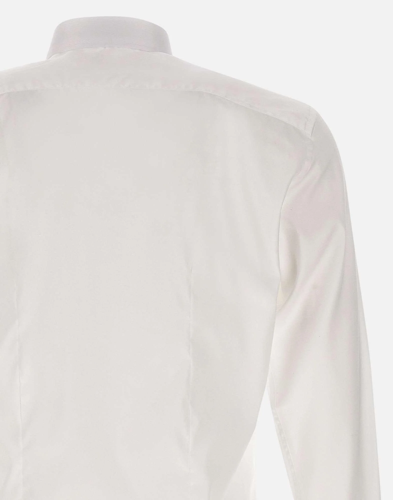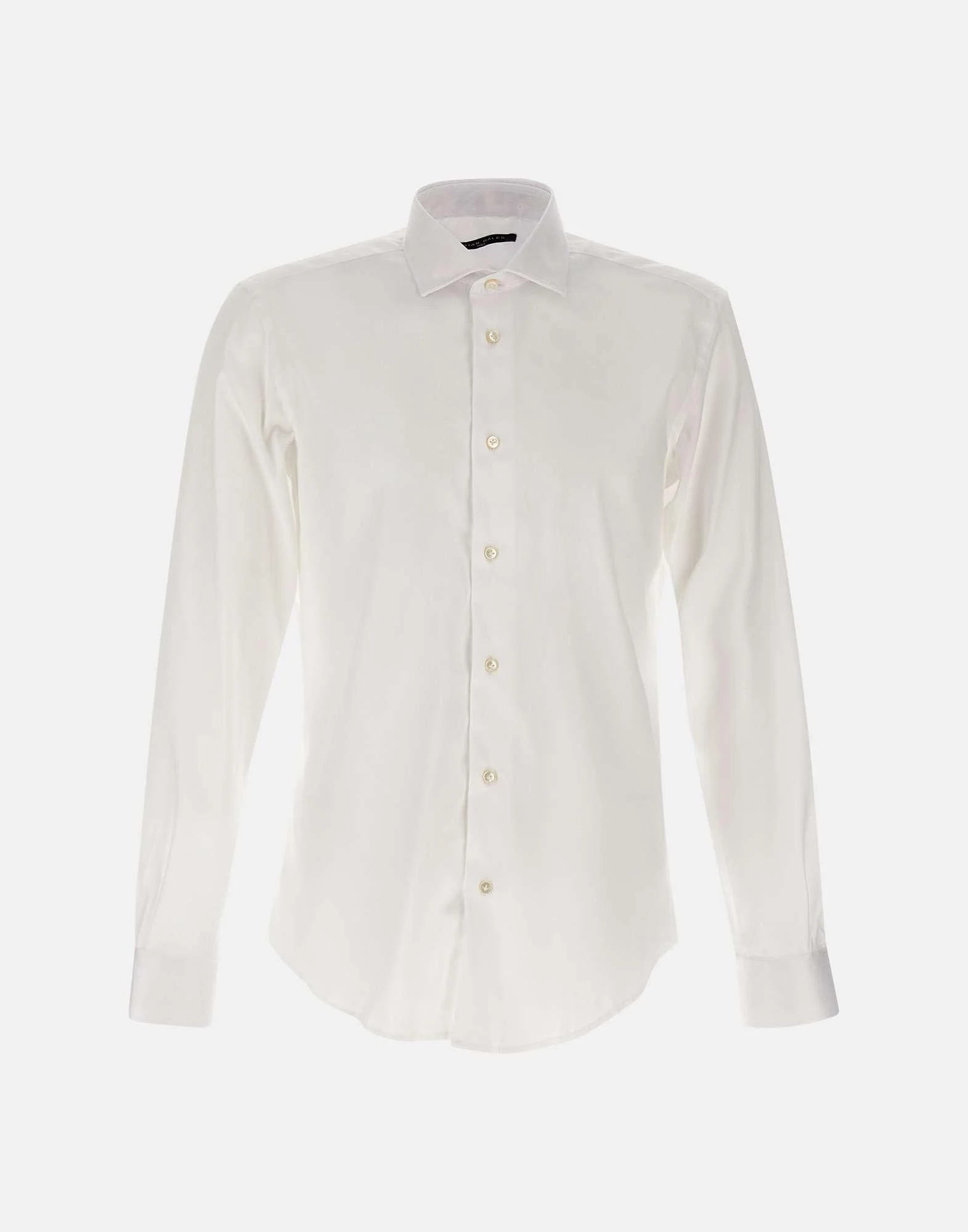 Camicia uomo Brian Dales in cotone, bianca, collo classico, chiusura con bottoni effetto madreperla, due bottoni sui polsini doppiati, fondo stondato, tessuto stretch, slim fit. Made in Italy.