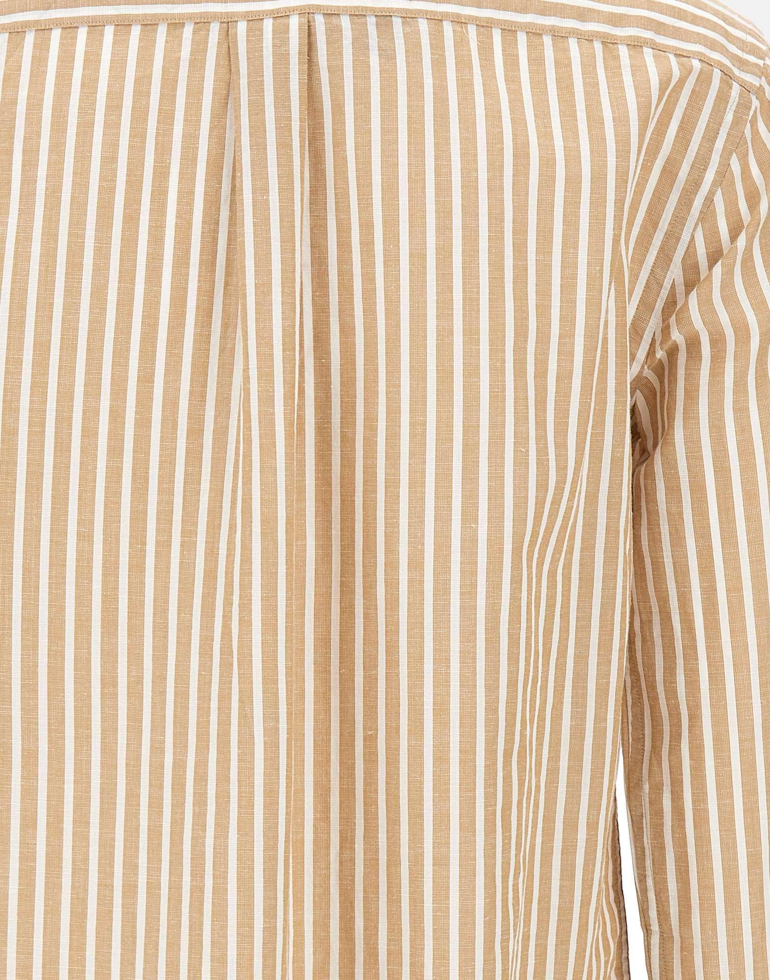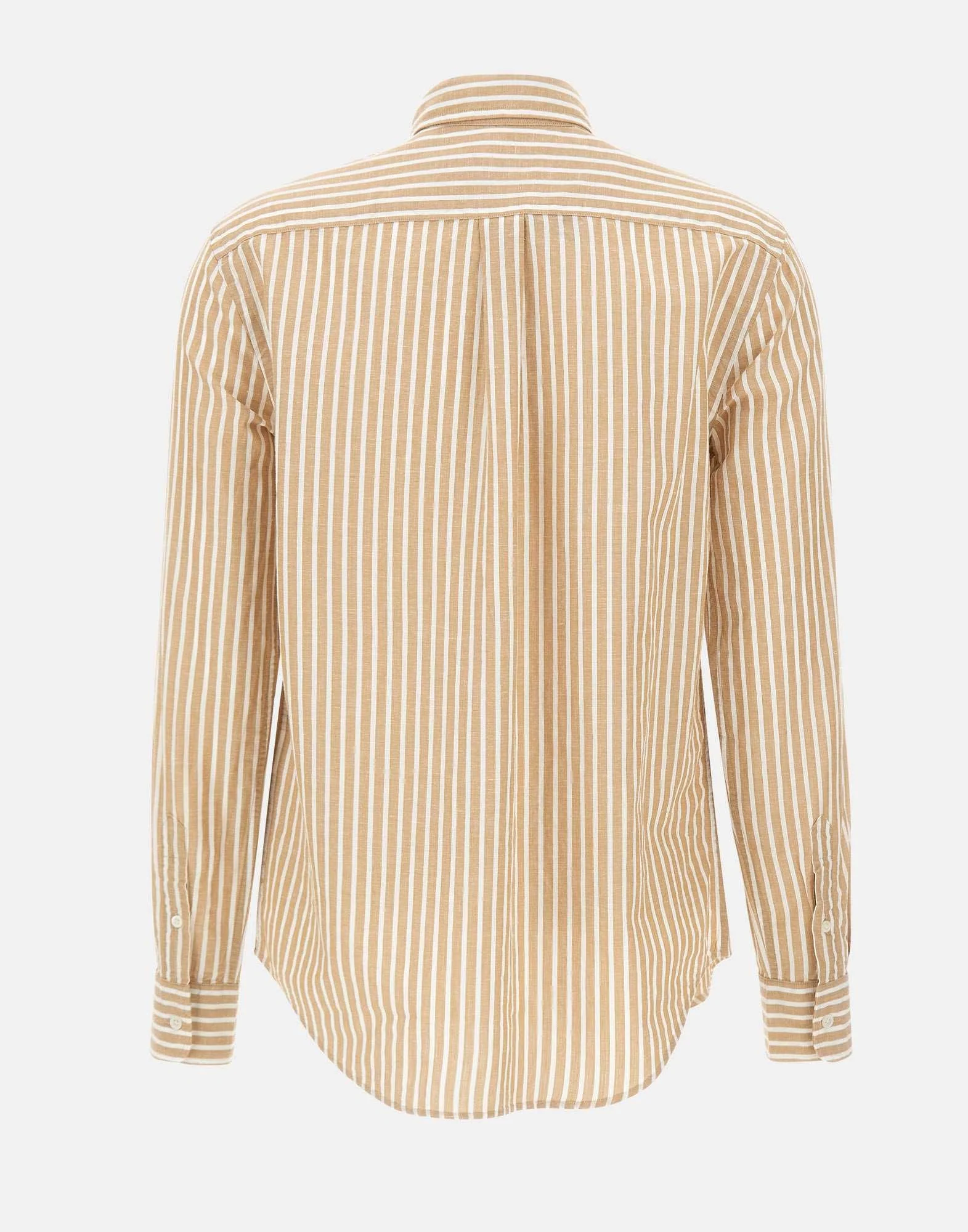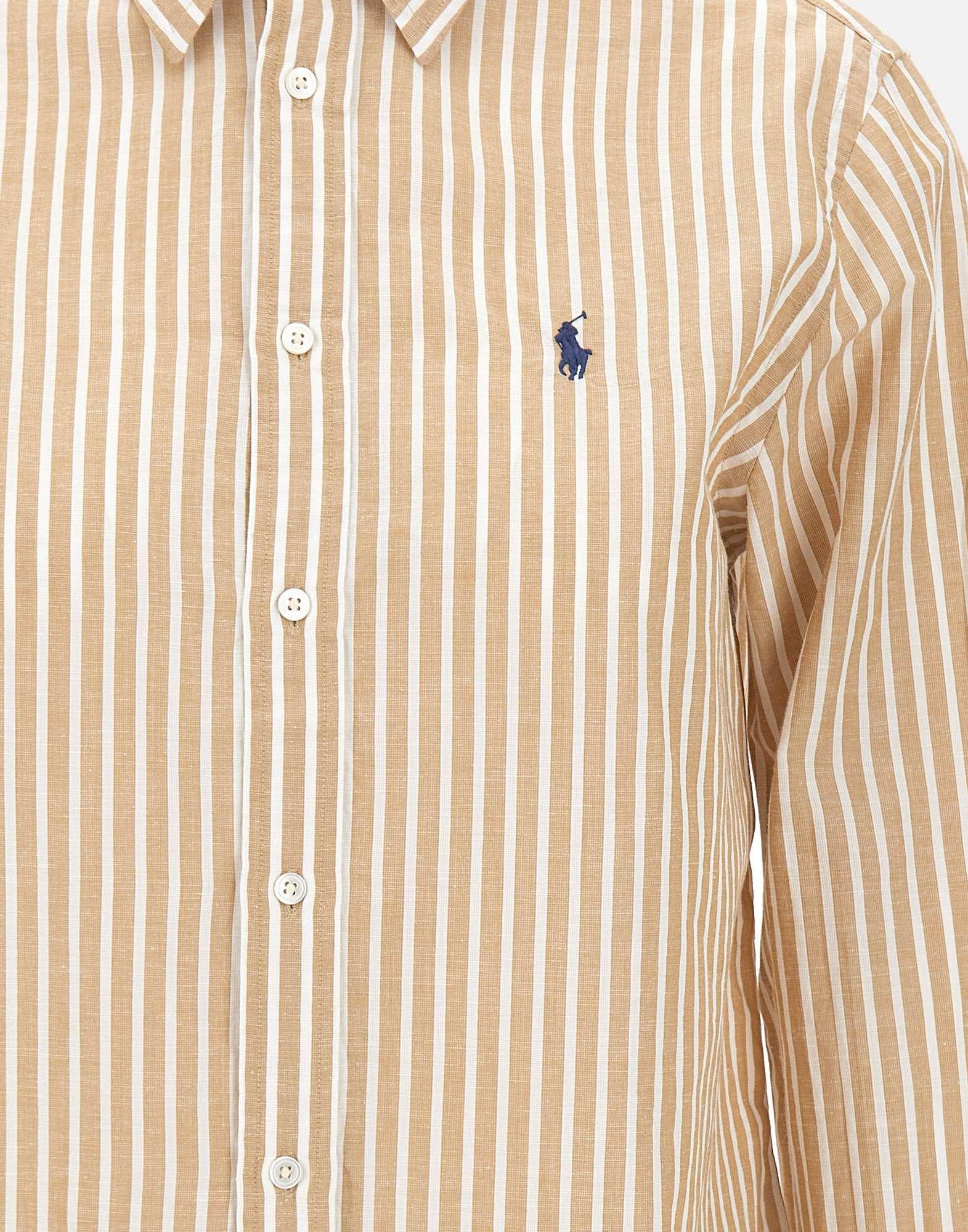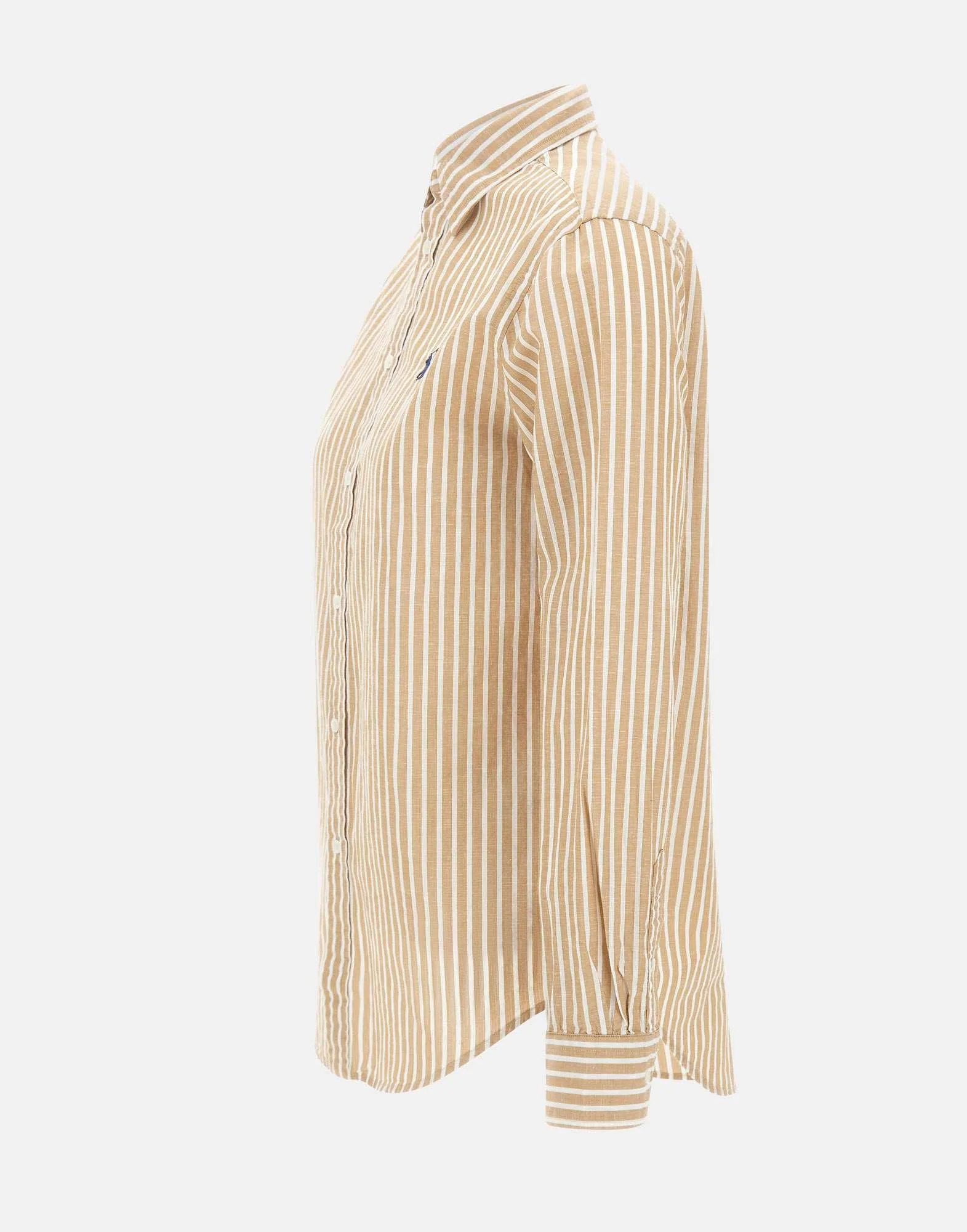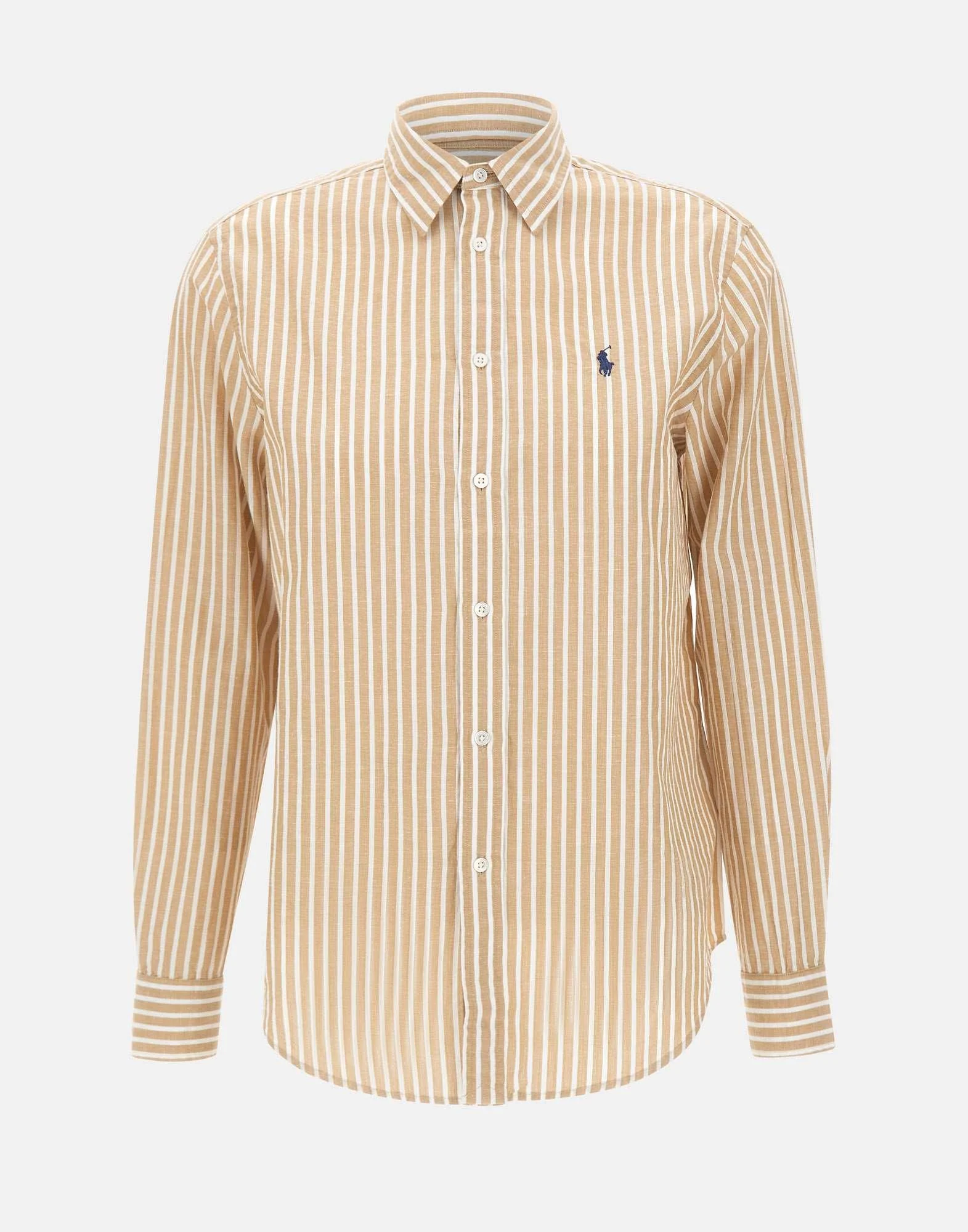 Camicia donna Polo Ralph Lauren realizzata in misto cotone e lino con righe tinte in filo nei toni del bianco e beige. Dallo stile e dal taglio classici, presenta una silhouette dritta che assicura una vestibilità pulita e senza tempo. Il modello è impreziosito dall’iconico pony ricamato sul torace in blu, dettaglio distintivo del brand. Collo a punta, cannoncino con bottoni in madreperla e polsini con bottoni completano il design con eleganza essenziale.