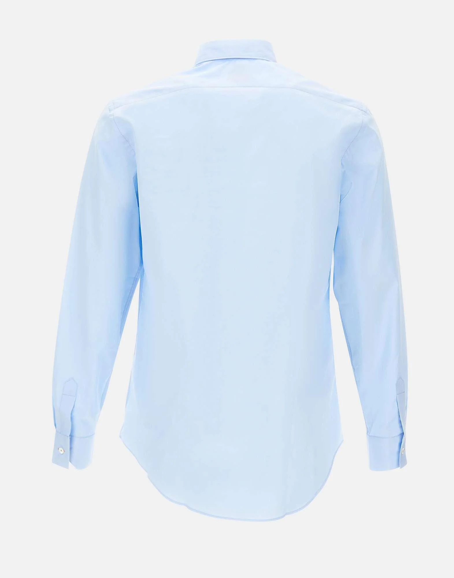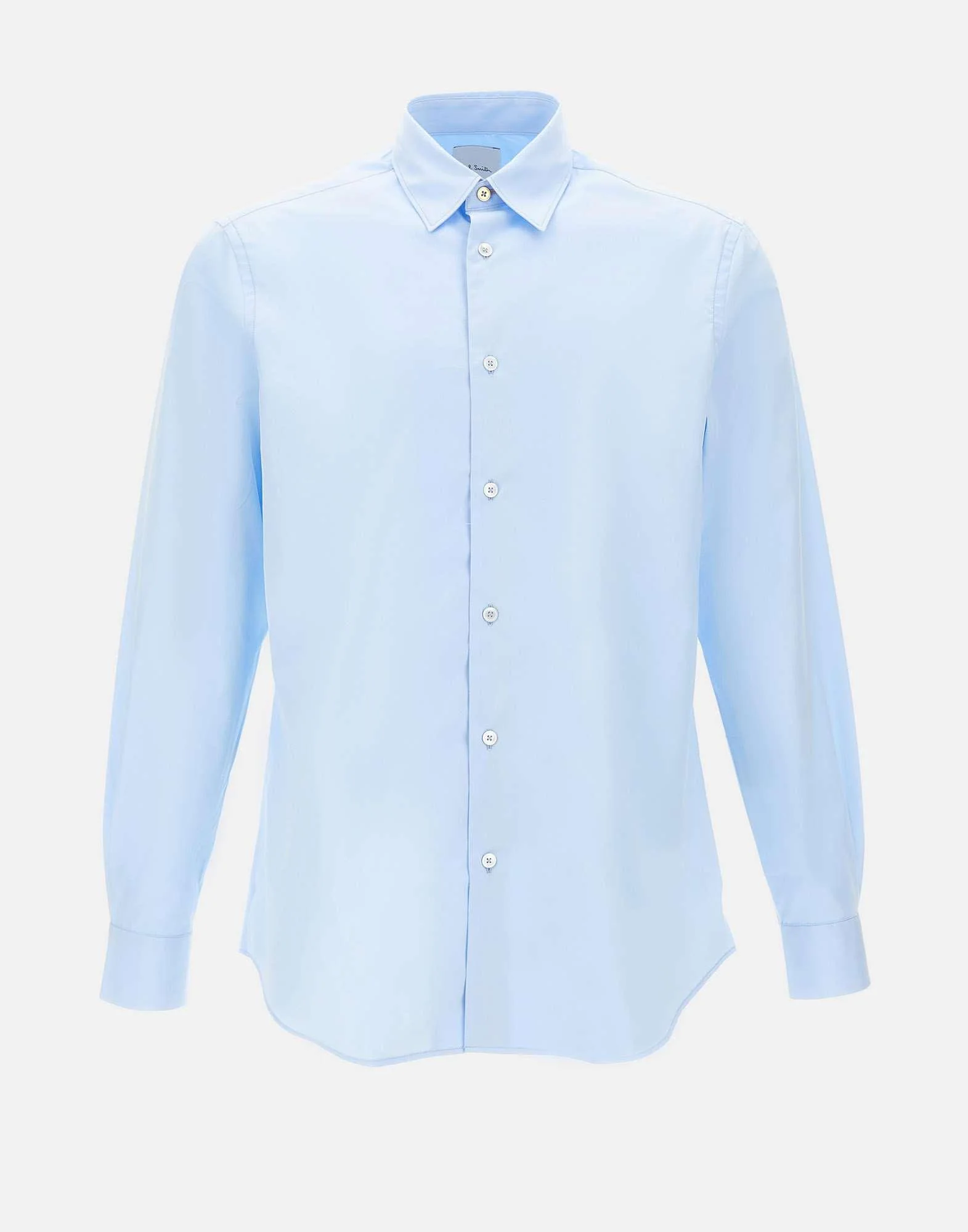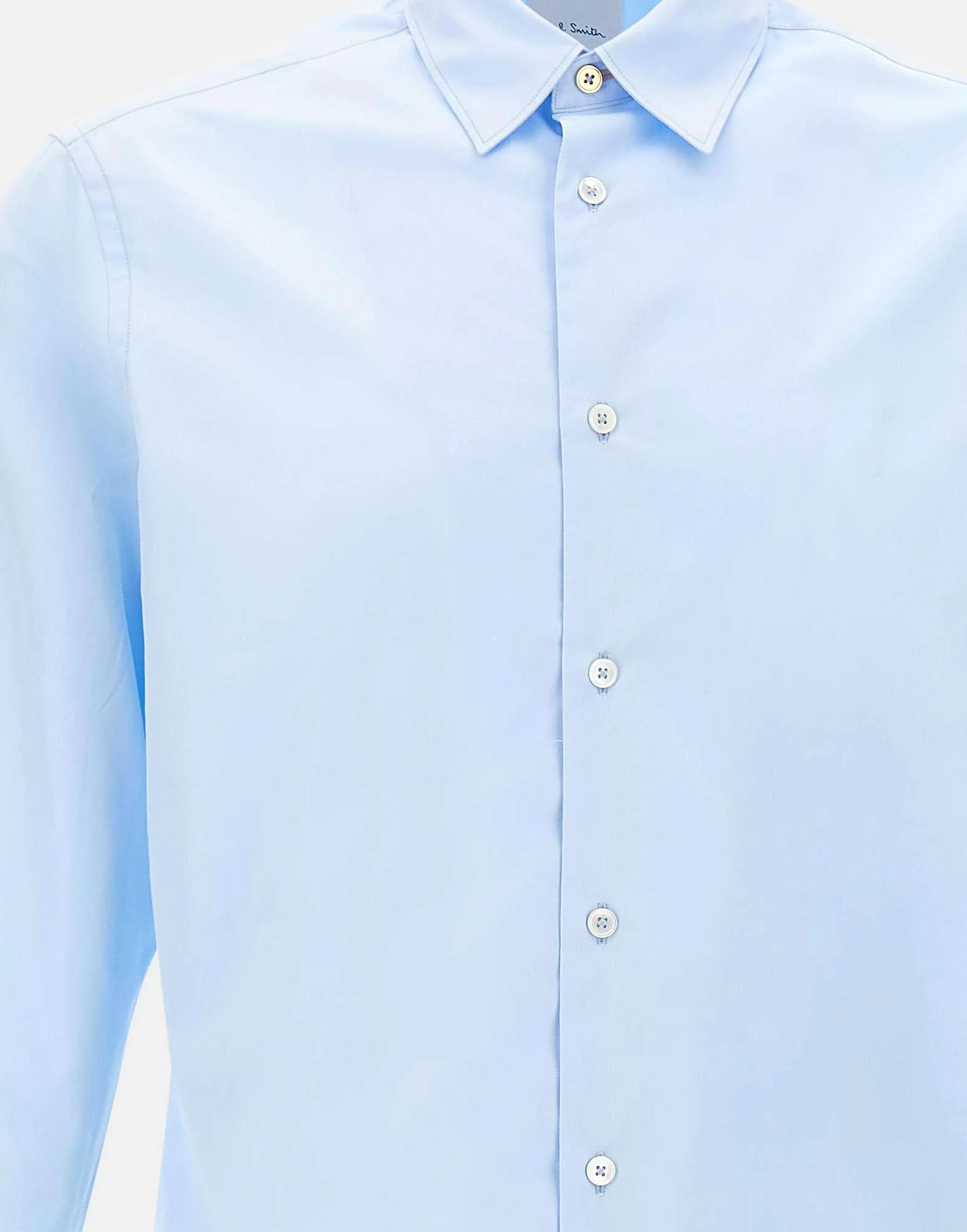 Camicia uomo Paul Smith realizzata in cotone color azzurro, dal design essenziale arricchito da dettagli distintivi del brand. Il modello a maniche lunghe presenta colletto a punta chiuso da bottone dorato e un motivo a righe multicolor nascosto nel cannoncino dei bottoni, per un accento raffinato e discreto. Completano il capo polsini con bottone, orlo arrotondato e taglio regular fit per una vestibilità confortevole e versatile. Made in Italy.