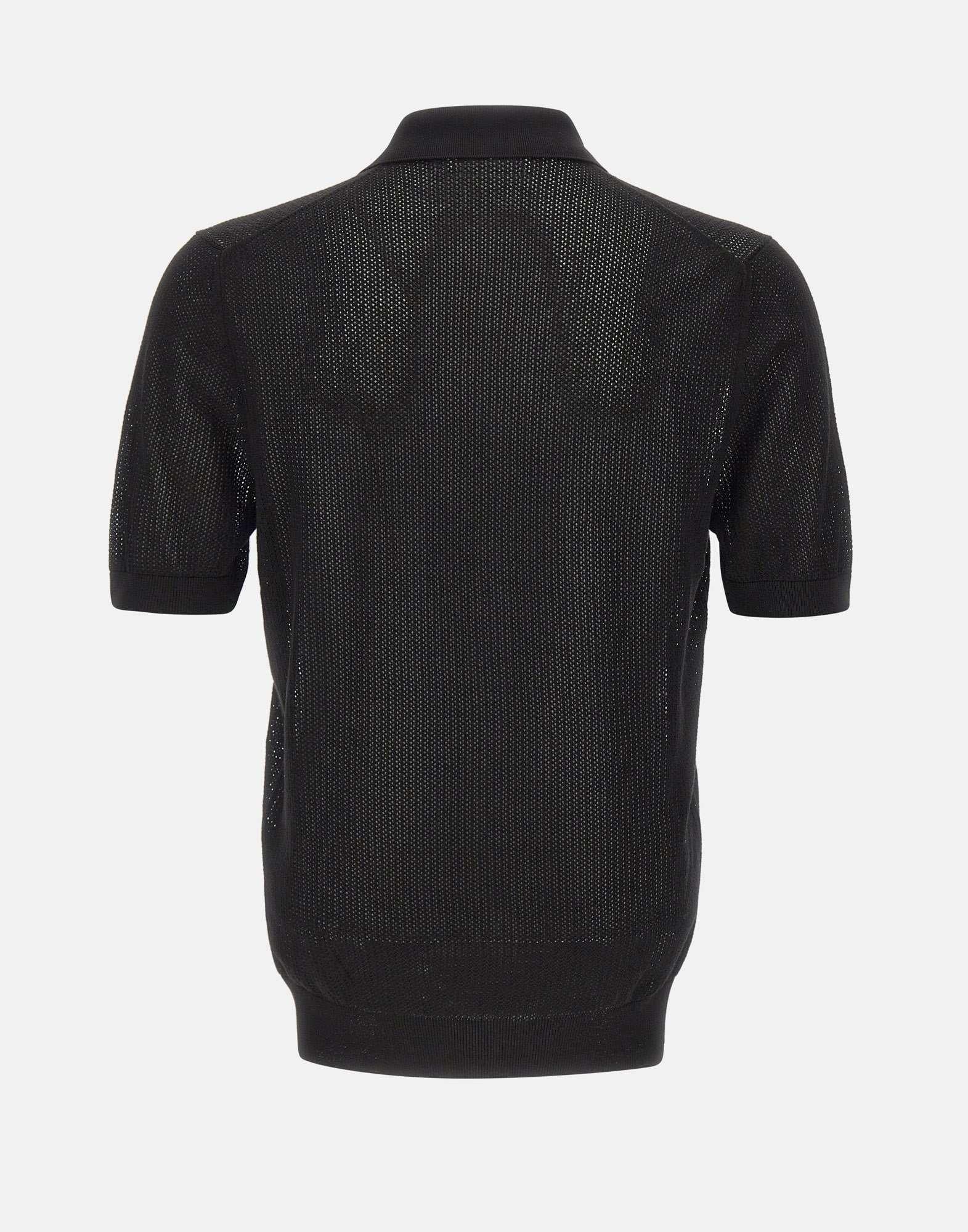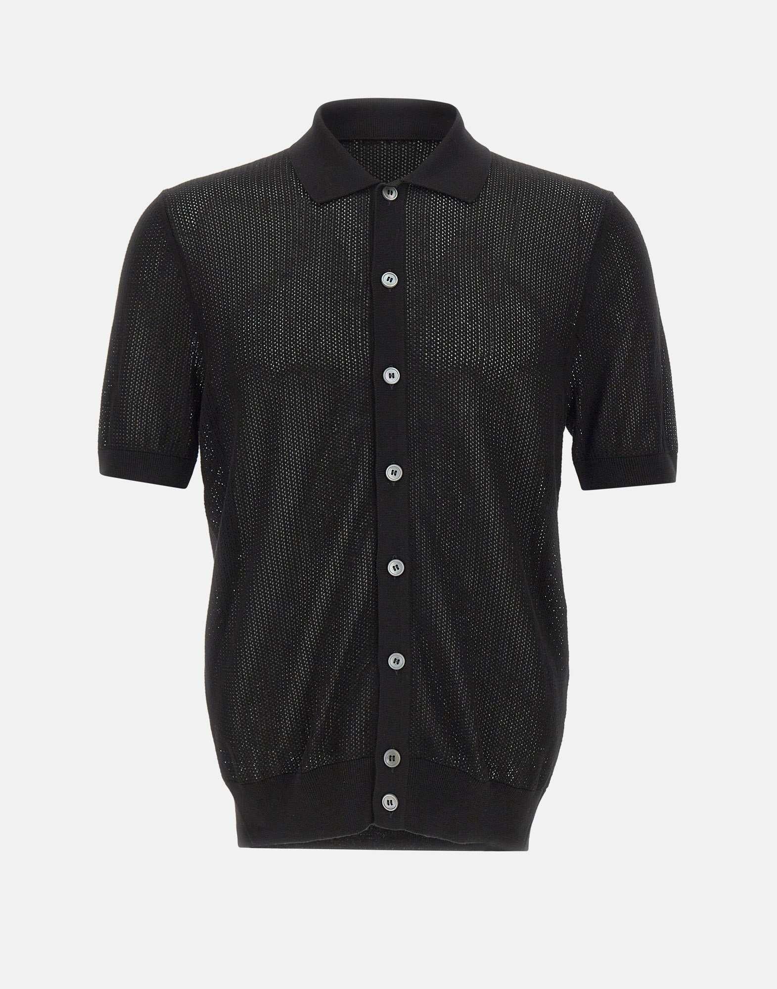 Camicia uomo Gran Sasso realizzata in maglia di cotone color nero, con lavorazione a intreccio che crea un effetto semi trasparente e valorizza texture e costruzione. Il modello a maniche corte presenta rifiniture a costine su colletto, fondo e orlo delle maniche per una linea definita e contemporanea, completata da bottoni con effetto lucido che aggiungono un dettaglio raffinato. La vestibilità regular fit garantisce comfort e versatilità, ideale per look estivi casual eleganti. Made in Italy.