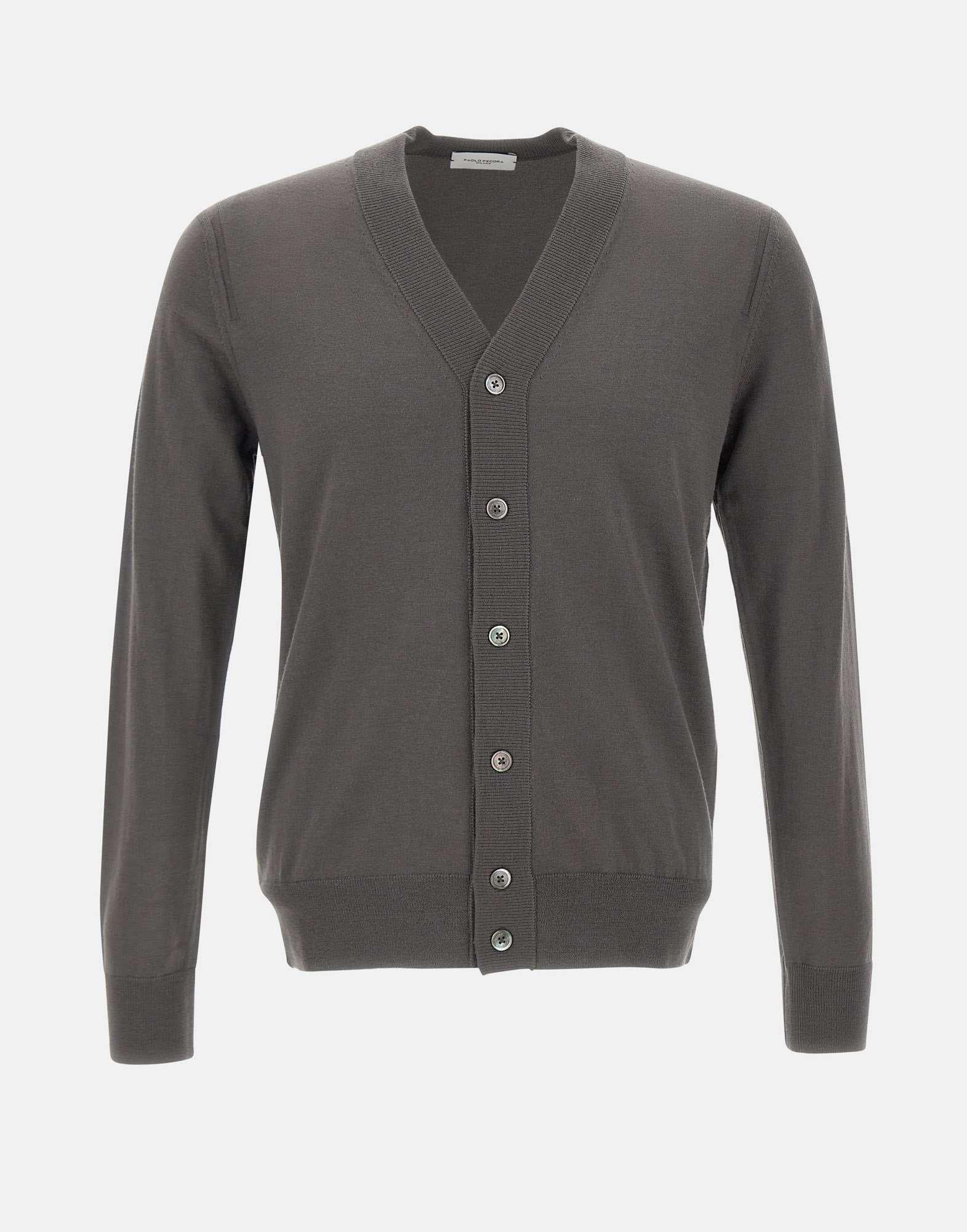 Cardigan uomo Paolo Pecora in lana finezza16, grigio, scollo a V, maniche lunghe, chiusura con bottoni madreperla logati, super morbido e caldo, regular fit.