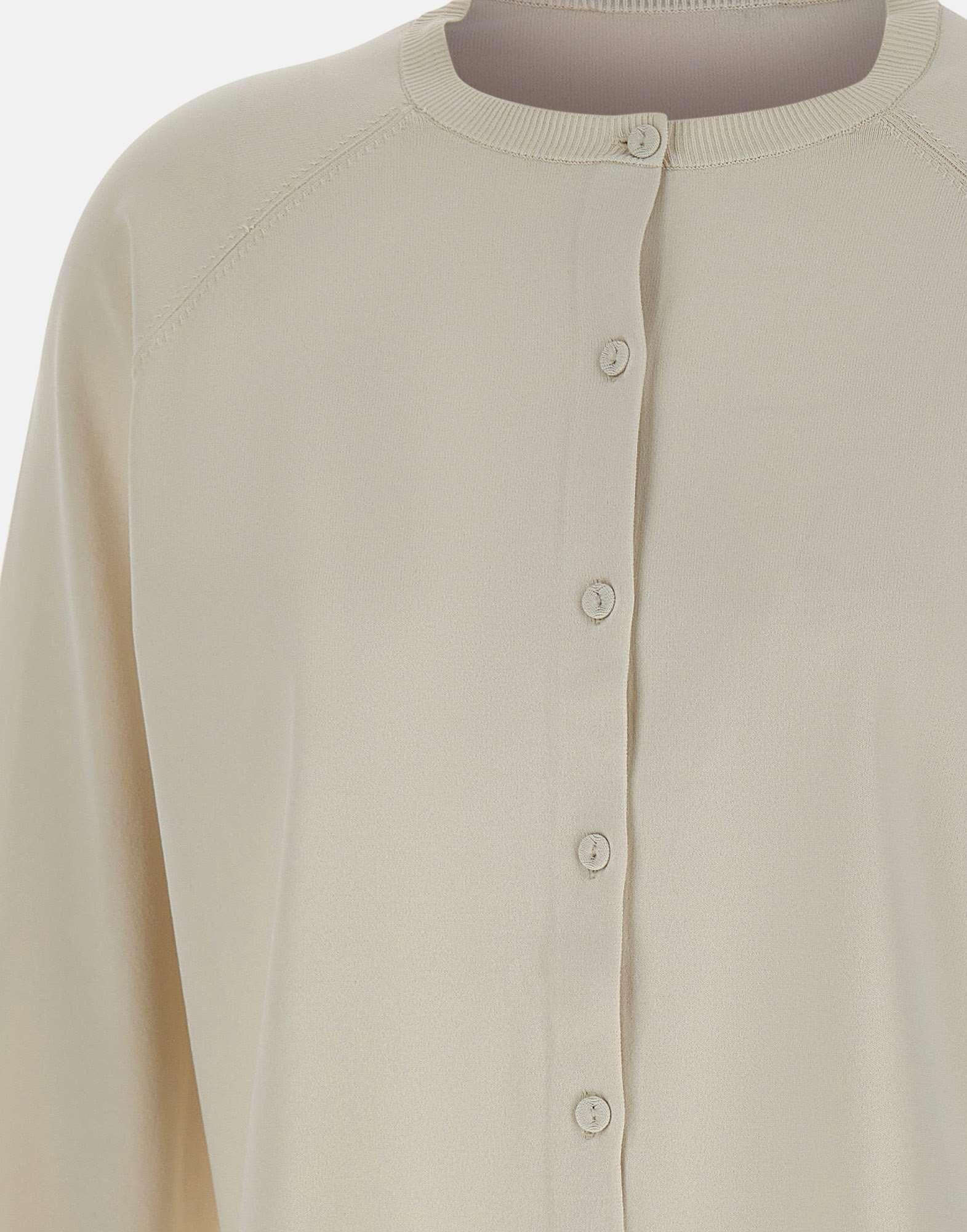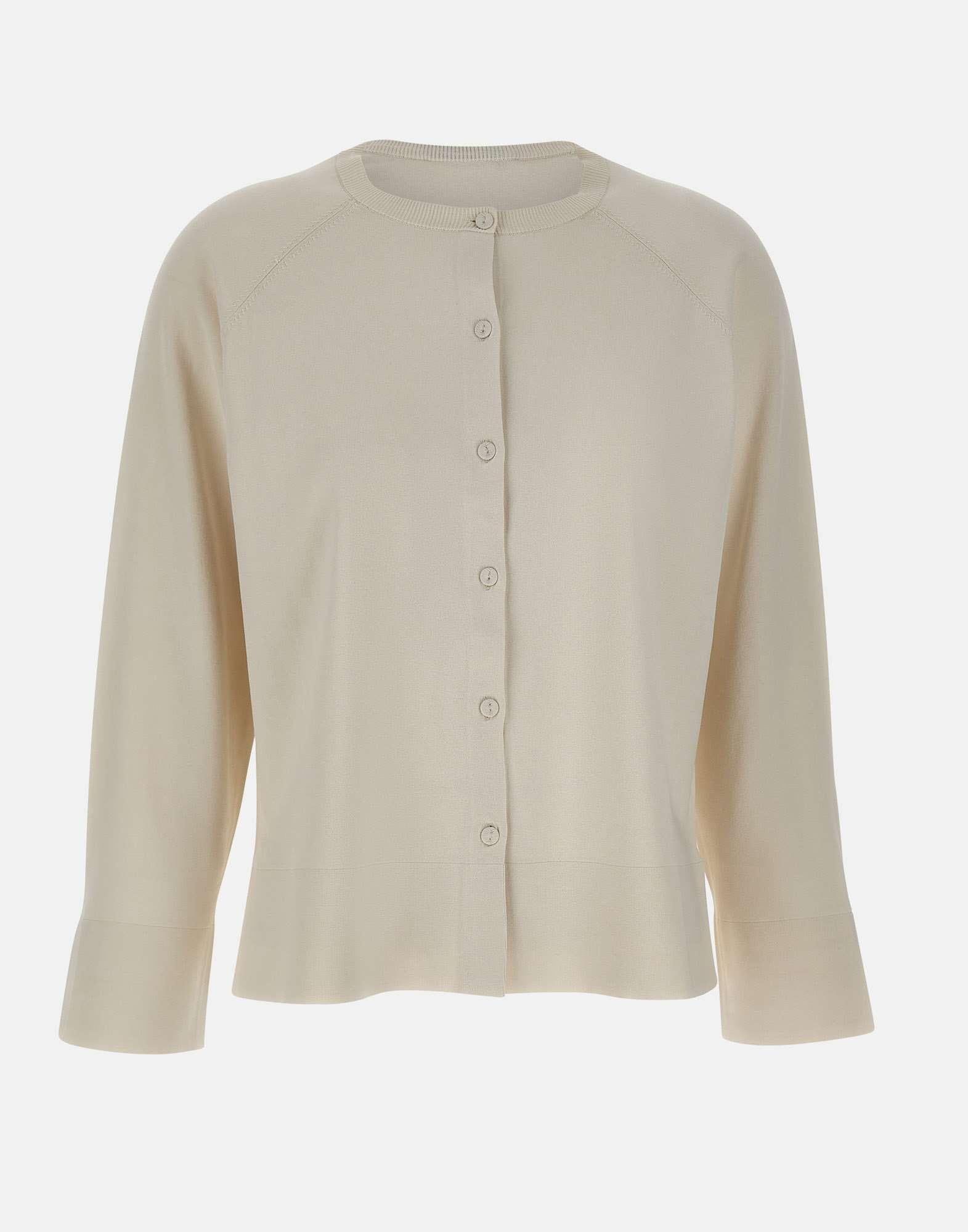 Cardigan donna Elena Mirò realizzato in filato misto viscosa color bianco, essenziale e versatile. Presenta bottoni ton sur ton rivestiti in tessuto e girocollo a costine per una finitura pulita. Le maniche lunghe sono completate da spacchi ai polsini, più piccoli spacchi all’orlo che aggiungono comfort e movimento. Vestibilità regolare.