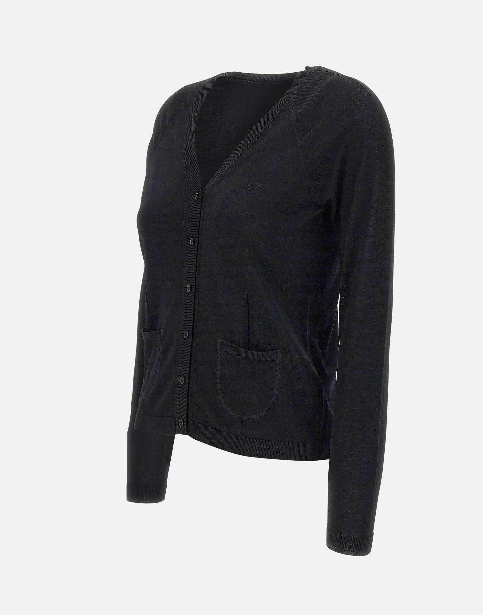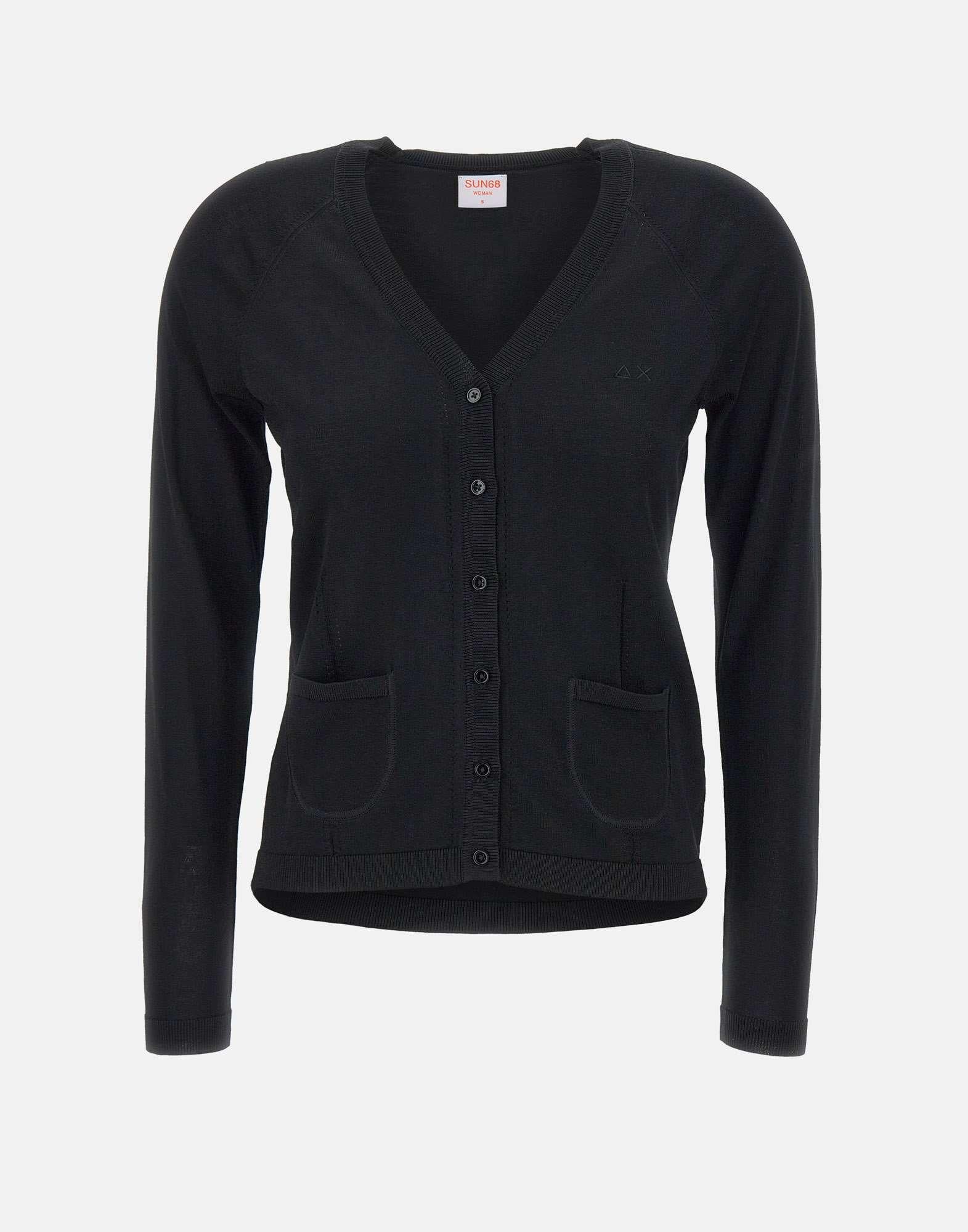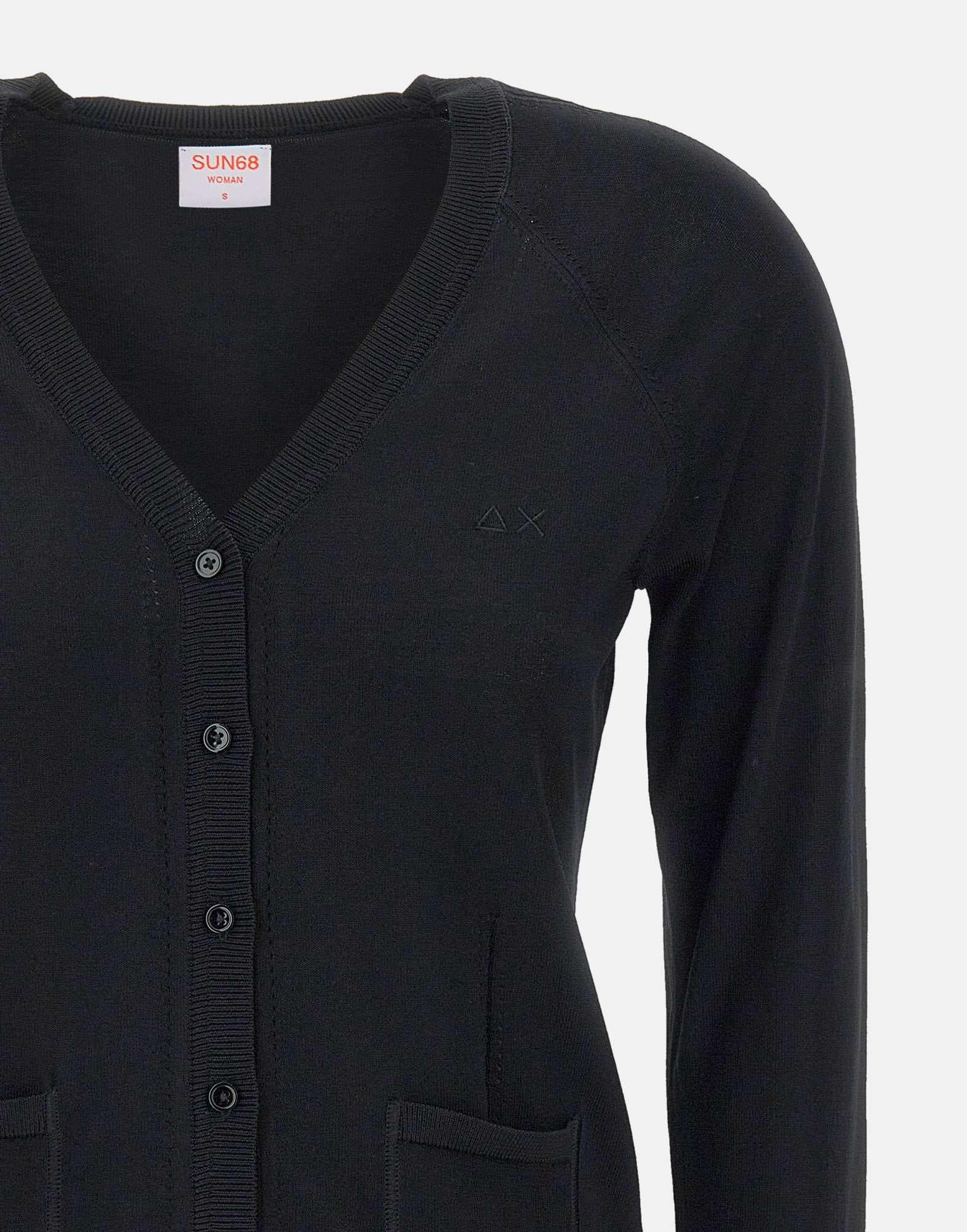 Cardigan donna Sun68, colore nero, tessuto misto viscosa, maniche lunghe, scollo a V, bordi a costine, chiusura con bottoncini in tinta logati, taschine applicate sul davanti, regular fit.