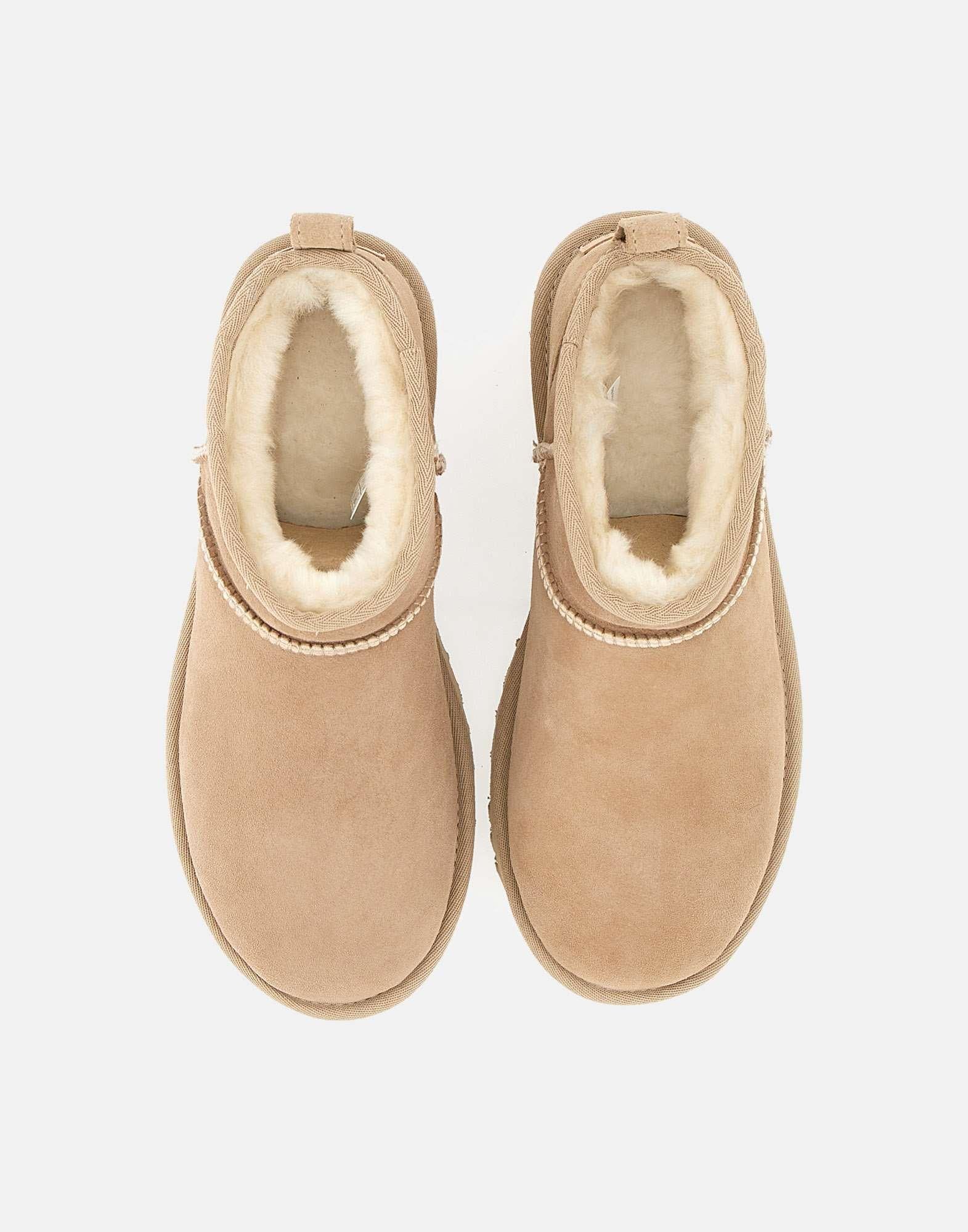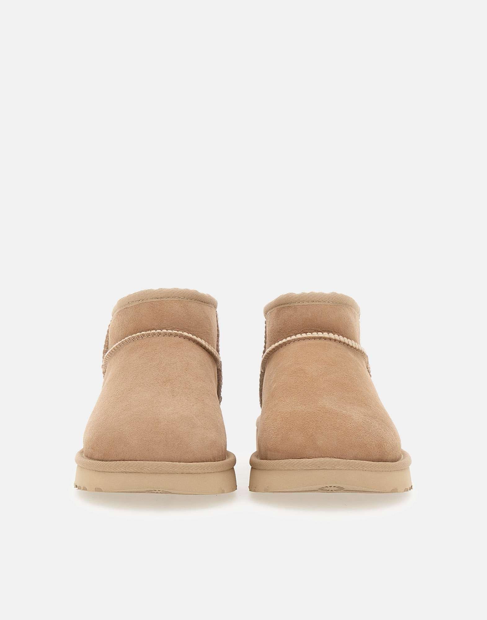 Stivali donna Ugg “Classic Ultra Mini” in camoscio, sabbia, alto alla caviglia, tirante posteriore, patch logo sul retro, interno in shearling, ideale per la stagione fredda, suola in gomma alta 2 cm. Scala taglie Usa. Calzata regolare