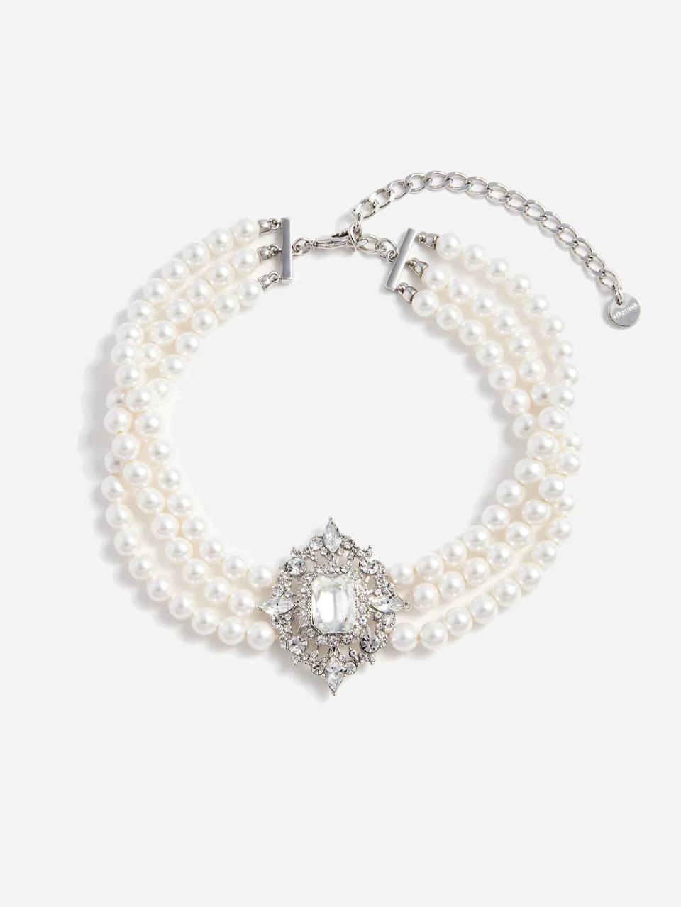 “Crystal Pearl Choker” donna Self-Portrait, choker a piu livelli con perle sintetiche e un elemento centrale decorato con cristalli per un effetto scenografico di ispirazione barocca. Il design combina decorazioni con cristalli e perle sintetiche, completato da chiusura a perno per una vestibilità stabile e sicura. Perfetto per valorizzare look da sera e outfit eleganti con un accessorio luminoso e di forte impatto. Lunghezza: 34 cm (esclusa la catena). Altezza: 4 cm.