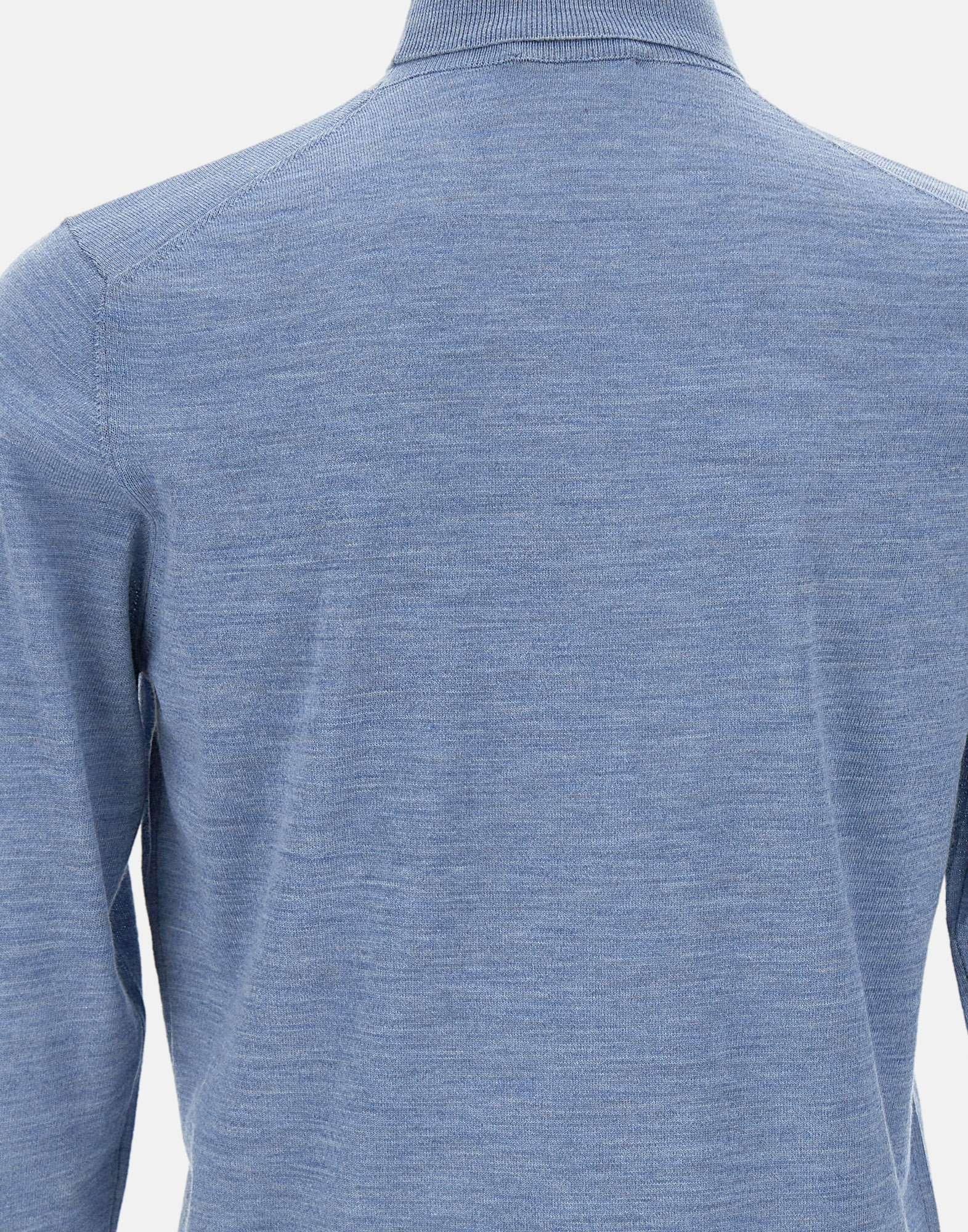 Dolcevita uomo Filippo De Laurentiis in lana super fine 120’S, celeste mèlange, maniche lunghe, collo alto, bordi a costine, regular fit, made in Italy.