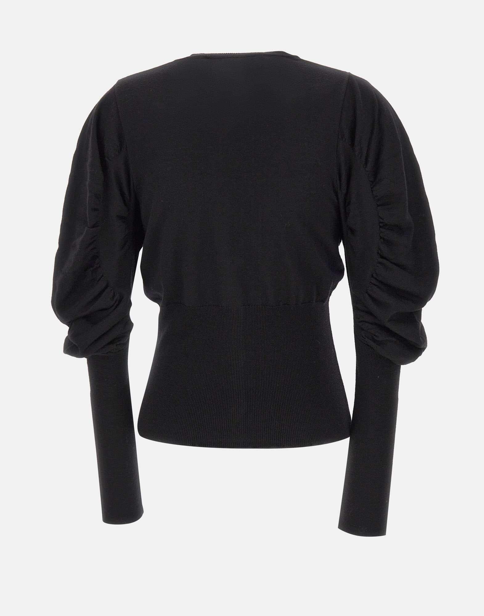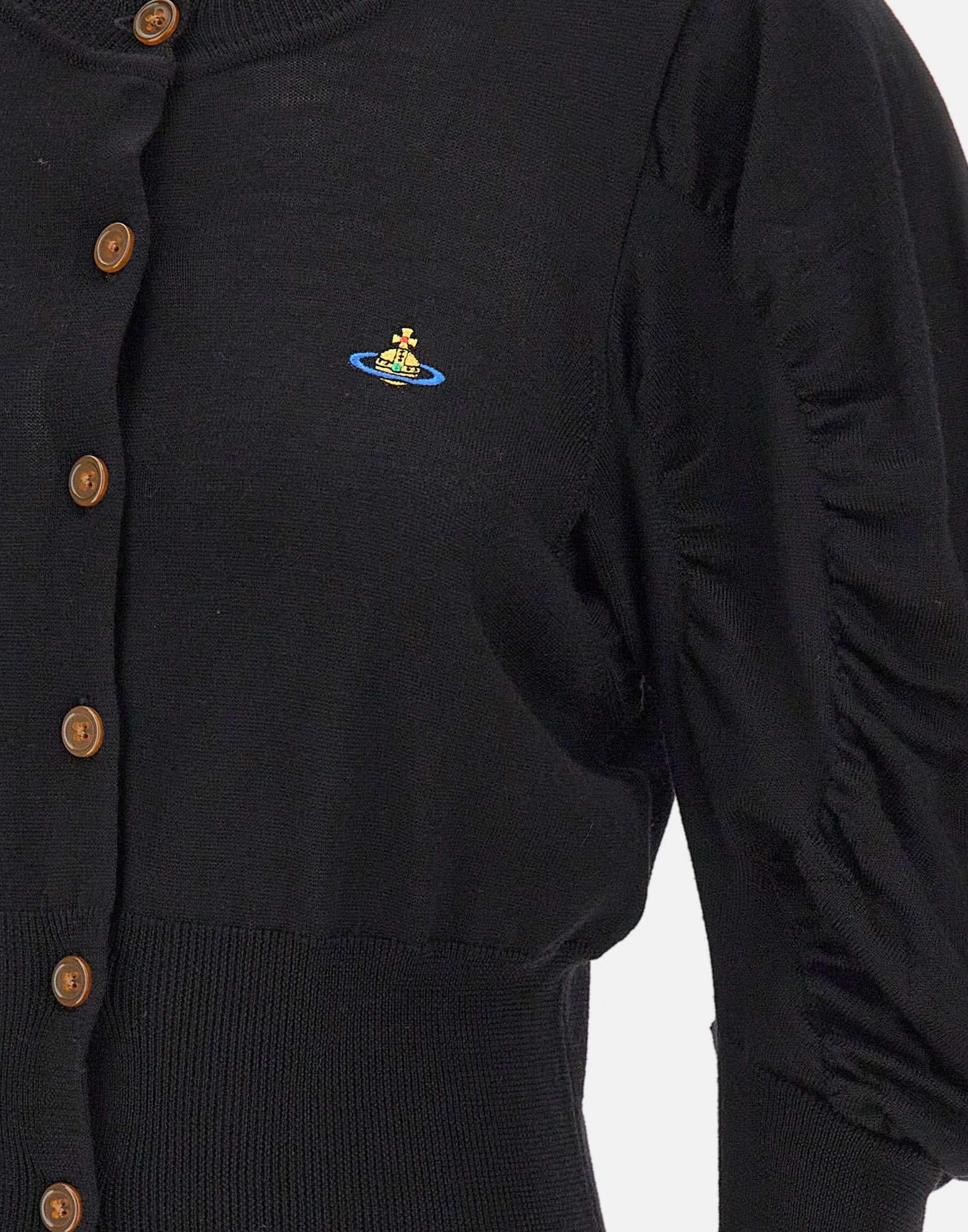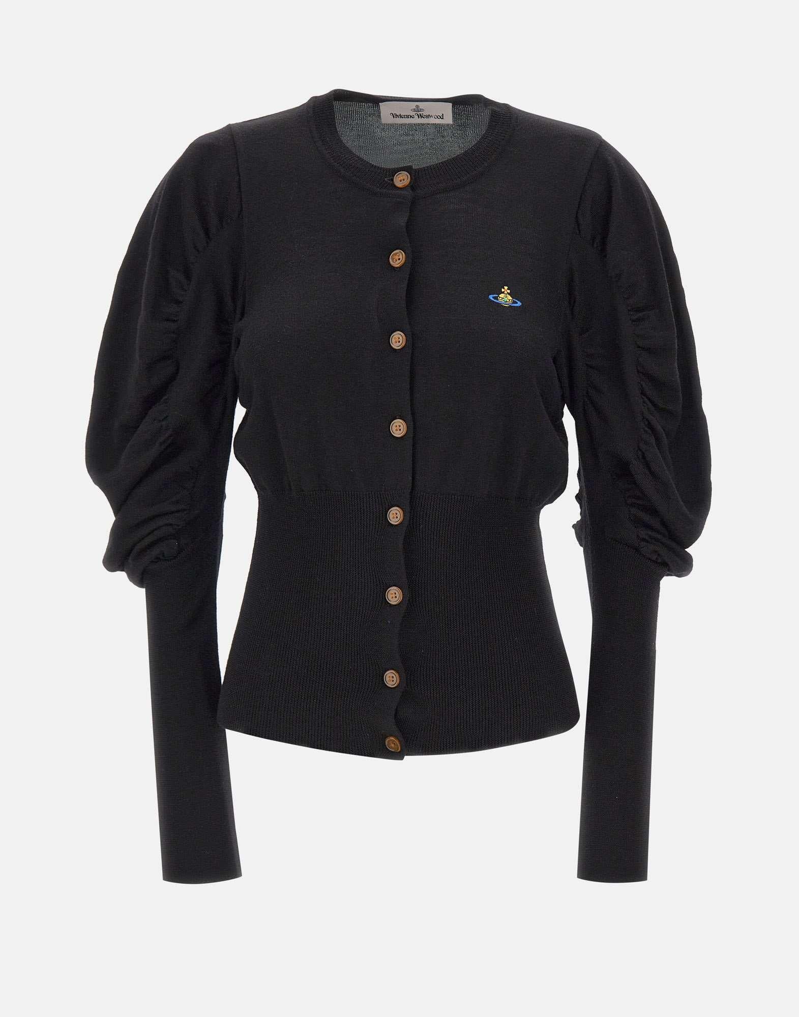 Vivienne Westwood “Eli cardigan” in morbida lana nera, dal design sagomato con spalle drappeggiate e maniche lunghe voluminose. Colletto tondo, chiusura frontale con bottoni e dettagli a coste oversize su orlo e polsi. Impreziosito da Orb multicolore ricamato sul petto, simbolo dellestetica della Maison che unisce tradizione e spirito rivoluzionario. Realizzato in Italia. Consigliata la taglia abituale.