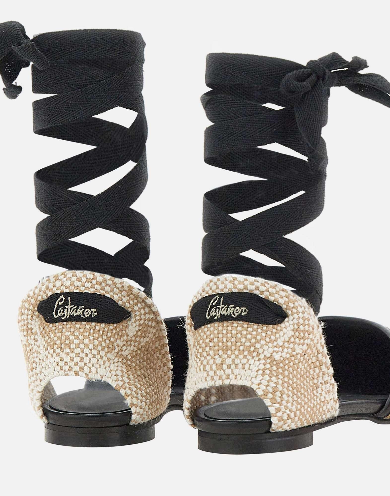 Espadrillas donna Castaner “Gasby”, color corda e nero, piatte, in rafia e profili in nappa , chiusura con nastri, soletta imbottita, punta e tallone chiusi, altezza 1cm.