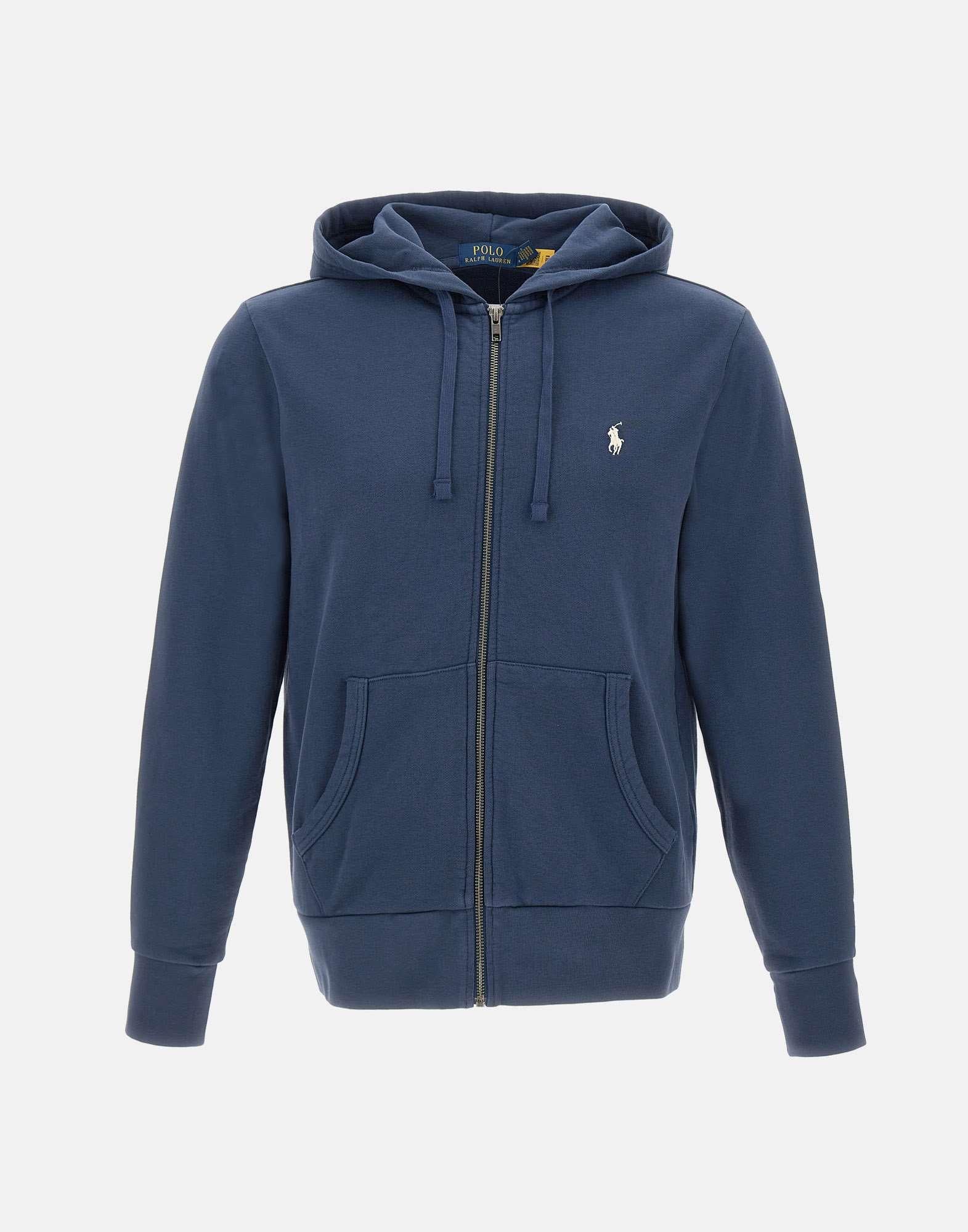 Felpa uomo Polo Ralph Lauren “Classics” in cotone, blu, cappuccio con coulisse in tinta, maniche lunghe, orli a costine, chiusura full zip, logo a ricamo sul petto a contrasto di colore bianco, tasche laterali a filetto, regular fit.