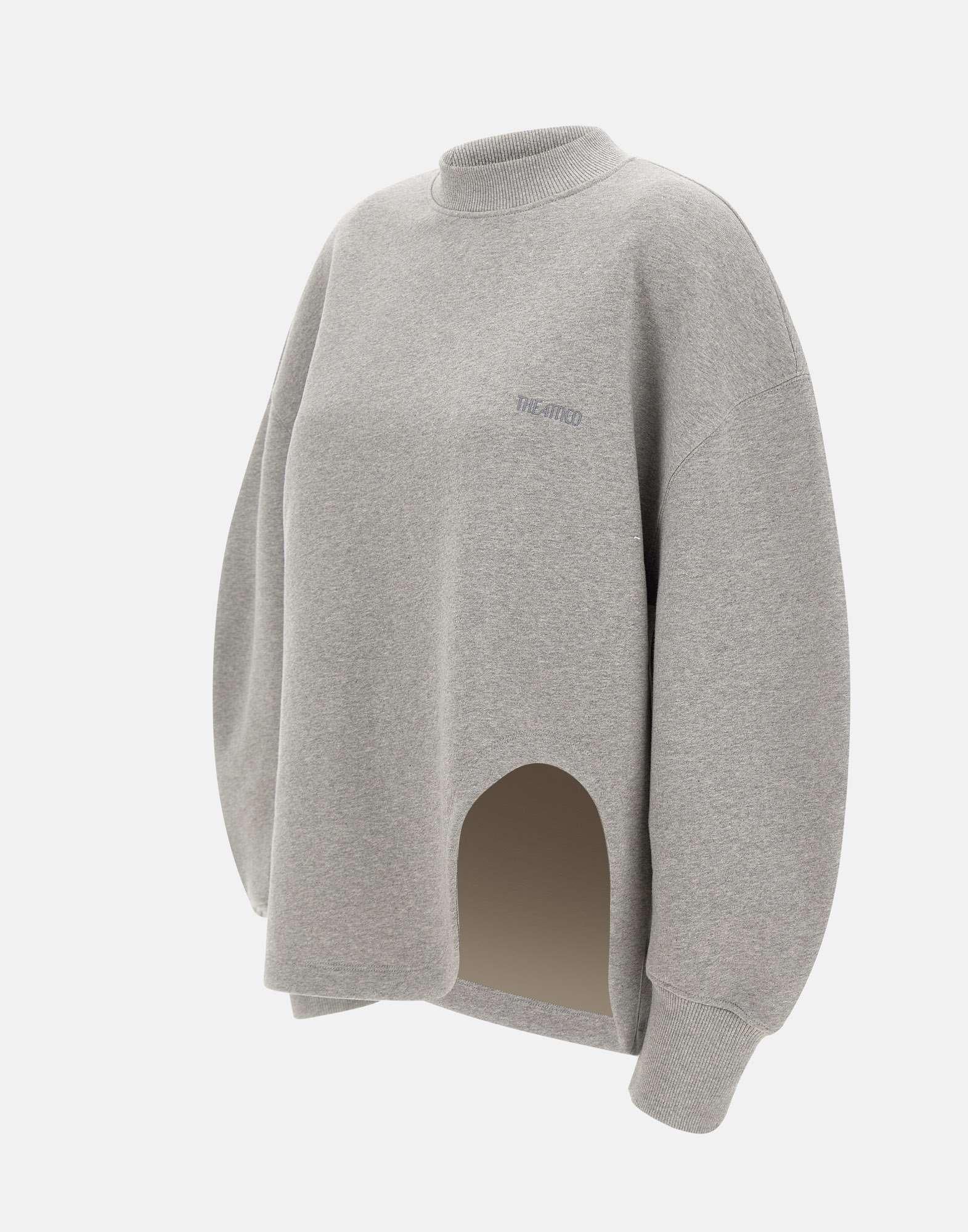 Felpa donna The Attico in pile americano di cotone color grigio melange, dal design contemporaneo e rilassato. Il modello presenta girocollo, spalle scese, maniche ampie e polsini a costine elasticizzati per un comfort ottimale. Lo spacco geometrico sul fronte aggiunge un tocco distintivo e moderno, mentre il logo ricamato ton sur ton sul petto firma il capo con discreta eleganza. Vestibilità over per un look urbano e sofisticato.