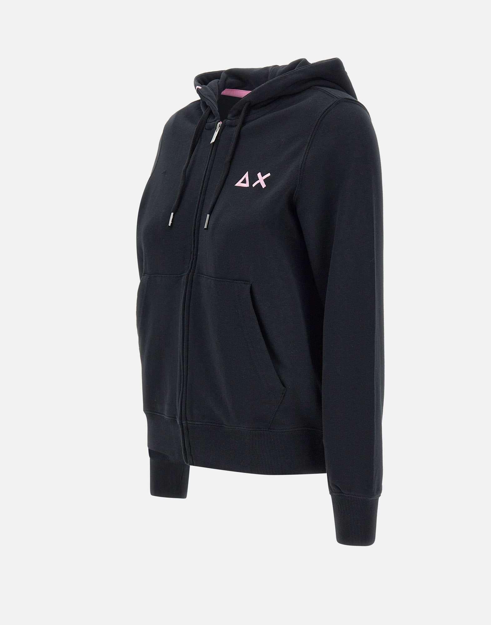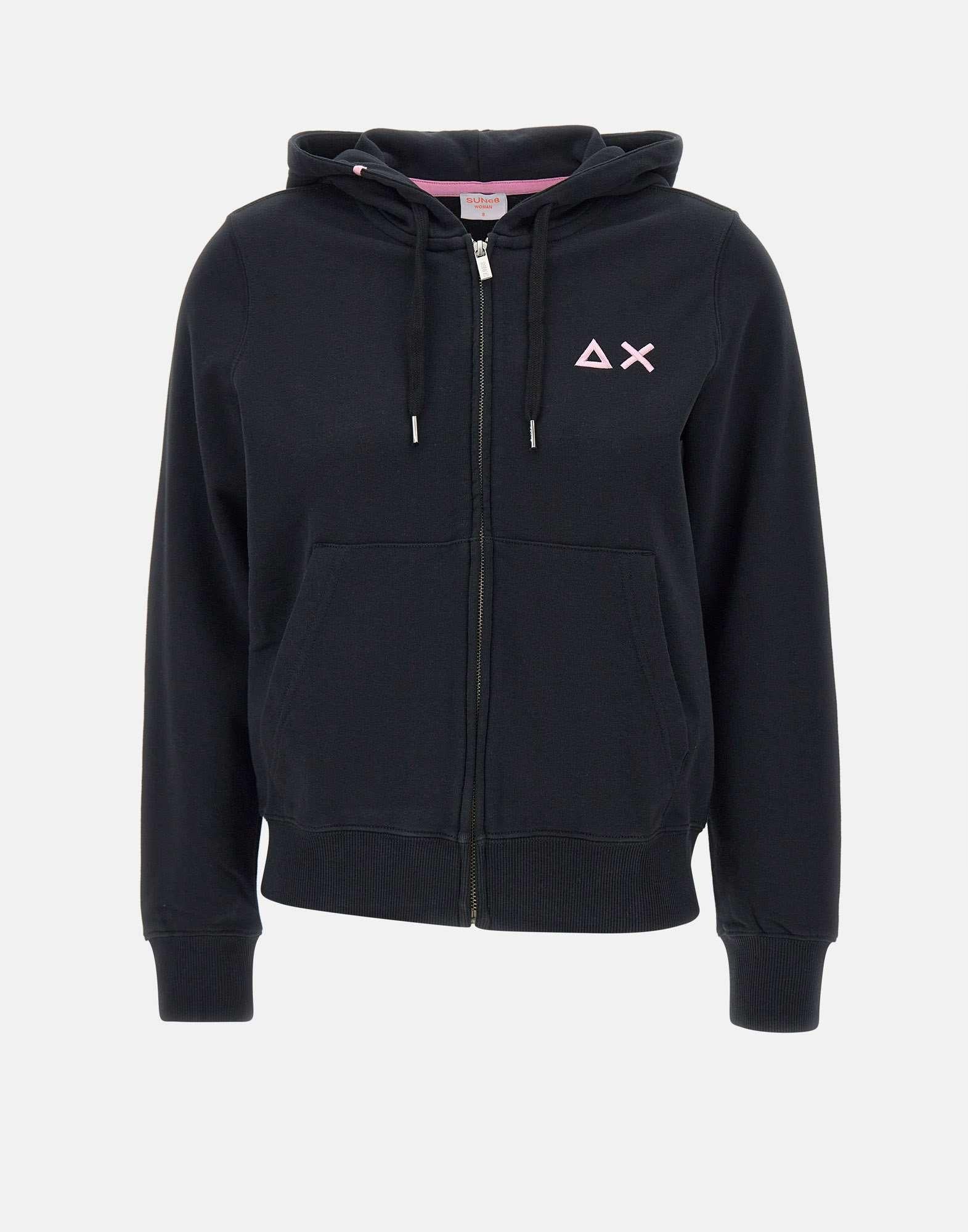 Felpa donna Sun68 “Hoodie Zip Fleece” in cotone, color nero, chiusura frontale con zip, tasche sul davanti, logo ricamato a contrasto, cappuccio regoabile con coulisse, finalini in metallo logati, polsini e fondo elasticati a costine, regular fit.