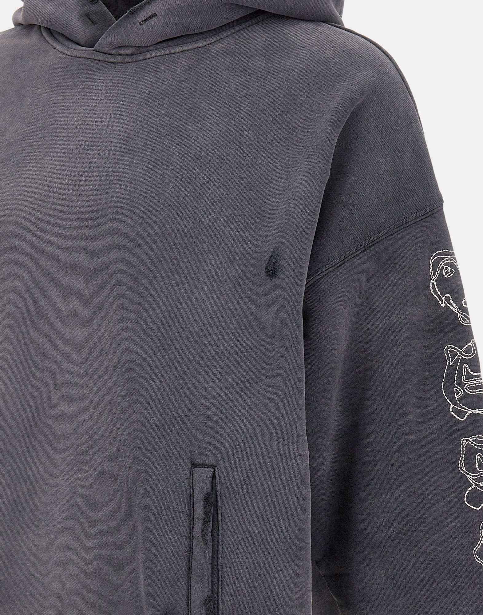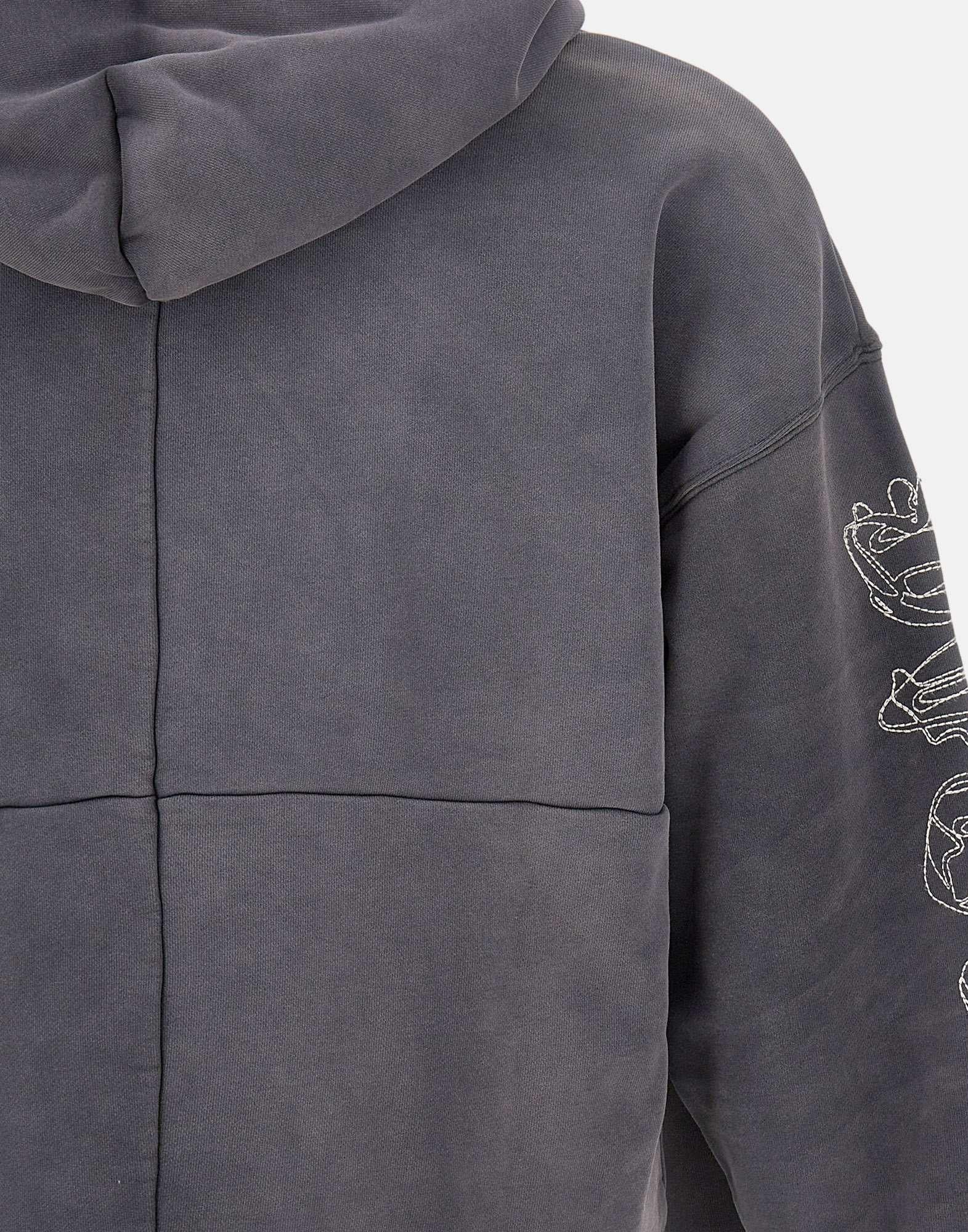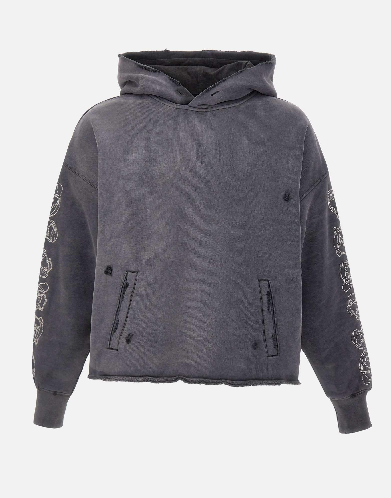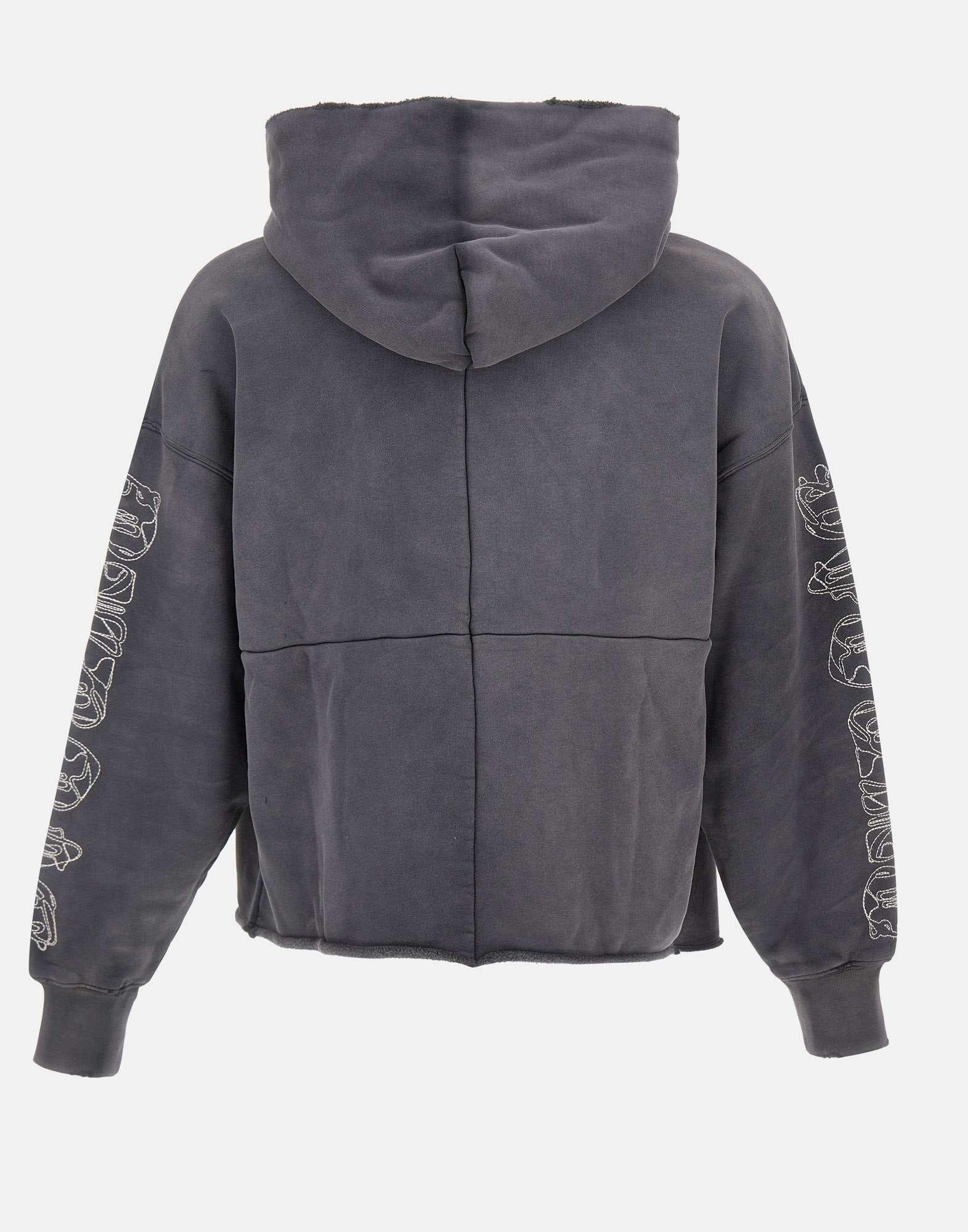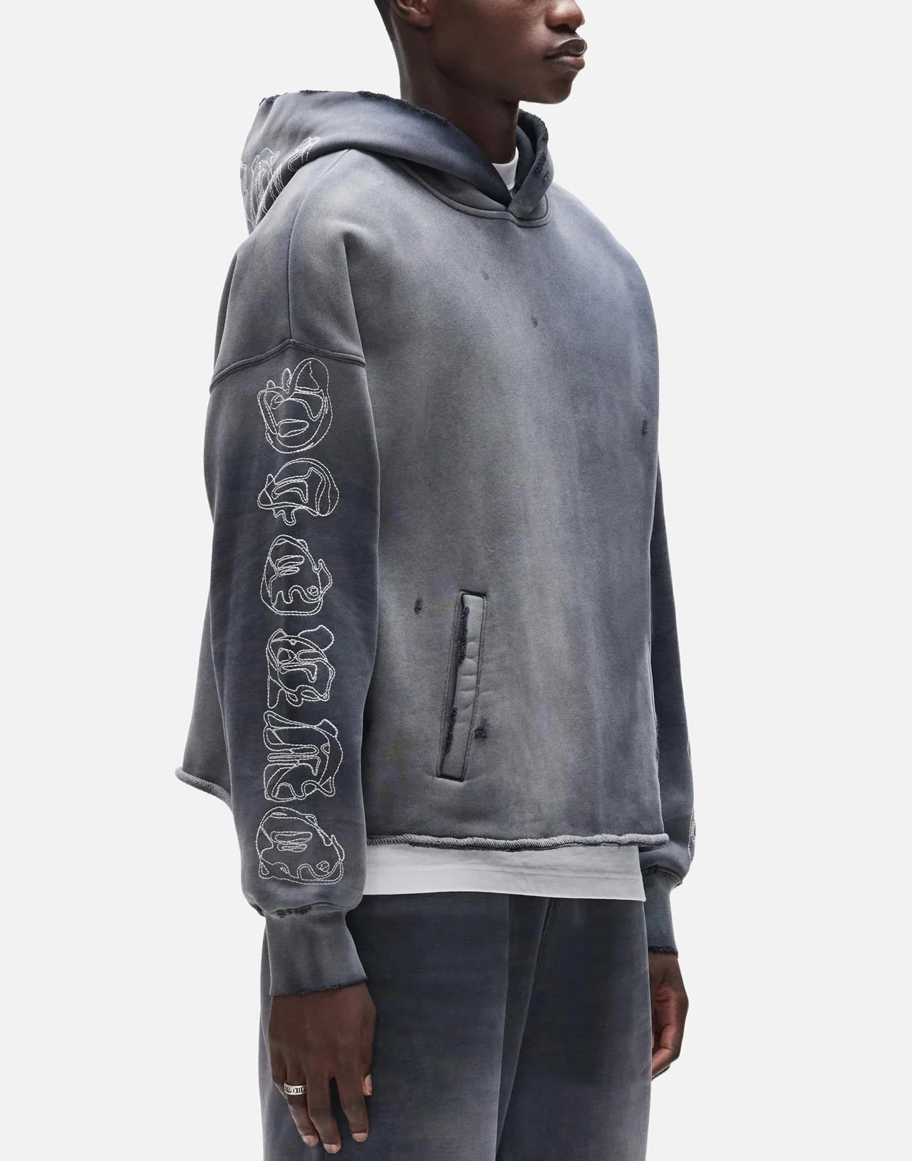 Felpa uomo Purple Brand “Gothic Outline Hoodie” in cotone, nero sfumato, con interno garzato per massimo comfort. Modello con cappuccio, maniche lunghe e costruzione a pannelli per un look contemporaneo. Caratterizzata da dettagli destroyed, bordi a costine e loghi ricamati sulle maniche. Spalle raglan e vestibilità oversize per uno stile streetwear di tendenza.
