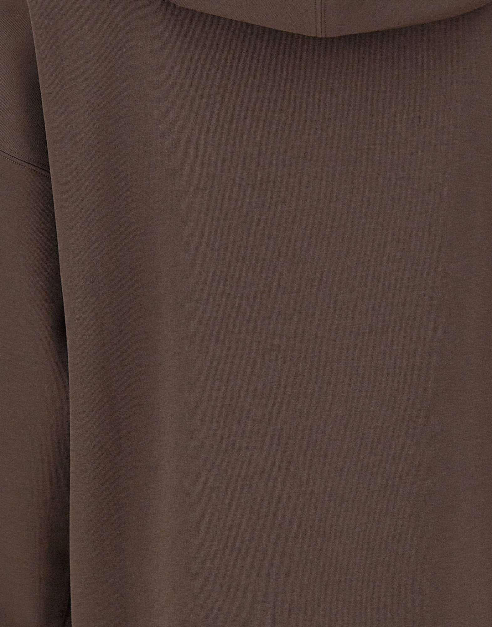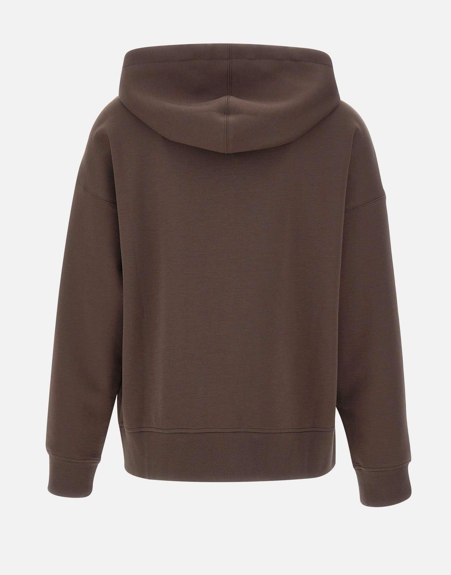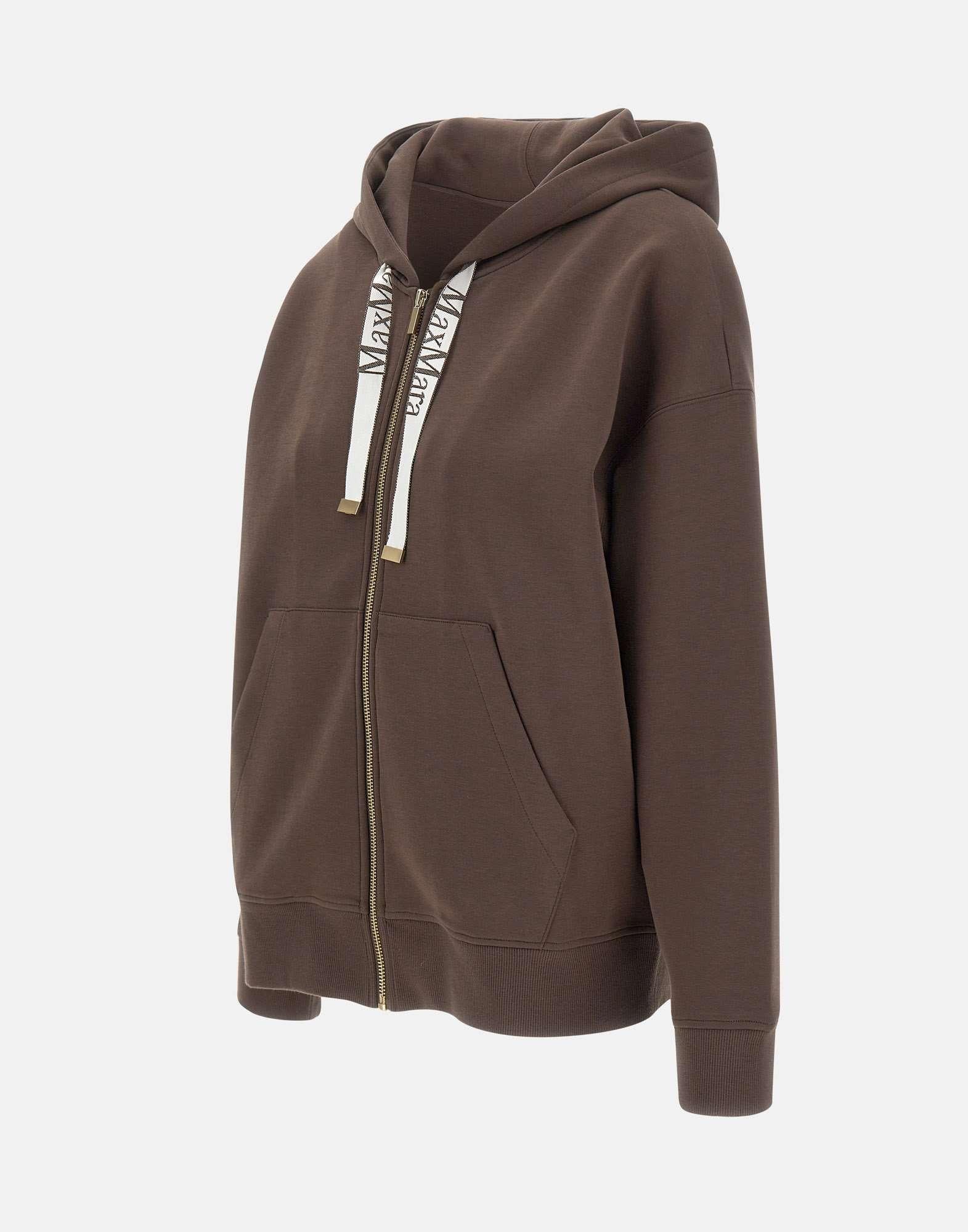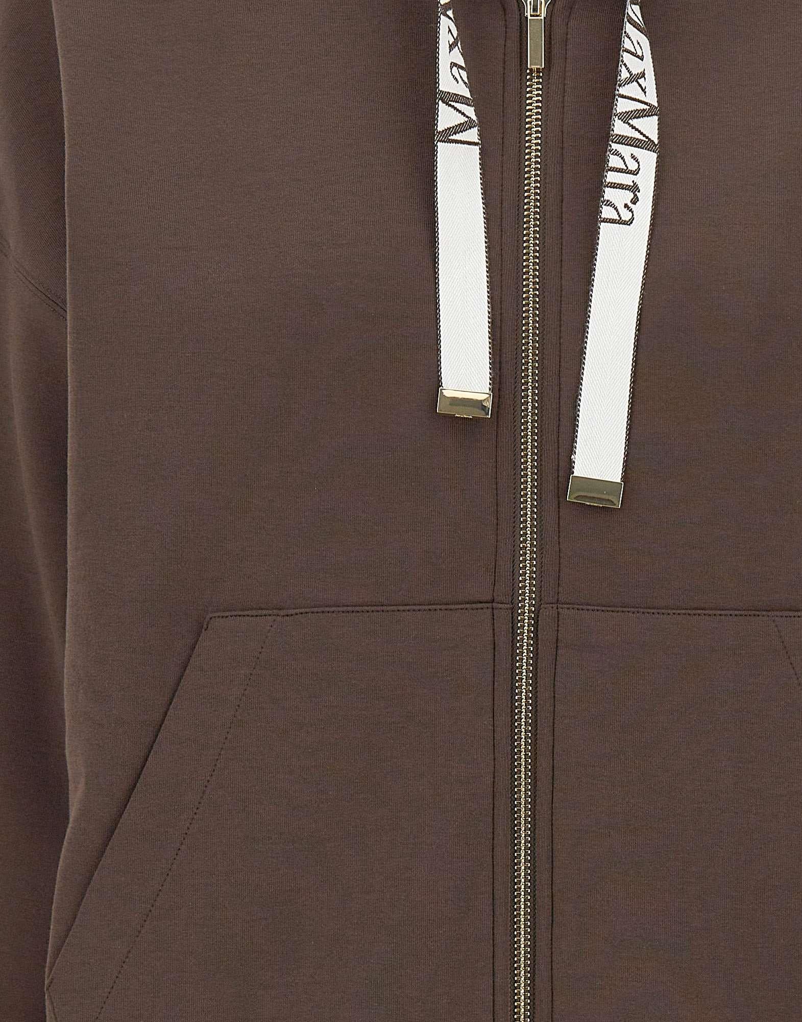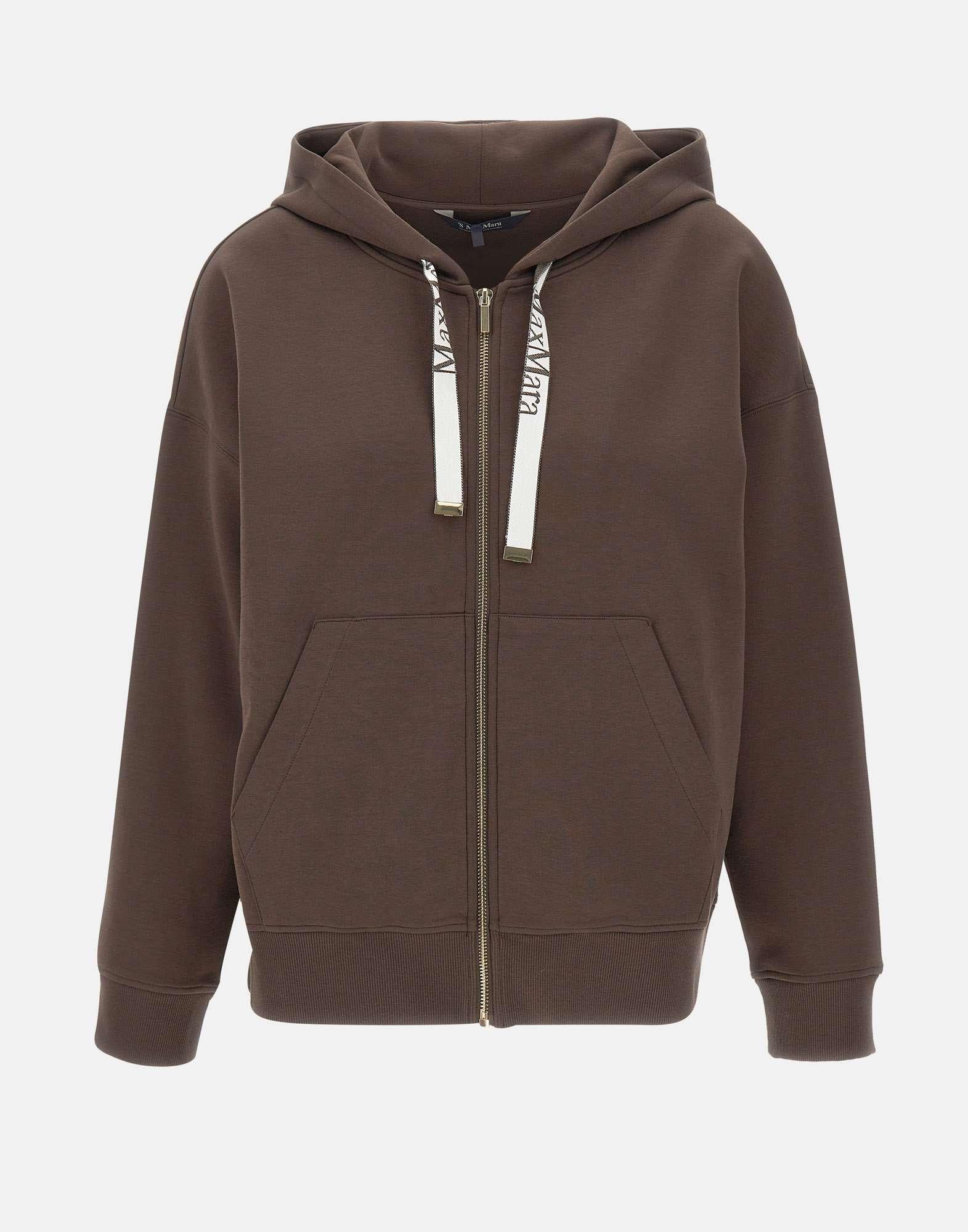 Felpa donna ‘S Max Mara “Jour” realizzata in jersey di cotone tecnico color cioccolato, dal design moderno e funzionale. Il modello presenta cappuccio con coulisse e nastri con logo jacquard, dettaglio distintivo che arricchisce l’estetica essenziale del capo. La costruzione boxy con maniche lunghe a giro basso e chiusura frontale con zip definisce una silhouette contemporanea. Completata da tasche a marsupio sul davanti, polsi e bordo a costine, offre comfort e praticità. La vestibilità leggermente over la rende ideale per look casual raffinati.