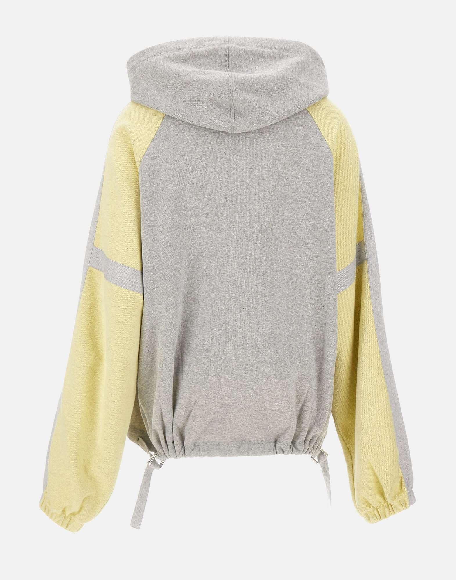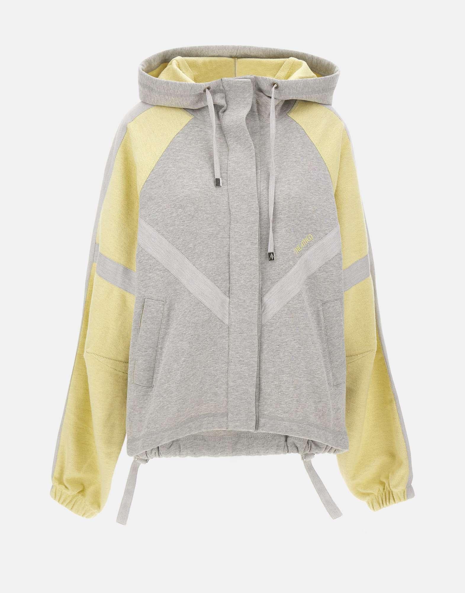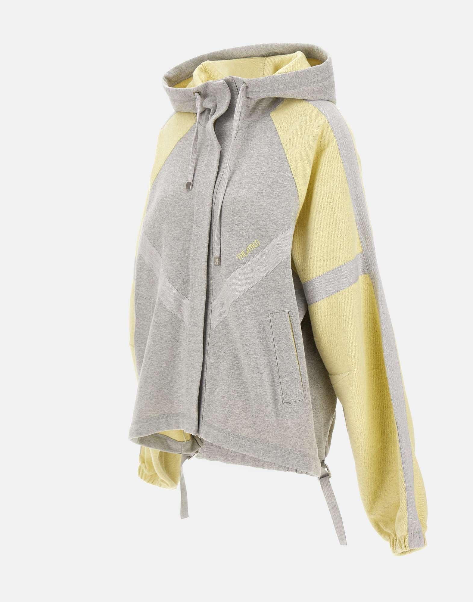 Giacca donna The Attico in pile americano di cotone grigio melange, con inserti gialli a contrasto sulle maniche. Modello bomber dal taglio over, con cappuccio regolabile, chiusura frontale con bottoni a pressione nascosti e tasche laterali a filetto con bottone. Il fondo presenta coulisse sul retro e fibbie laterali per regolare l’ampiezza. Logo ricamato a contrasto sul petto. Un capo dallo stile contemporaneo che fonde comfort e carattere urban.