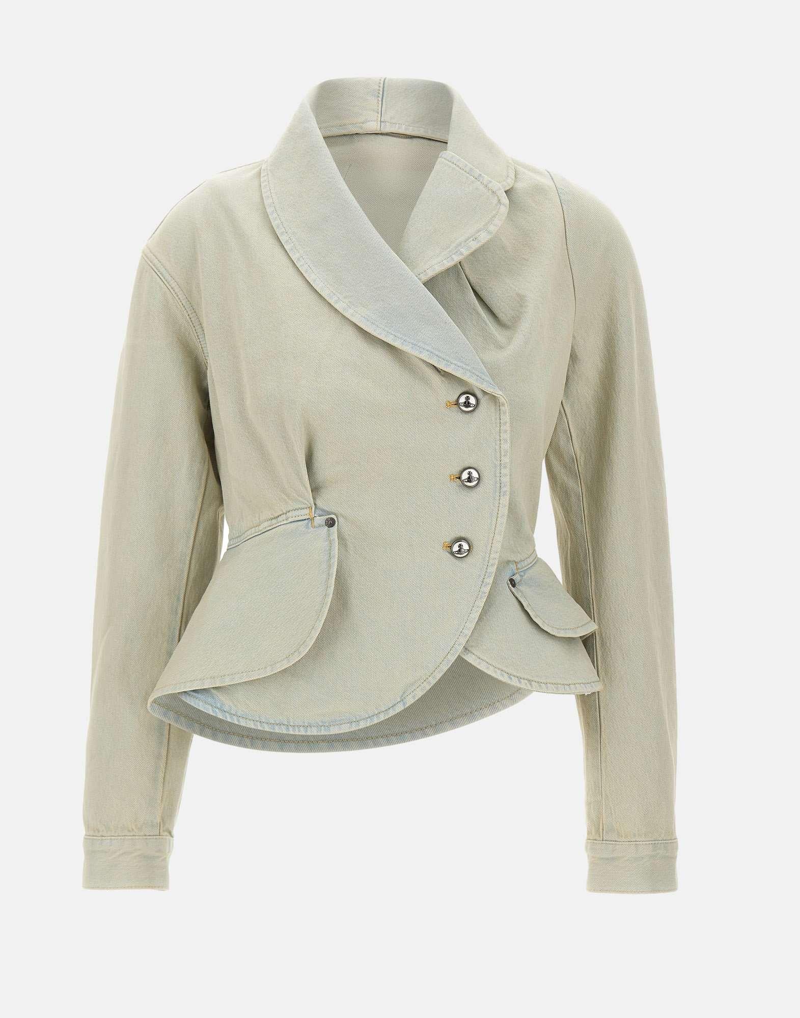 Giacca donna Vivienne Westwood “Stormy Denim” realizzata in morbido denim di cotone color celeste ingiallito, ispirata al vintage e progettata per modellare le forme con una linea definita. Il design si distingue per i revers oversize asimmetrici, dal carattere scultoreo, che danno personalità al capo. Presenta chiusura asimmetrica con bottoni perlati logati, orlo peplo e maniche lunghe aderenti con polsini rifiniti da bottone. Vestibilità slim. Made in Italy.