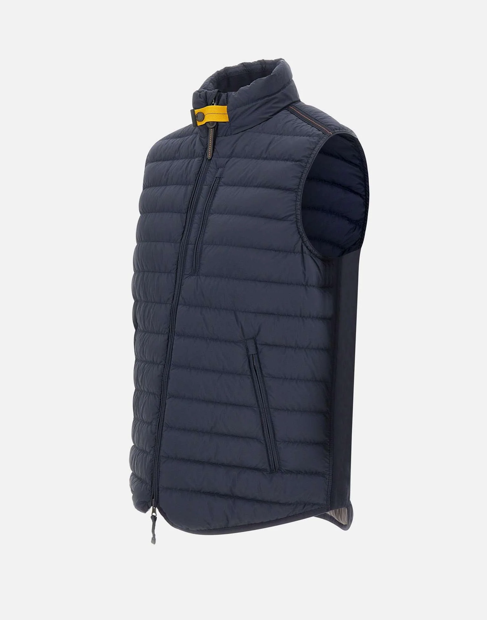 Gilet uomo Parajumpers “Perfect”, blu navy, in taffetà 100% poliestere a tenuta piuma con finitura opaca, trattamento idrorepellente, antivento e traspirante, imbottitura in piuma d’anatra, chiusura con zip a doppio cursore, tasche laterali con zip, tasca sul petto con zip verticale, tasca interna, giromanica e fondo in lycra, interno collo e inserti laterali in costine, dettagli iconici del brand come la fettuccia elastica gialla e il patch, imbottitura 90/10 piumino e piume.