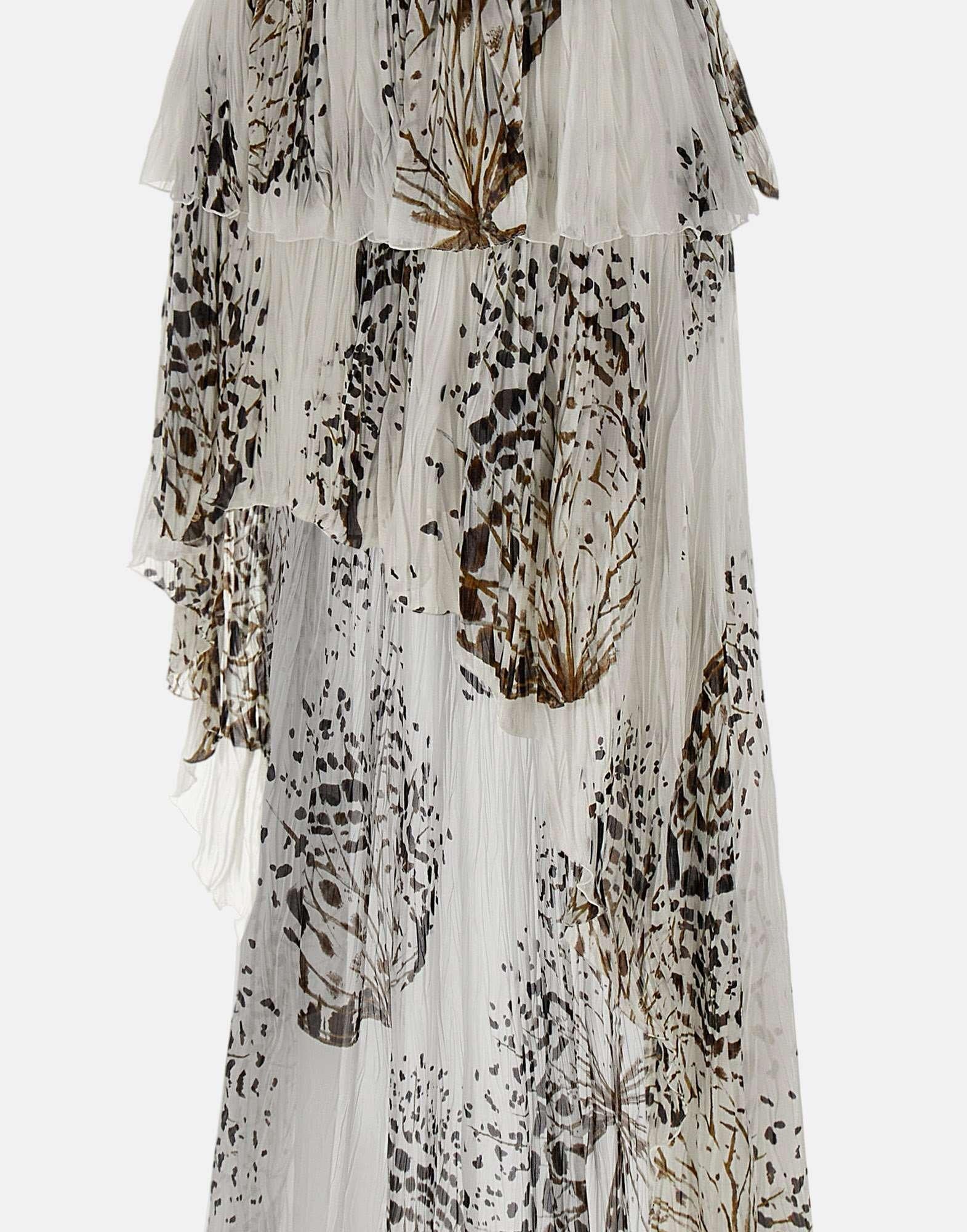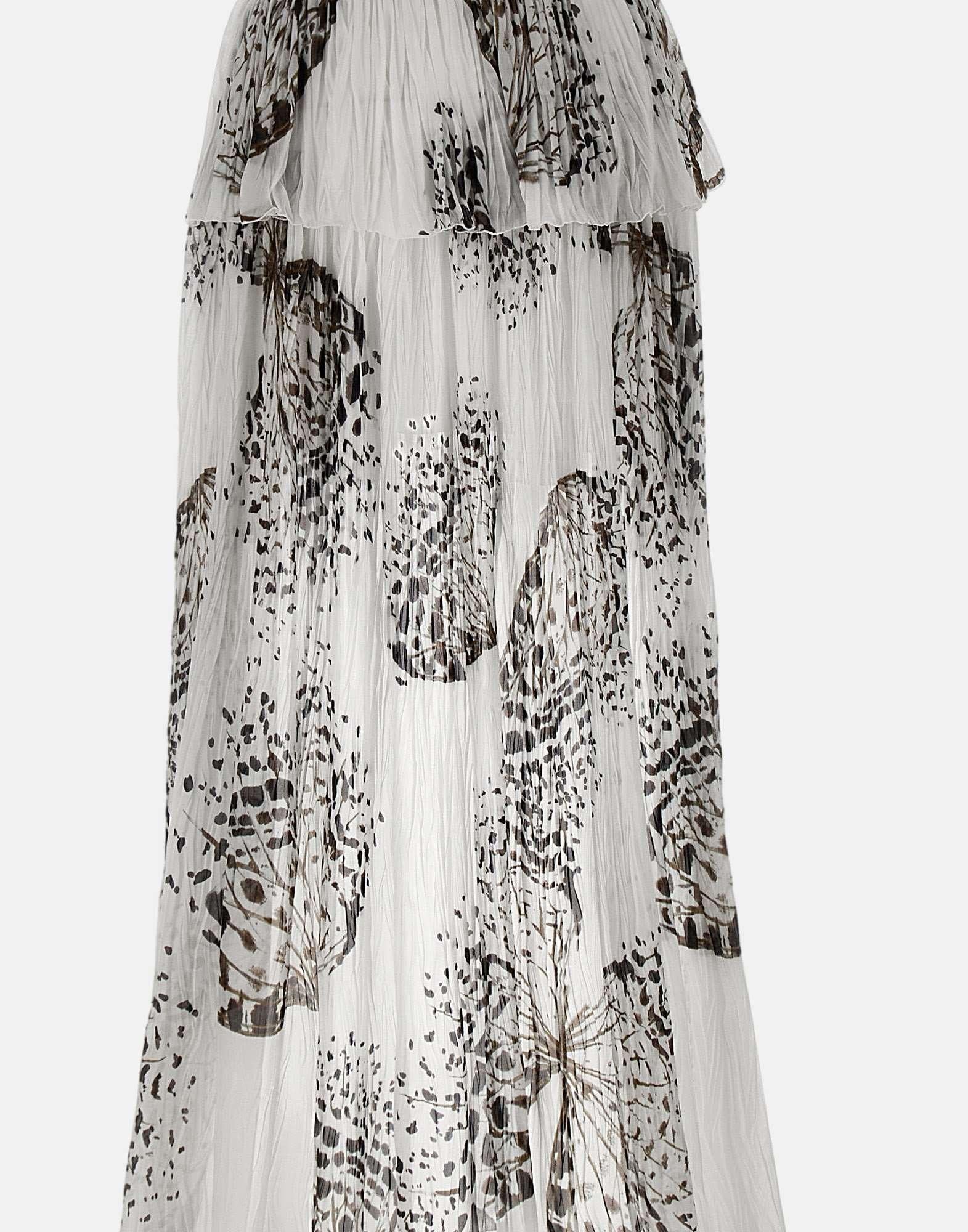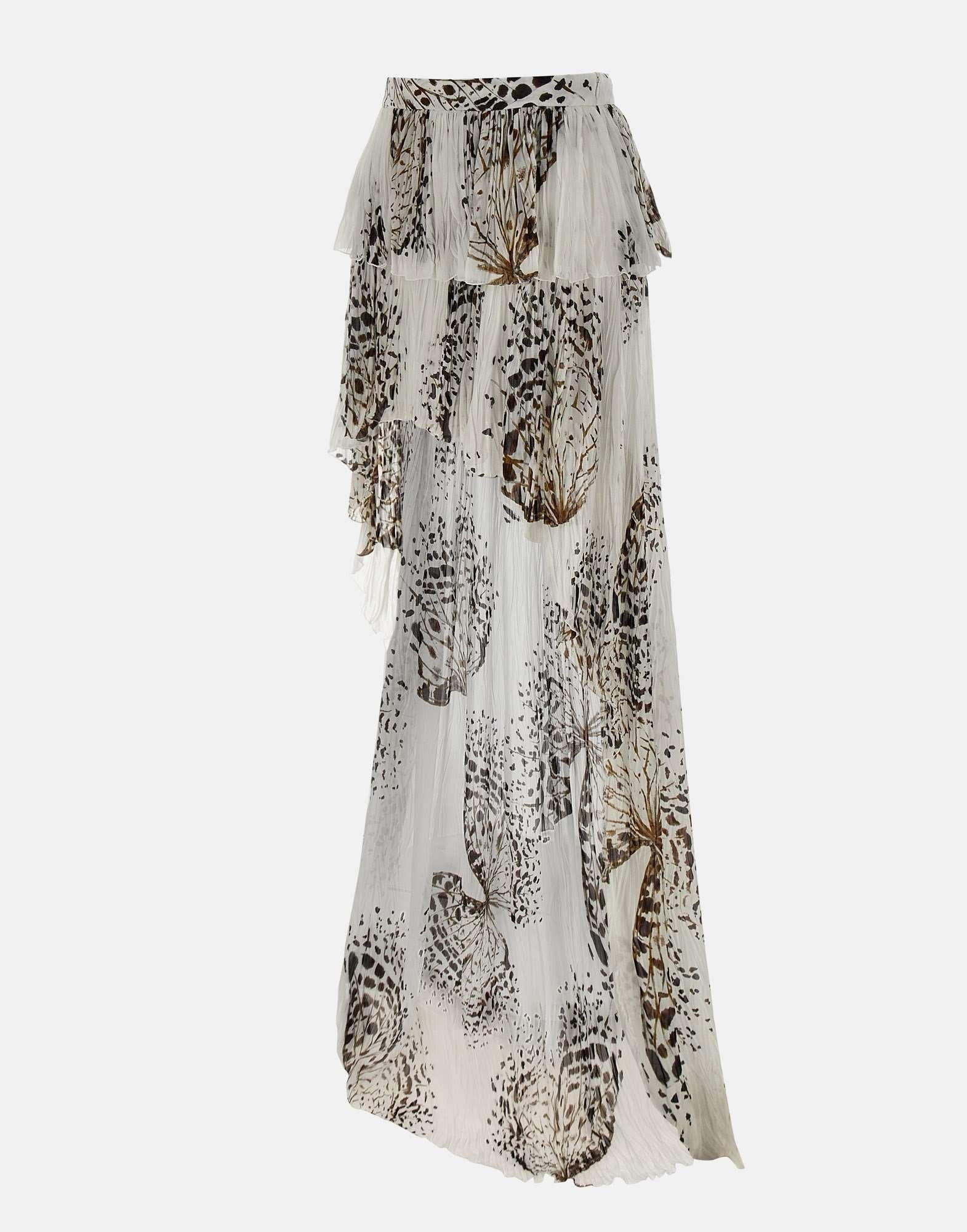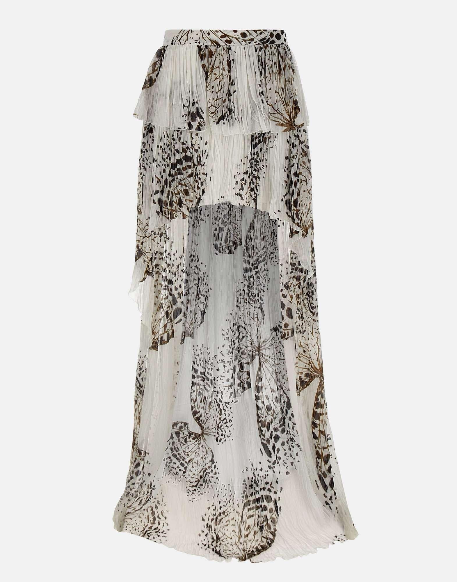 Gonna Blumarine realizzata in georgette color bianco con stampa farfalla marrone, caratterizzata da un design dinamico e femminile. Il modello presenta un taglio asimmetrico con lunghezza mini sul davanti e un breve strascico sul retro che dona movimento alla silhouette. La balza in vita fronte e retro aggiunge volume e definizione alla linea, mentre la chiusura con zip laterale nascosta mantiene il profilo pulito ed essenziale. Vestibilità regular fit. Made in Italy.