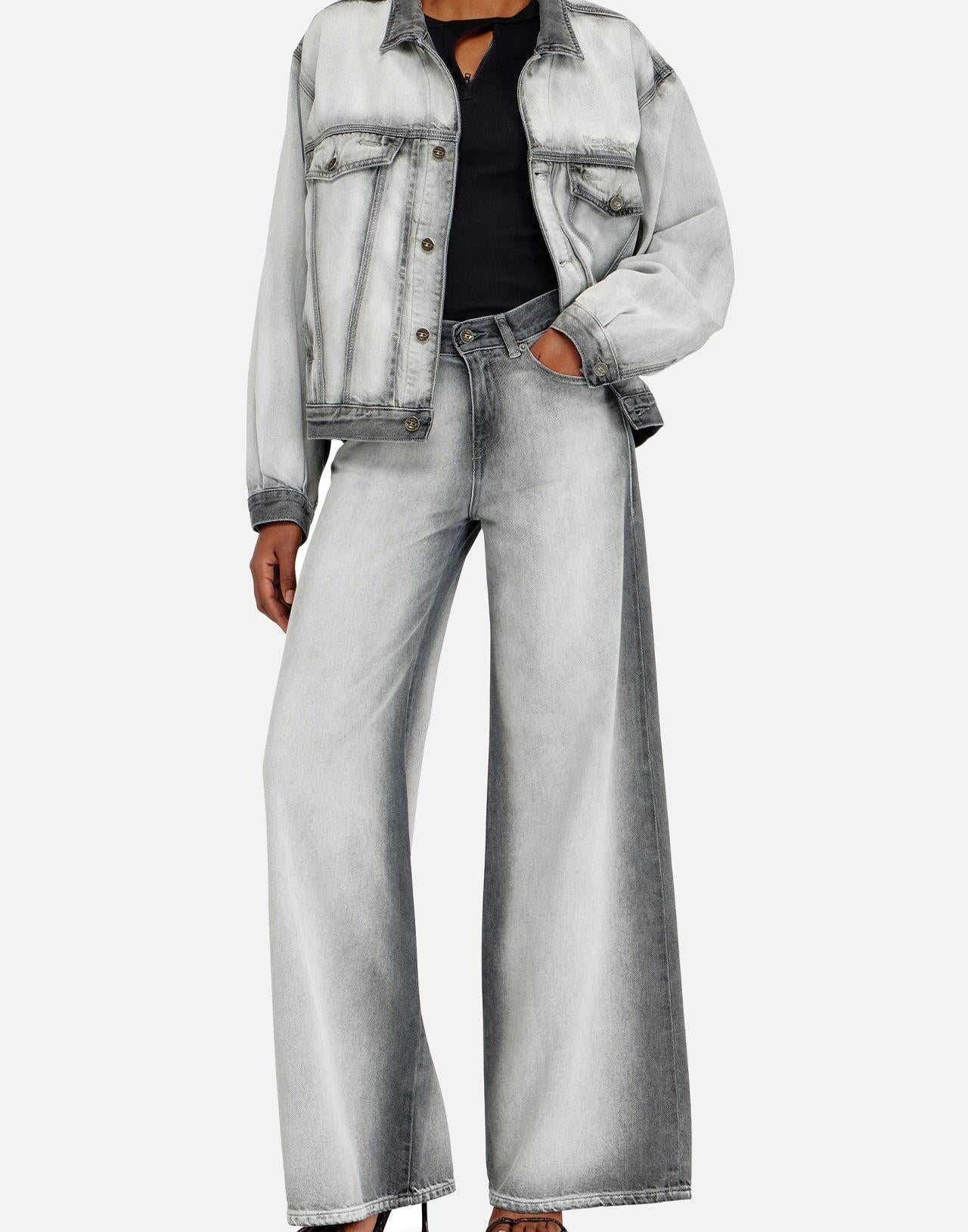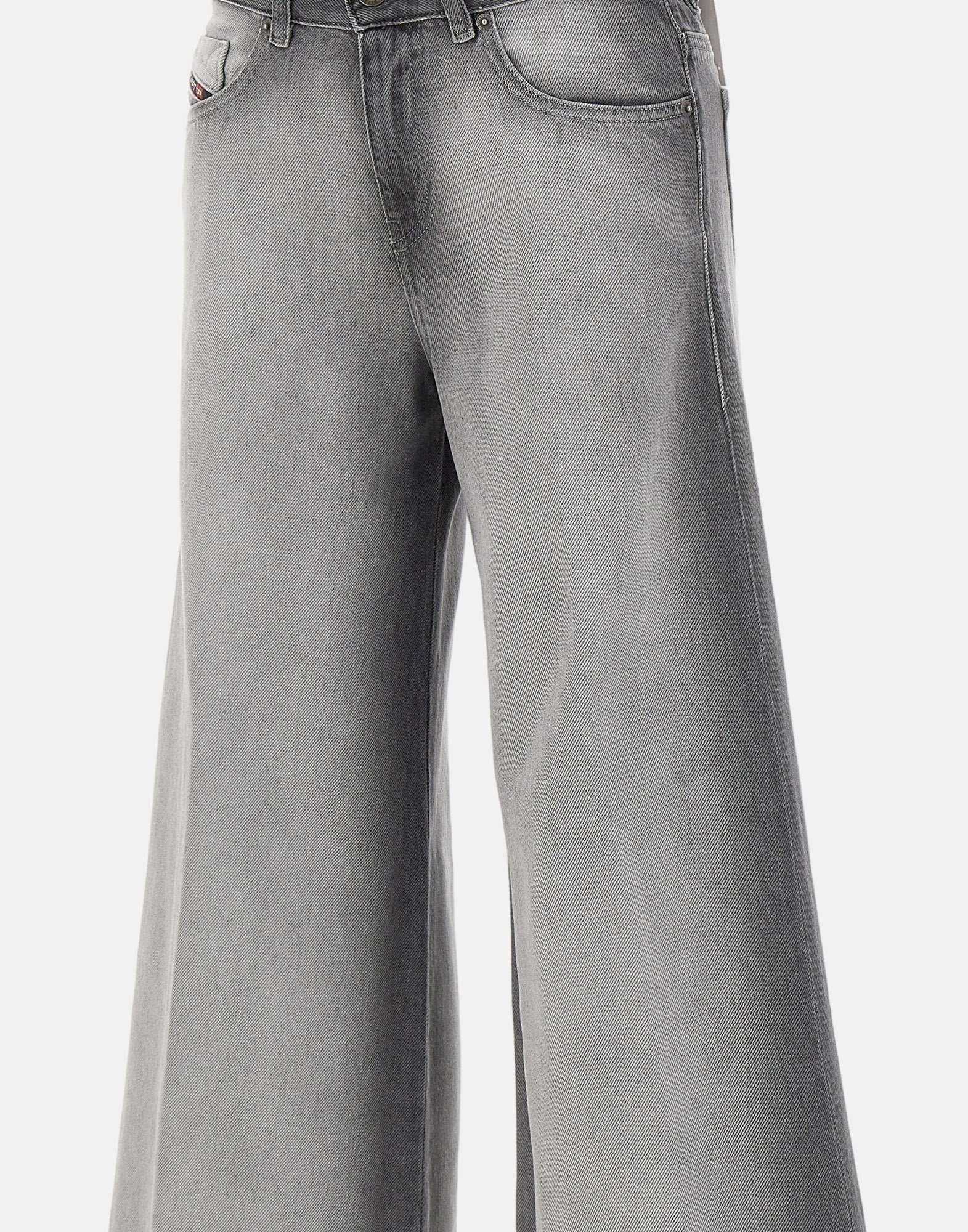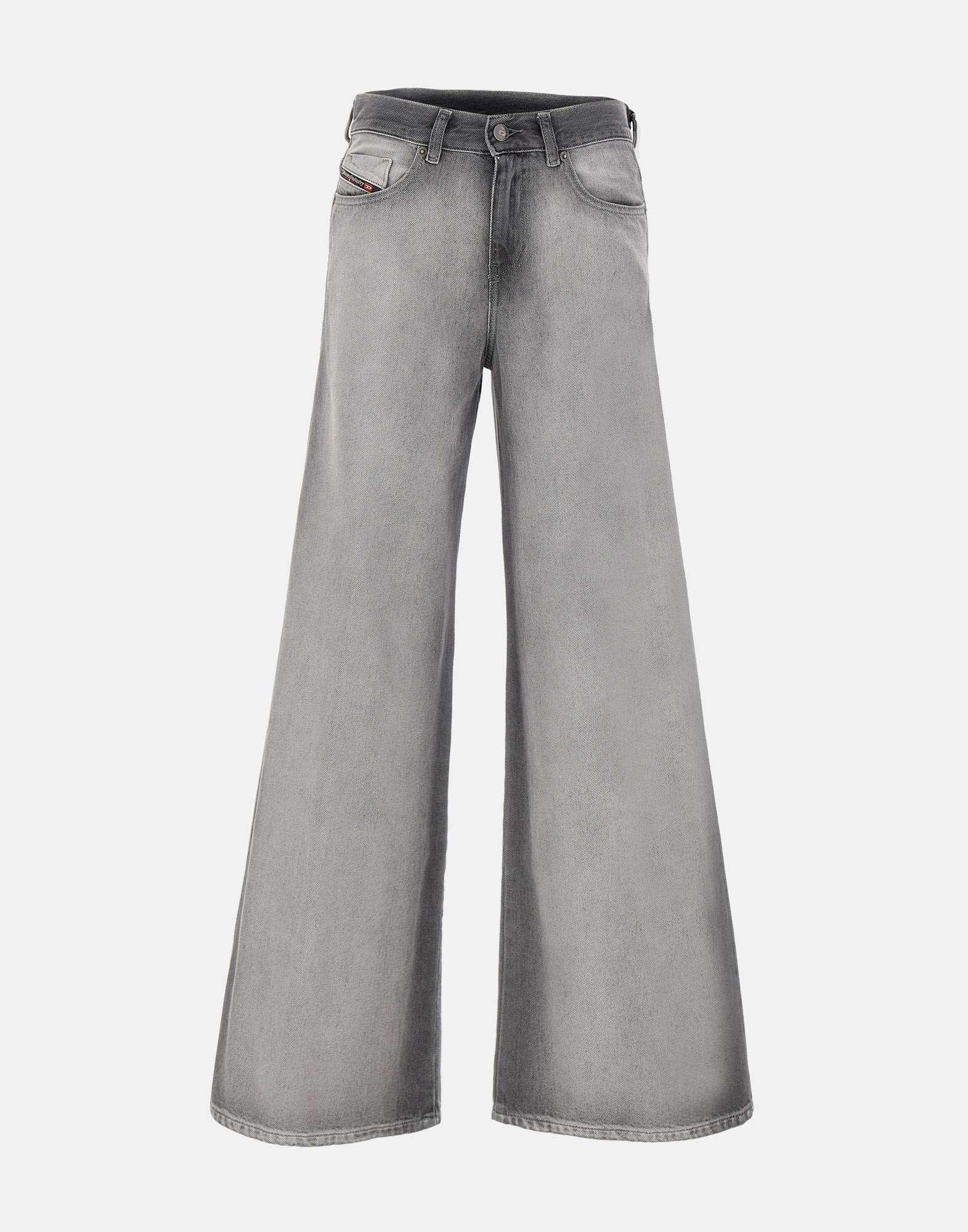 Jeans donna Diesel “1978 D-Akemi” realizzati in denim di cotone nei toni del grigio, con sfumature nere lungo le cuciture e in vita per un effetto deciso e contemporaneo. Il flared fit con vita media e gamba wide crea una silhouette iconica: aderente in vita e più morbida dalla coscia alla caviglia, un modello che non passa mai di moda. Classico cinque tasche, con chiusura con zip e bottone e patch logo sul retro della cintura. Ampiezza fondo: 33 cm.
