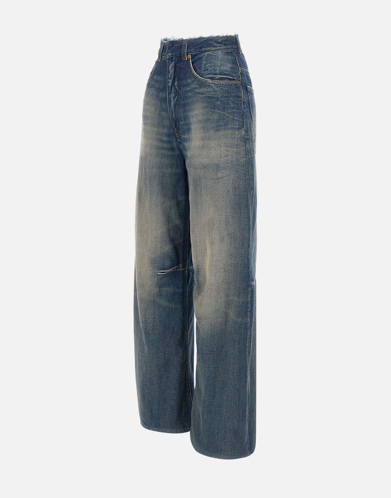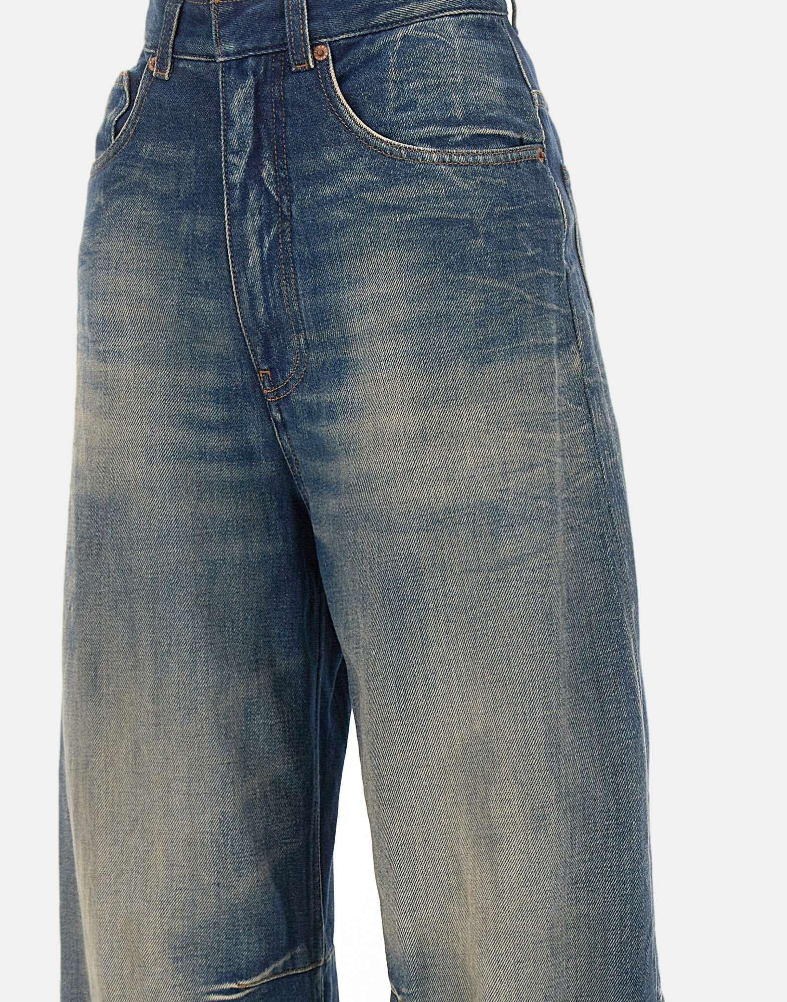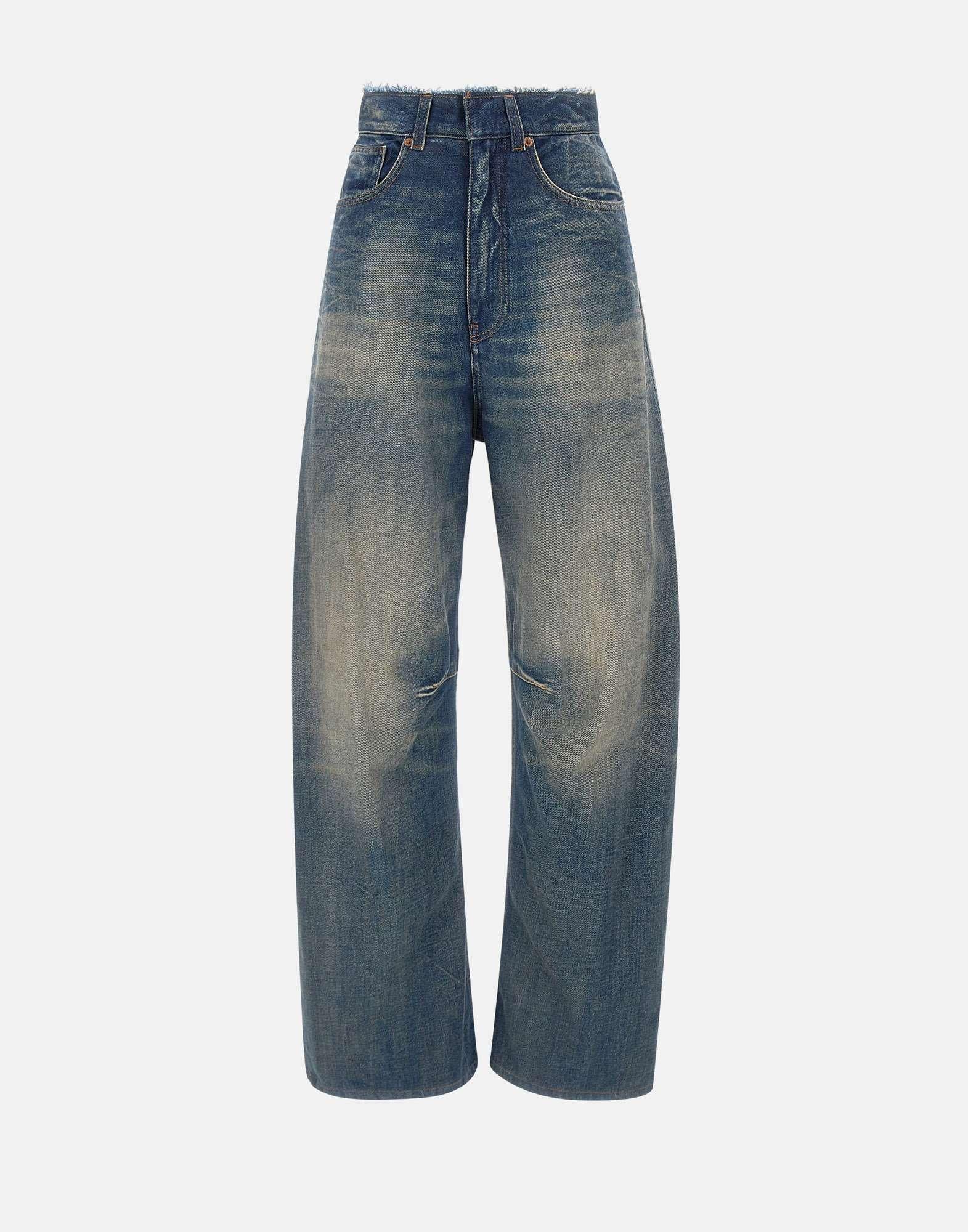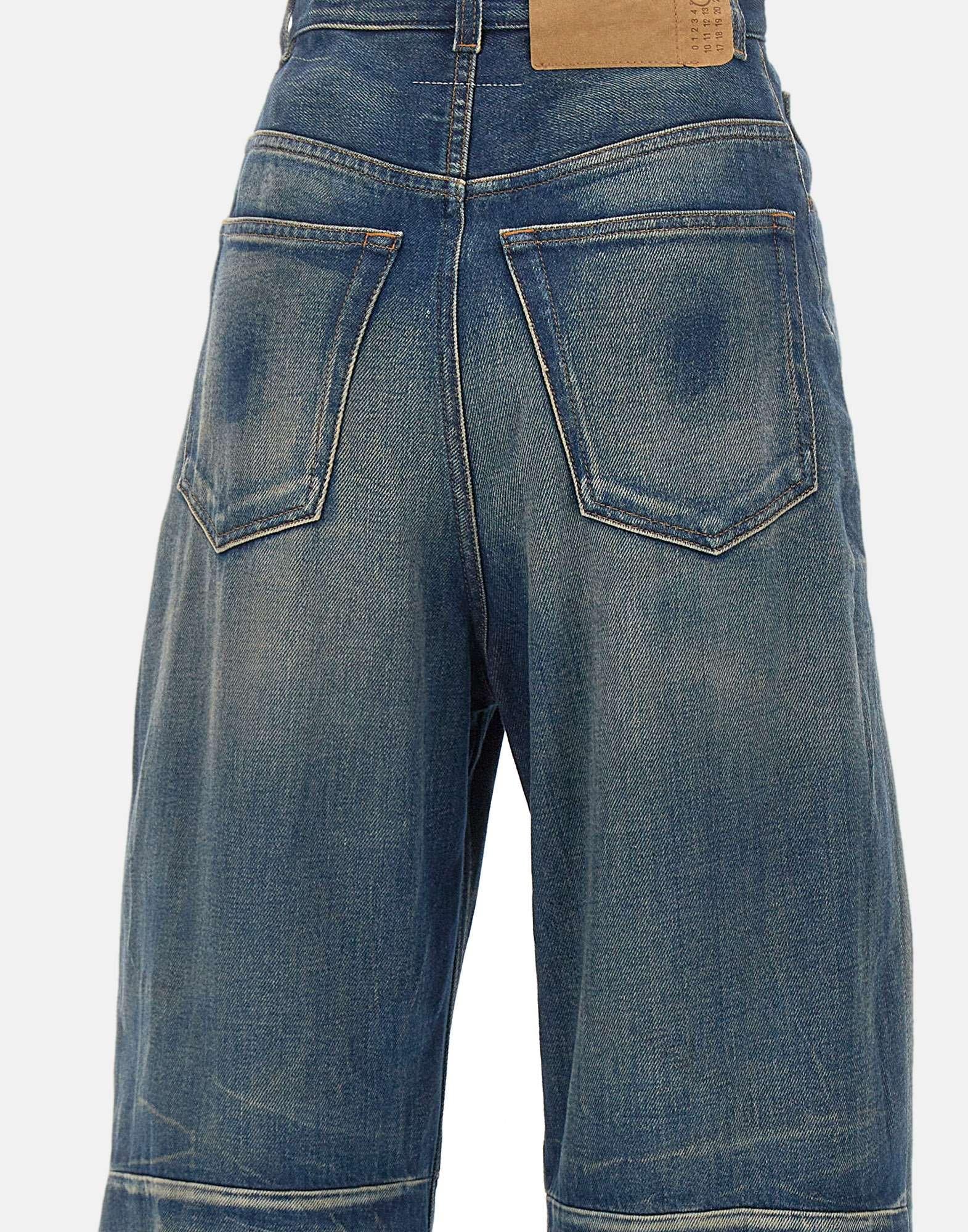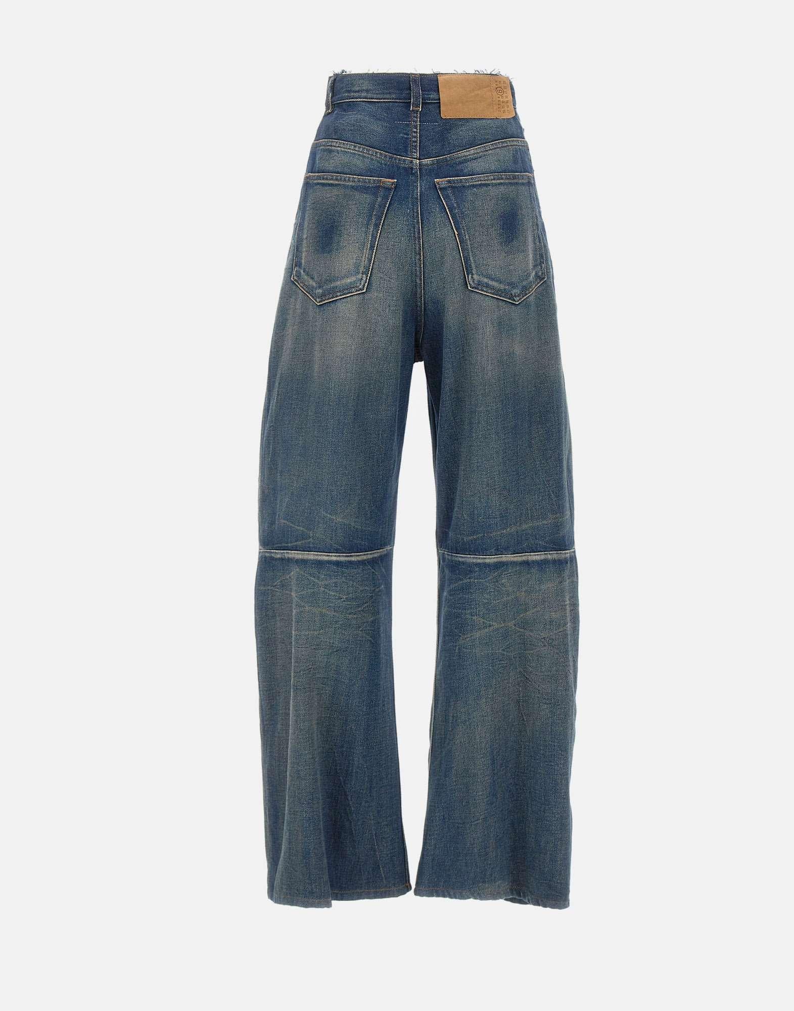 Jeans a gamba larga MM6 Maison Margiela in denim blu con sfumature vintage, reinterpretazione dellabbigliamento da lavoro con un tocco sofisticato. Realizzati in denim leggermente delavé con graffiature, presentano banda a taglio vivo in vita, cuciture orizzontali e costruzione a cinque tasche. Dettagli distintivi come i passanti per cintura, chiusura con zip e bottone, patch con logo numerico e liconica impuntura bianca sul retro completano il design. Fondo gamba 28 cm, interno gamba 75 cm (taglia26). Made in Italy. Vestibilità regular.