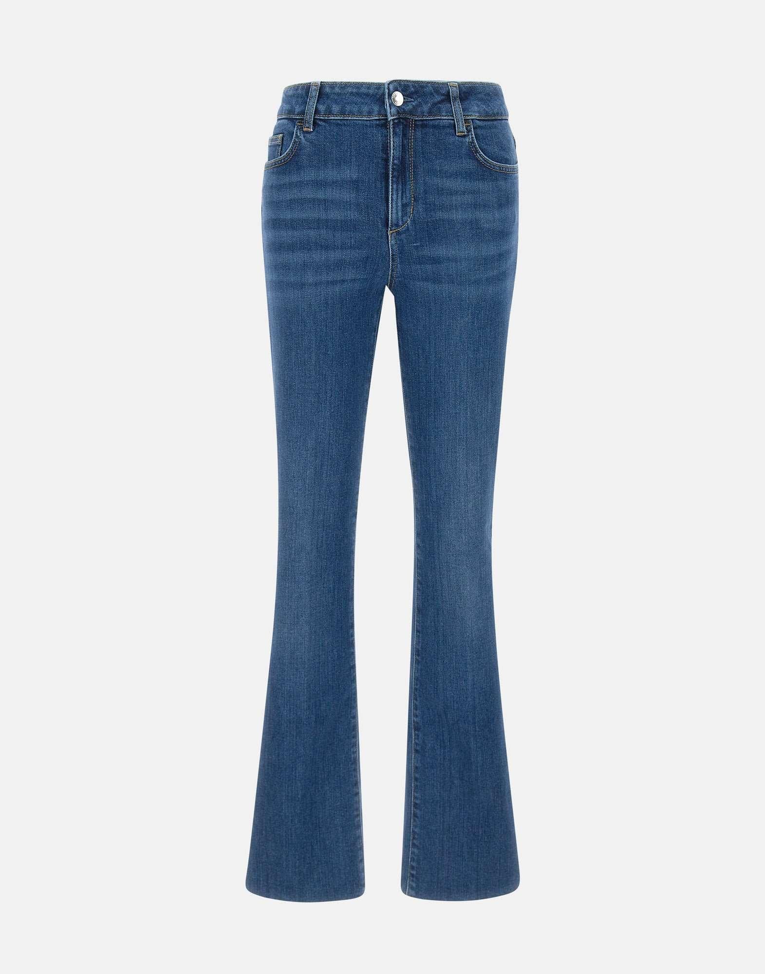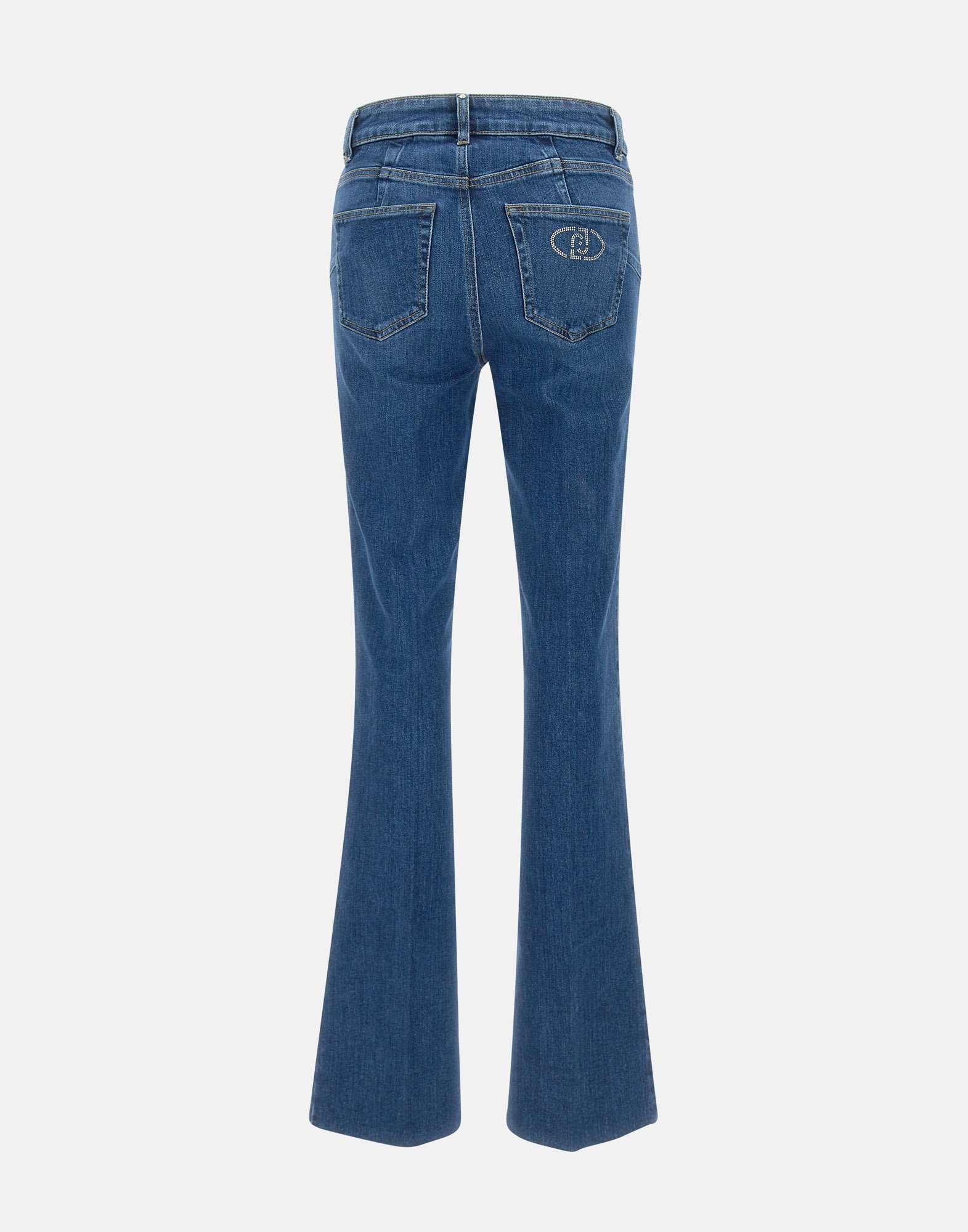 Jeans “Good repot” Liu-Jo, blu lavaggio scuro, tasca posteriore con strass, gamba leggermente a zampetta con fondo 18cm, tagli bottom up, taglio vivo, chiusura con zip e bottone, vita alta con passanti per cintura, cinque tasche. Bootcut slim fit. Lunghezza gamba: 85 cm