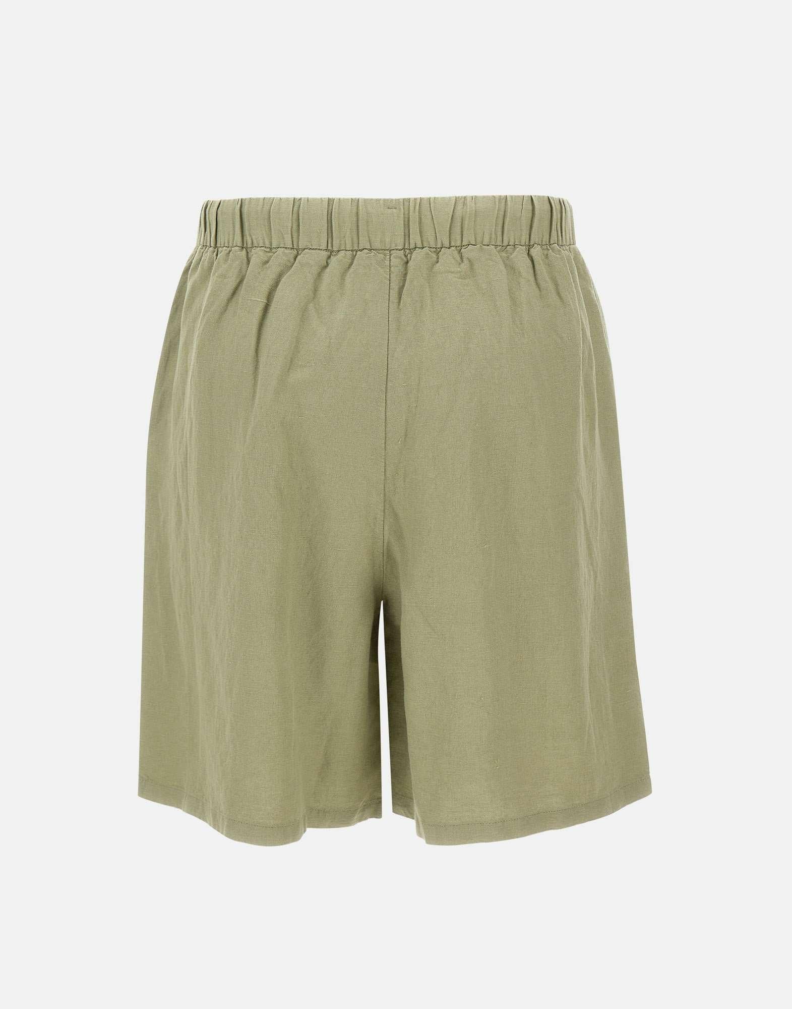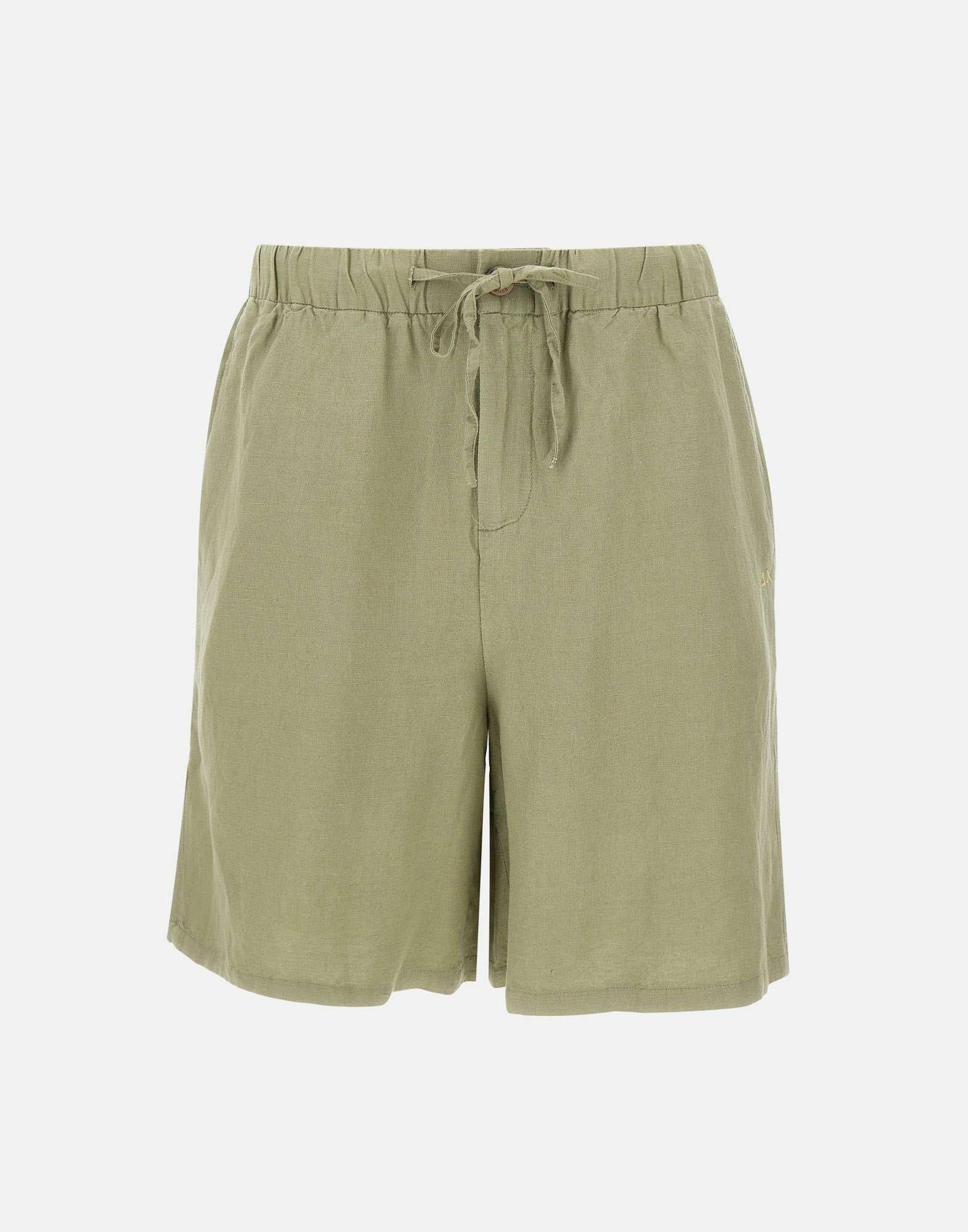 “Linen drawstring shorts” donna Sun68, verde salvia, tessuto misto lino e viscosa, chiusura con bottone e zip, tasche laterali a filo, vita elasticata con coulisse, logo a ricamo, regular fit.