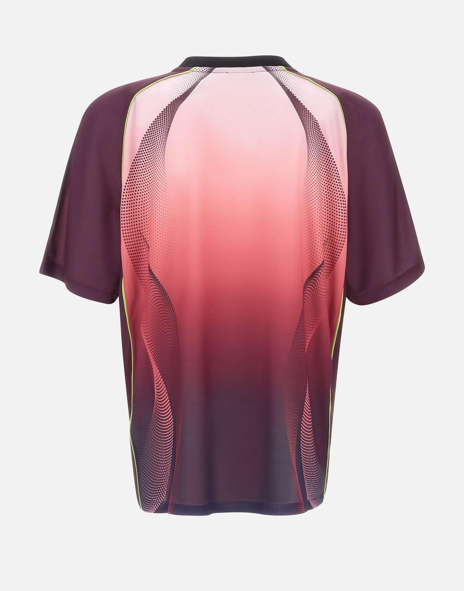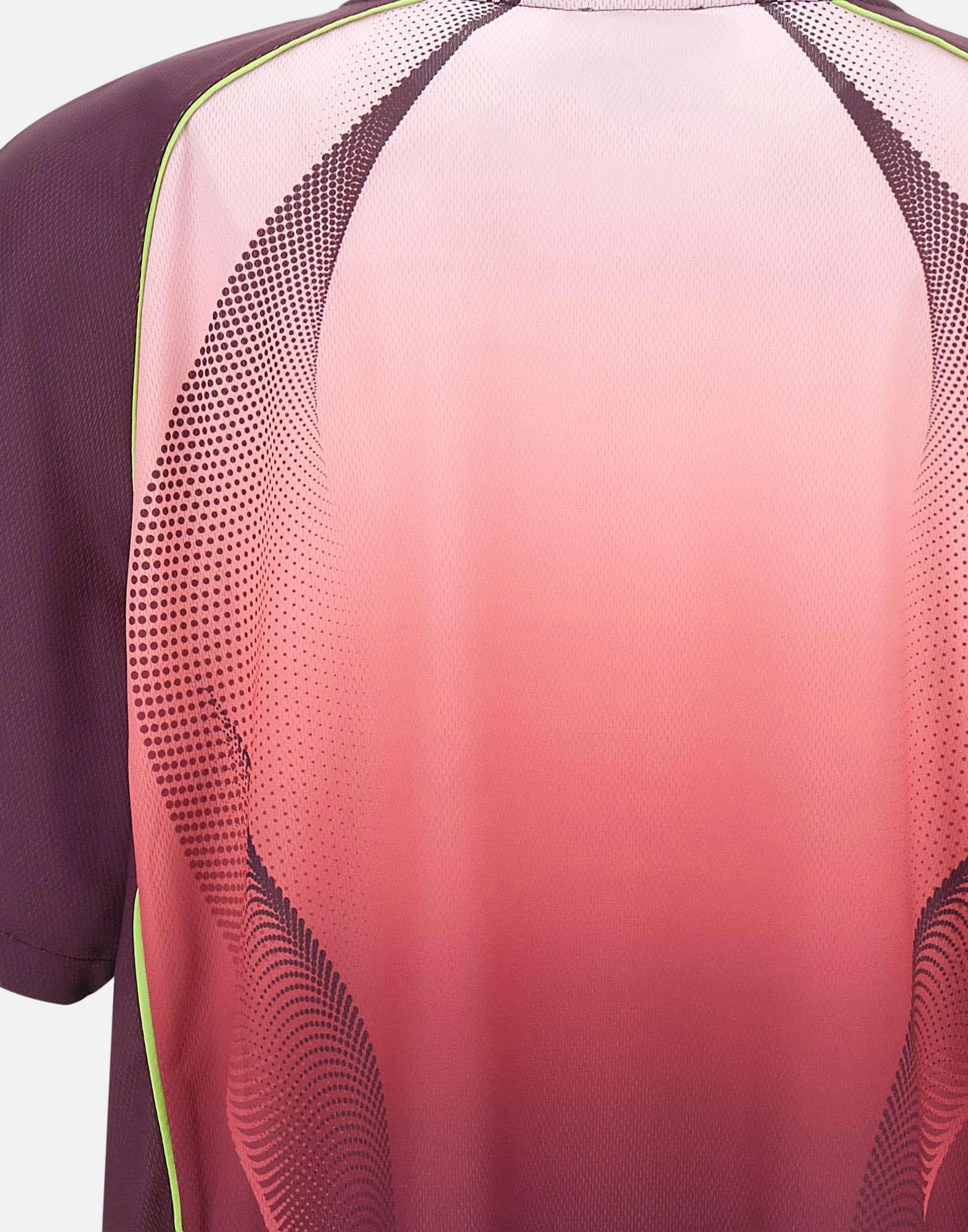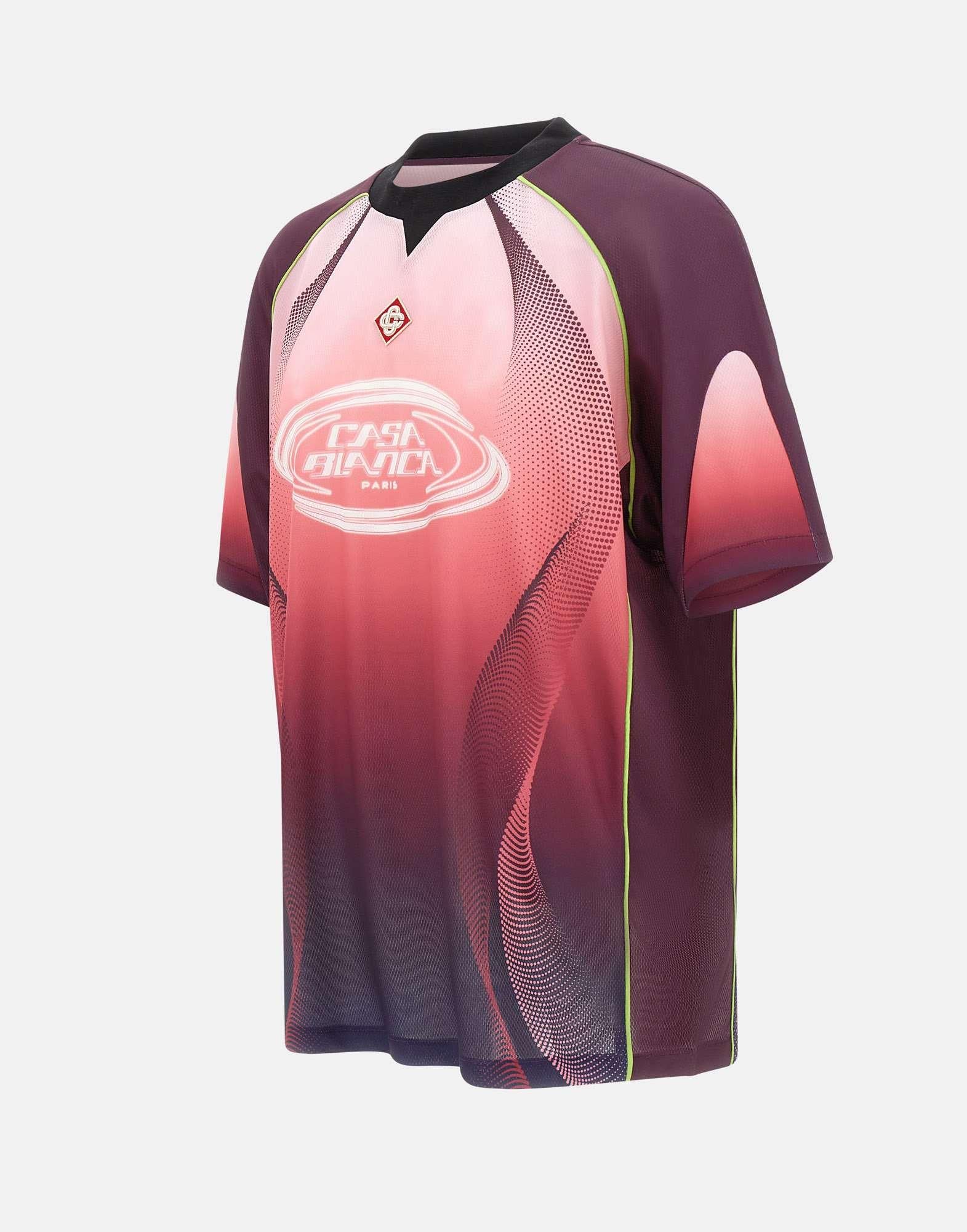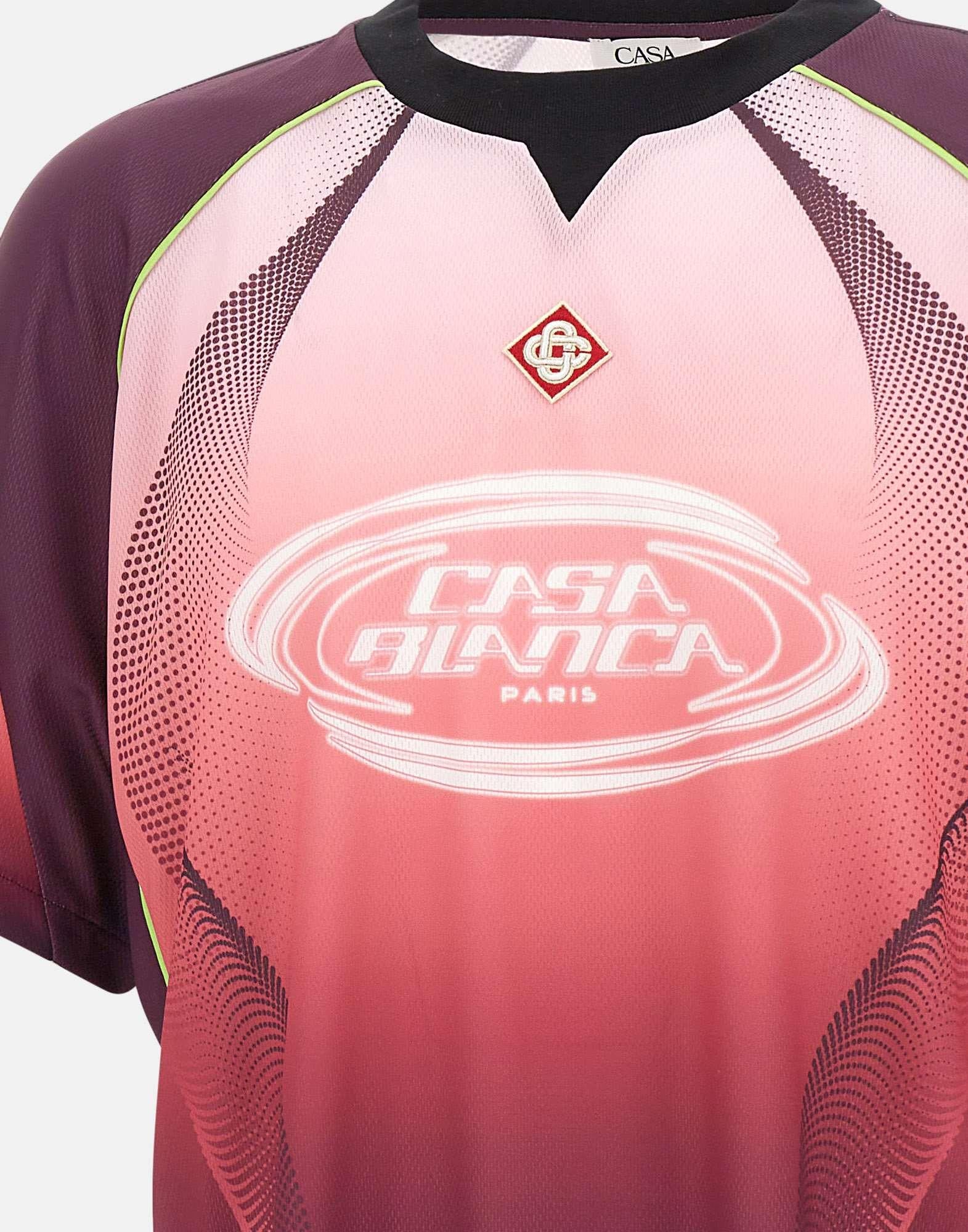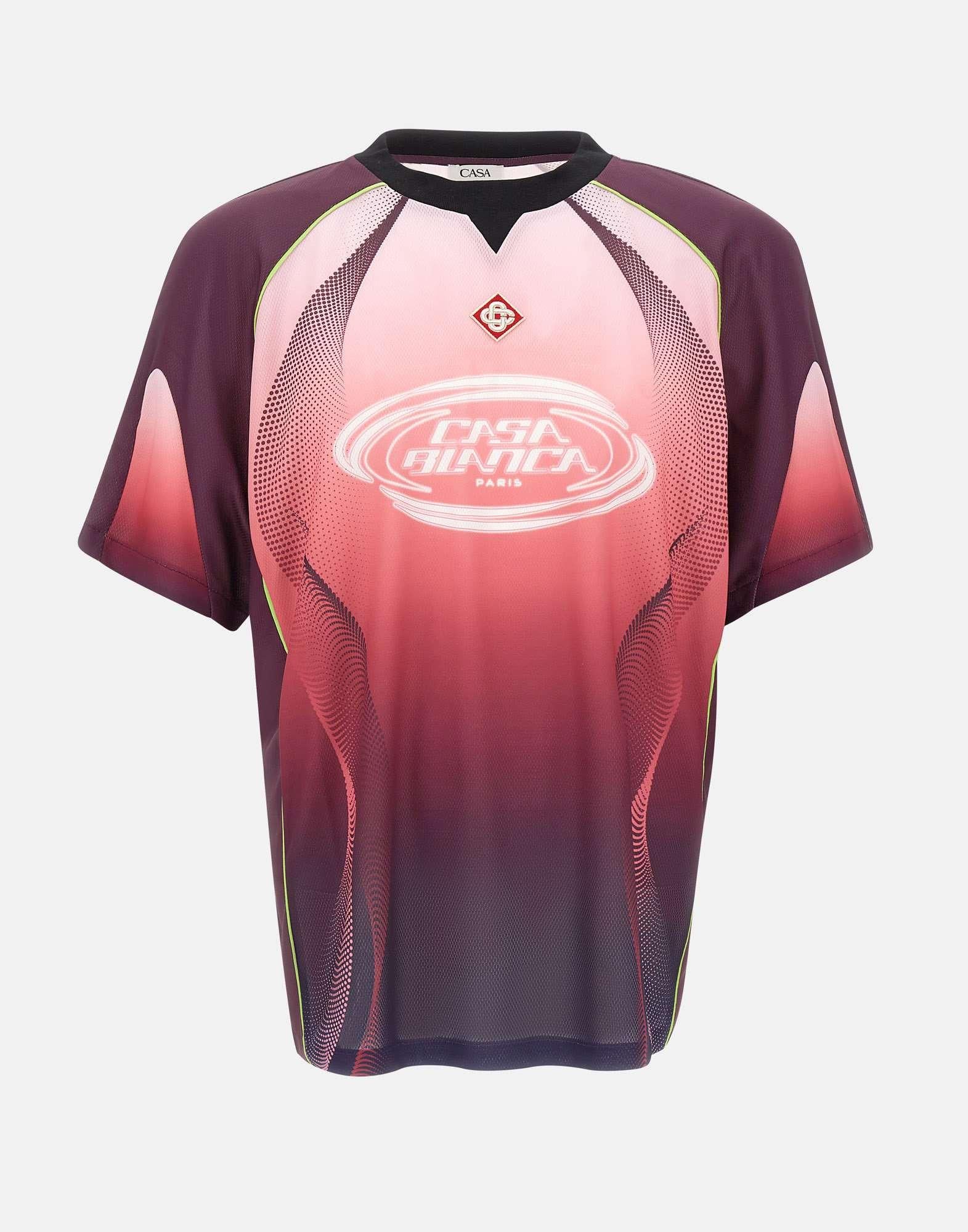 T-shirt uomo Casablanca realizzata in tessuto a rete stampato a occhio di pernice con grafica sfumata dal rosa al color melanzana, pensata per un look contemporaneo dal gusto luxury. Questo modello richiama una maglia da calcio a maniche corte, con un design raffinato e dettagli distintivi della maison. Sul petto troviamo il logo Casablanca stampato e la toppa con logo a diamante, simbolo iconico del brand. Il girocollo a costine in contrasto nero definisce la linea con un tocco grafico deciso. La vestibilità slim valorizza la silhouette, rendendo questa t-shirt ideale per outfit casual ricercati.