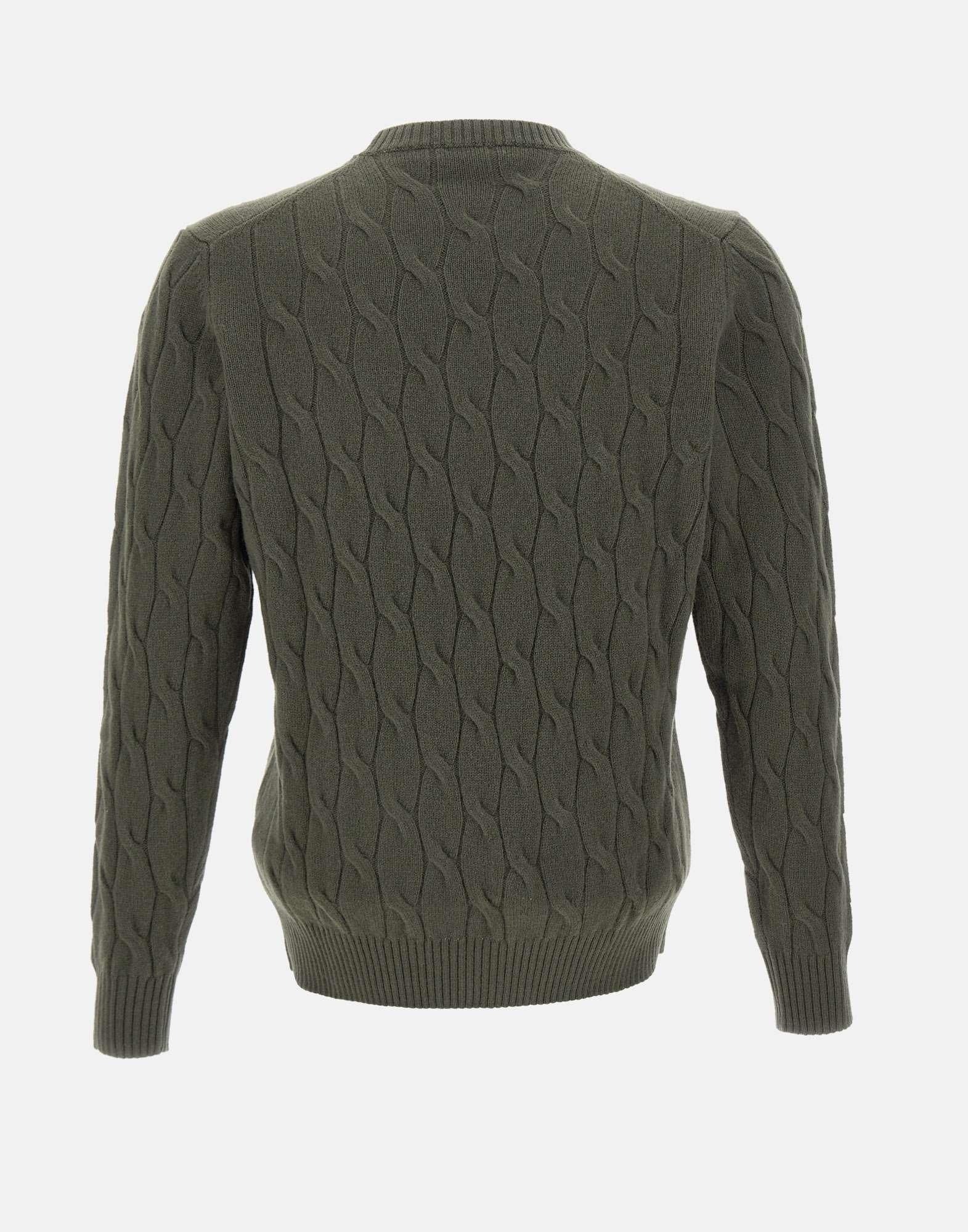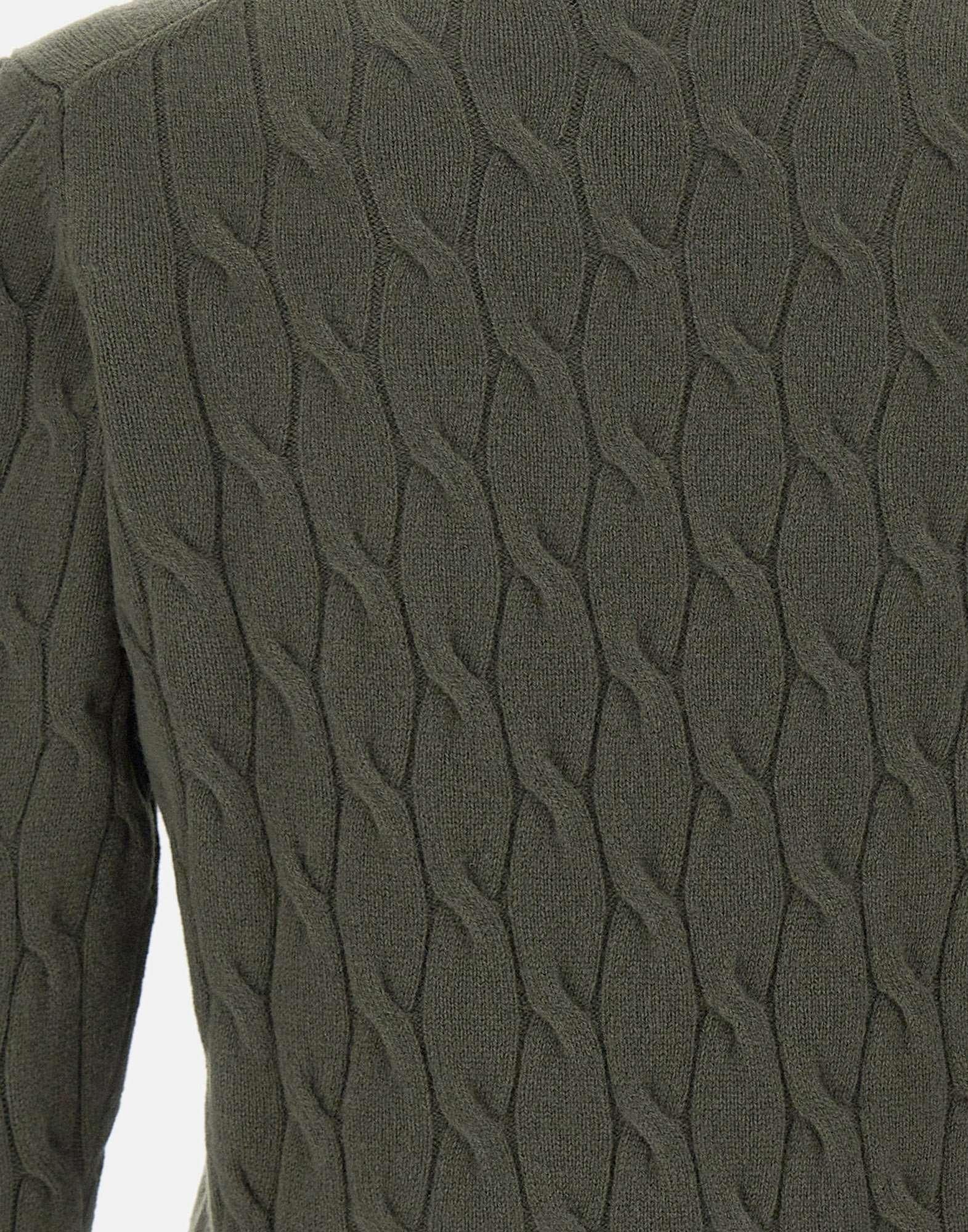 Maglia uomo Filippo De Laurentiis in misto lana e cashmere, color verde militare, con raffinata lavorazione a treccia. Girocollo classico con polsini, collo e orlo a costine. Il filato pregiato assicura calore e morbidezza, mentre la texture intrecciata aggiunge un tocco di dinamismo e carattere. Vestibilità slim per un look essenziale e sofisticato. Un capo che unisce tradizione artigianale e stile contemporaneo. Made in Italy.