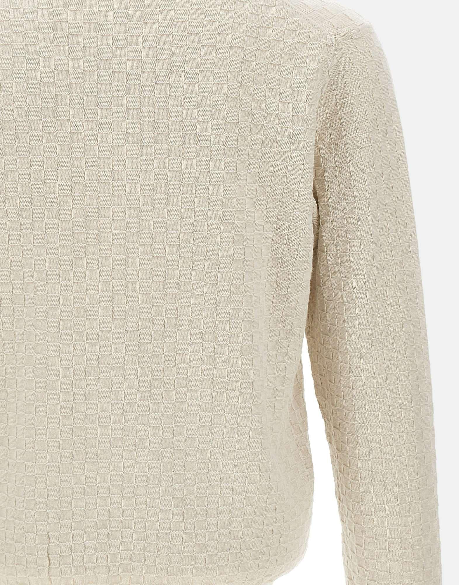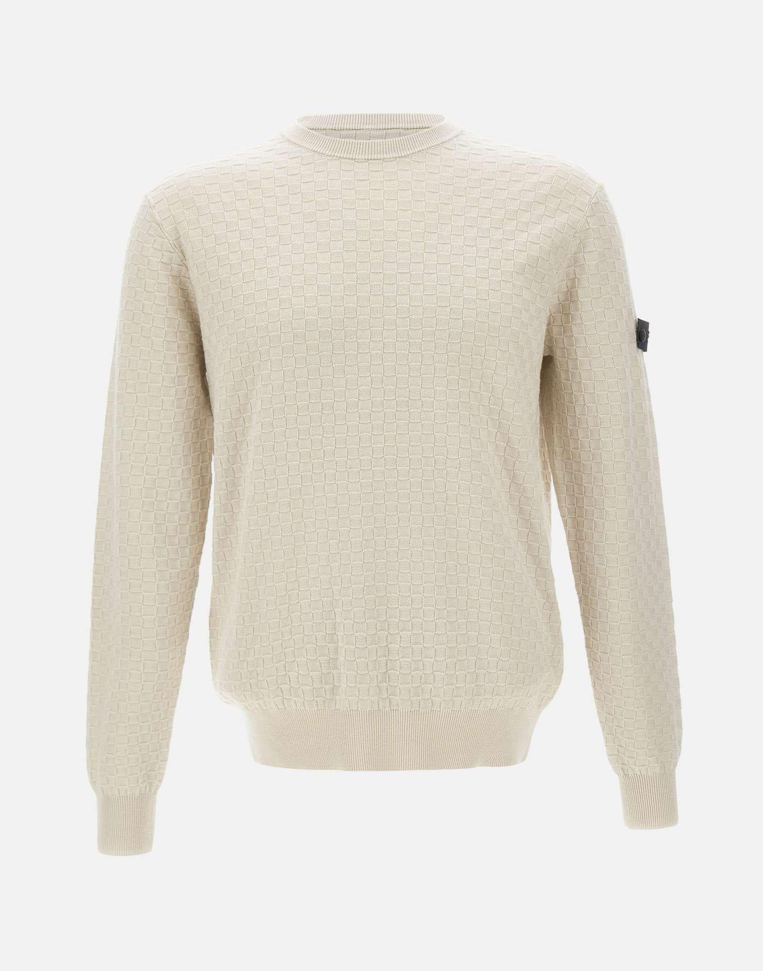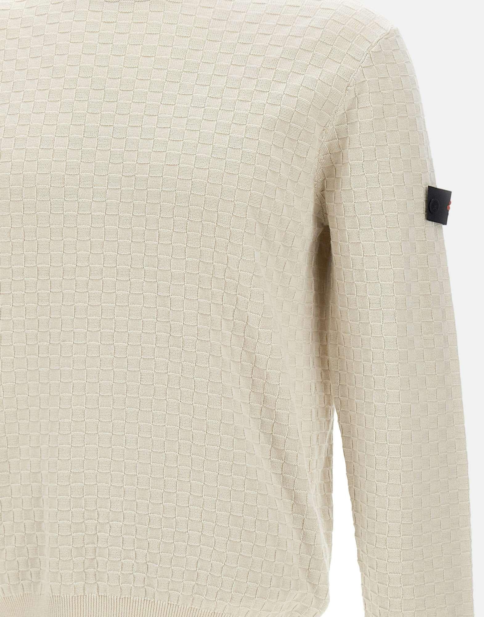 Maglia uomo Peuterey “Omnium” realizzata in cotone color panna con trama a quadri effetto intreccio che dona struttura e personalità al design. Questa maglia presenta girocollo, maniche lunghe e finiture a costine su fondo, polsini e collo che definiscono la linea con equilibrio e precisione. Il patch logo applicato sulla manica sinistra aggiunge un dettaglio distintivo coerente con l’identità del brand. La vestibilità regolare assicura comfort e versatilità, rendendo questa maglia ideale per la stagione e per look casual contemporanei.