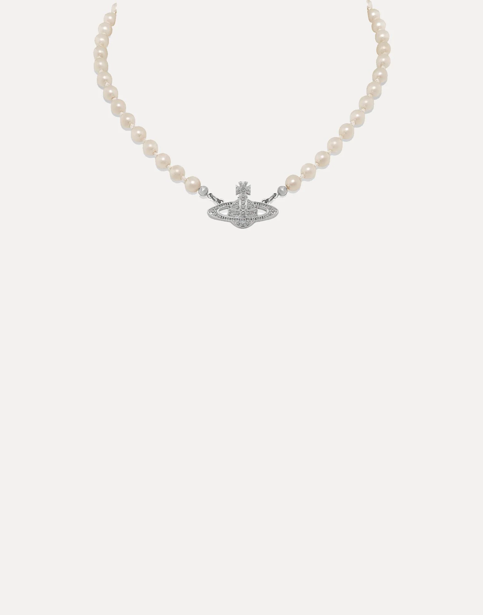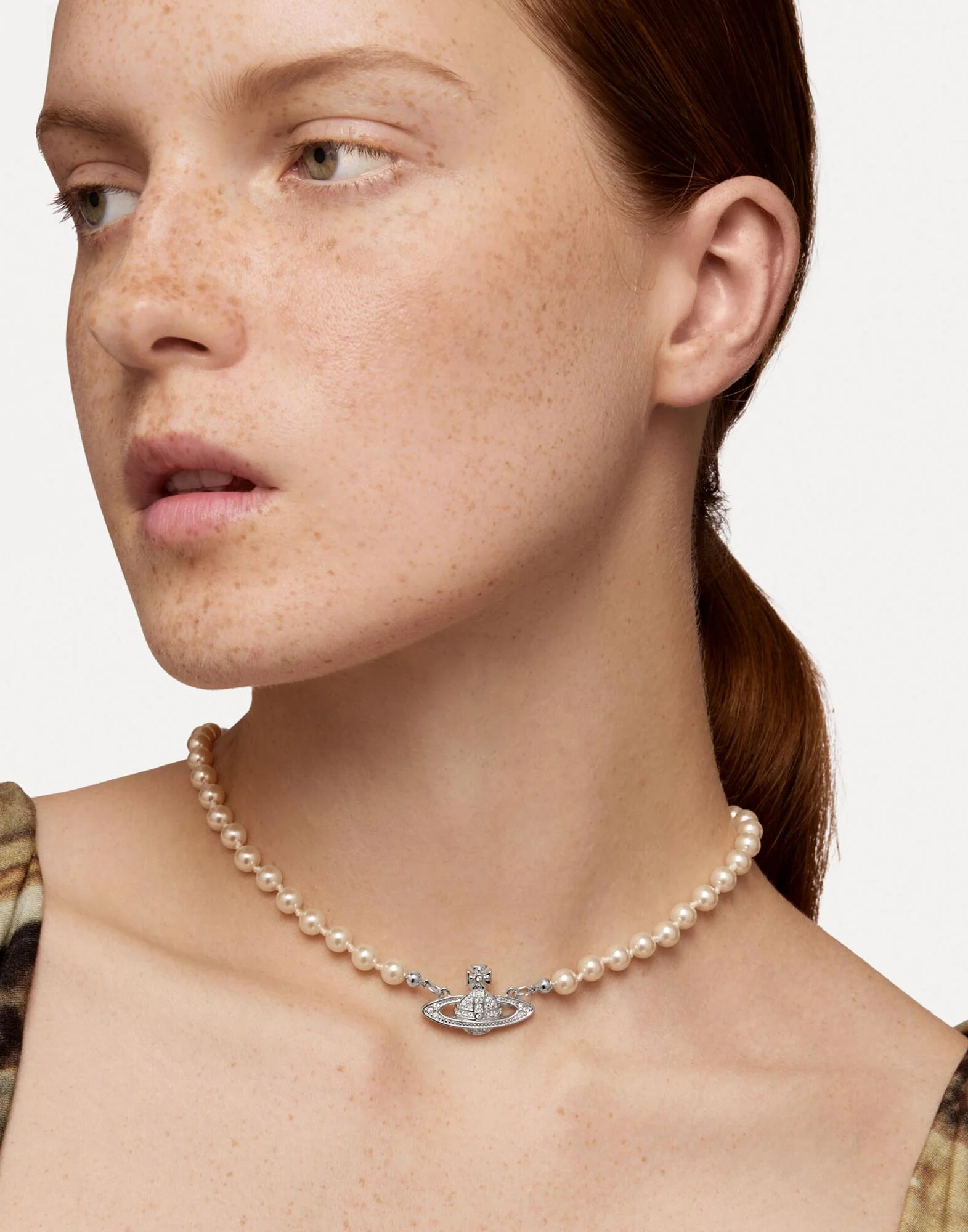 “Mini Bas Relief Pearl Choker” Vivienne Westwood, placcatura argentata, maxi perle, dettagli in cristallo, chiusura a moschettone.Peso: 19,65 g.