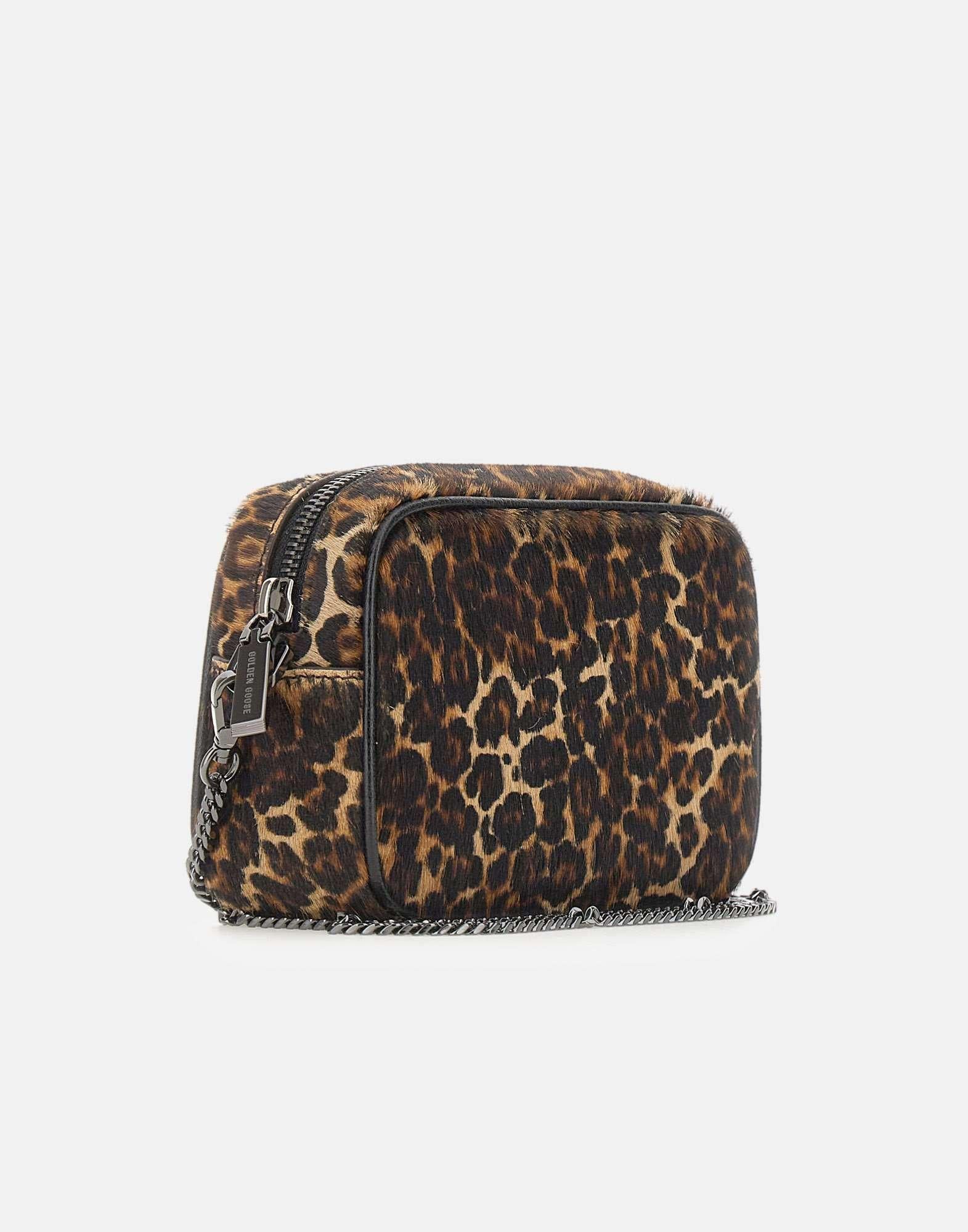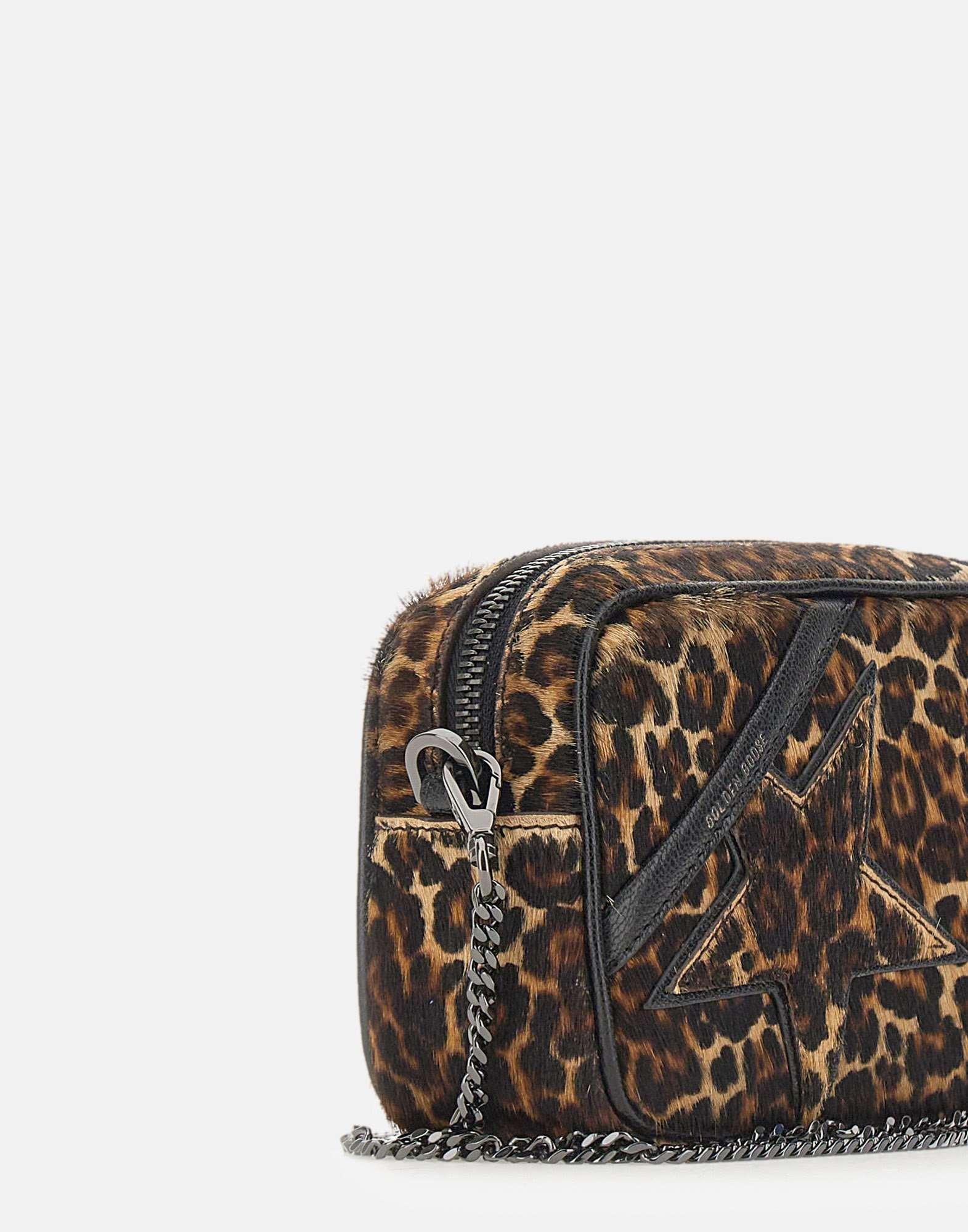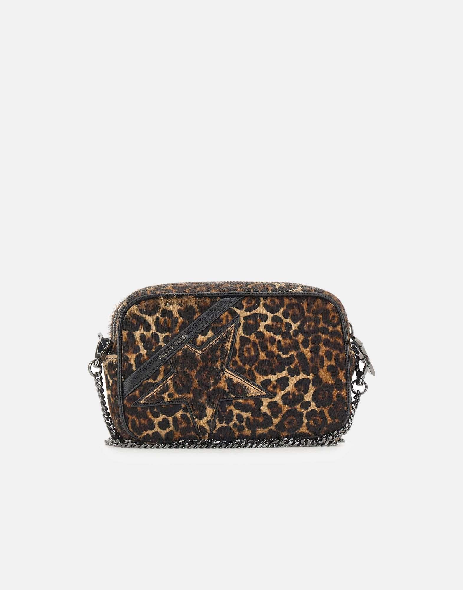 Borsa a tracolla donna Golden Goose “Mini star bag” realizzata in cavallino con stampa animalier nei toni del marrone, beige e nero. Il design richiama le classiche camera bag ed è caratterizzato da stella ton sur ton sul fronte, per una firma discreta e distintiva. All’esterno presenta logo stampato su una striscia di pelle diagonale, mentre all’interno è presente un taschino applicato. Dettagli metallici in finitura ruthenium color argento, chiusura superiore con zip e tracolla removibile in catena. Include dust bag. Made in Italy. Dimensioni: 16x10x6 cm.