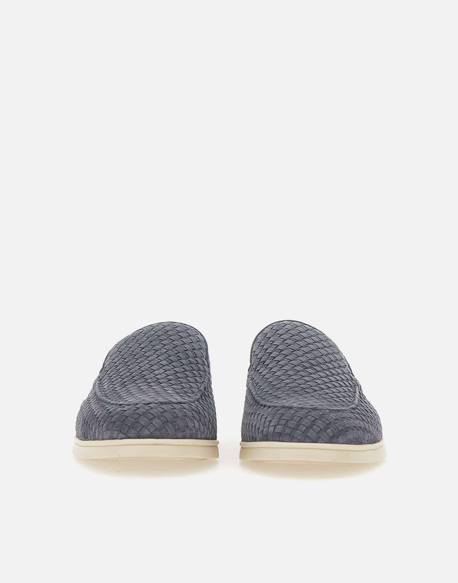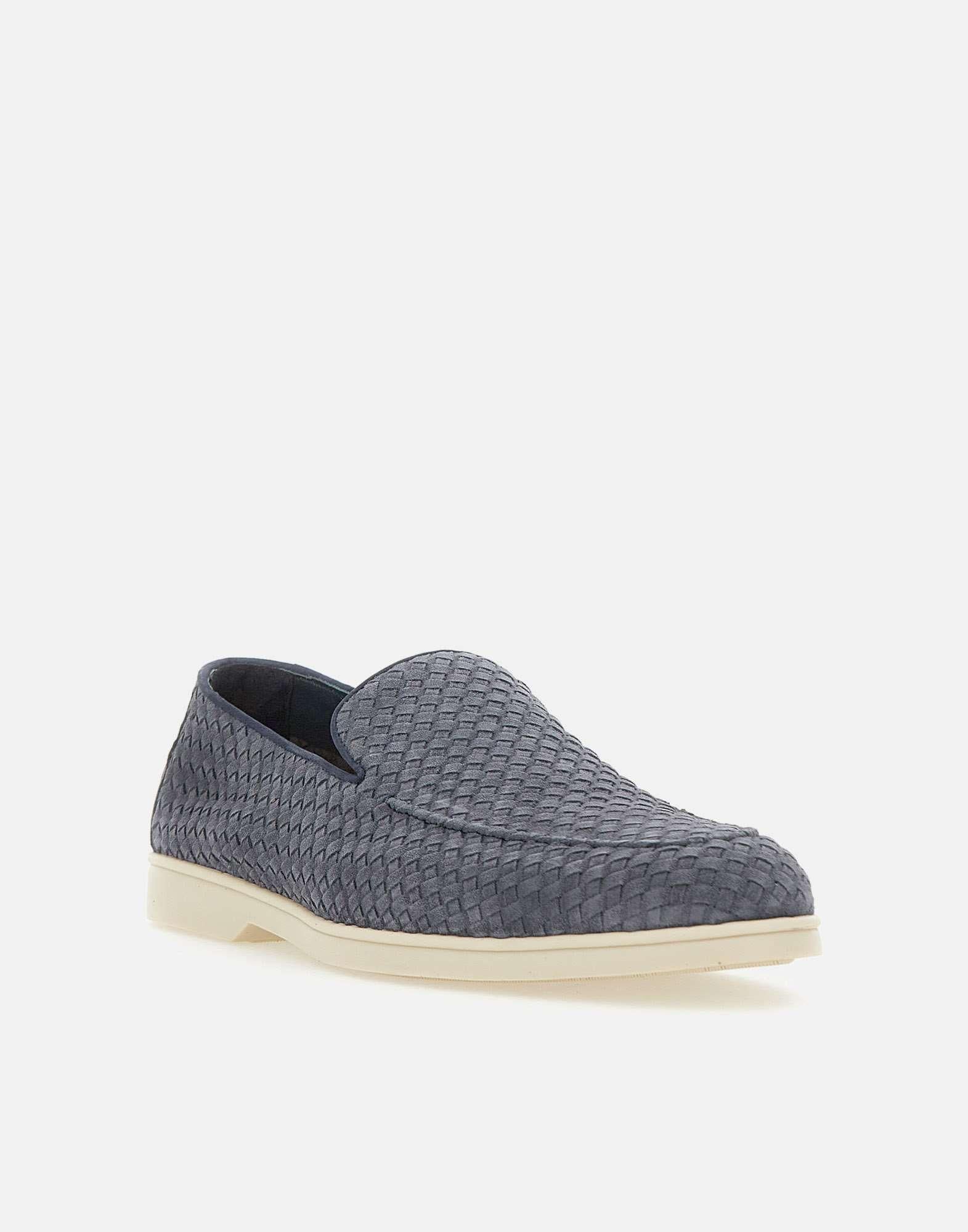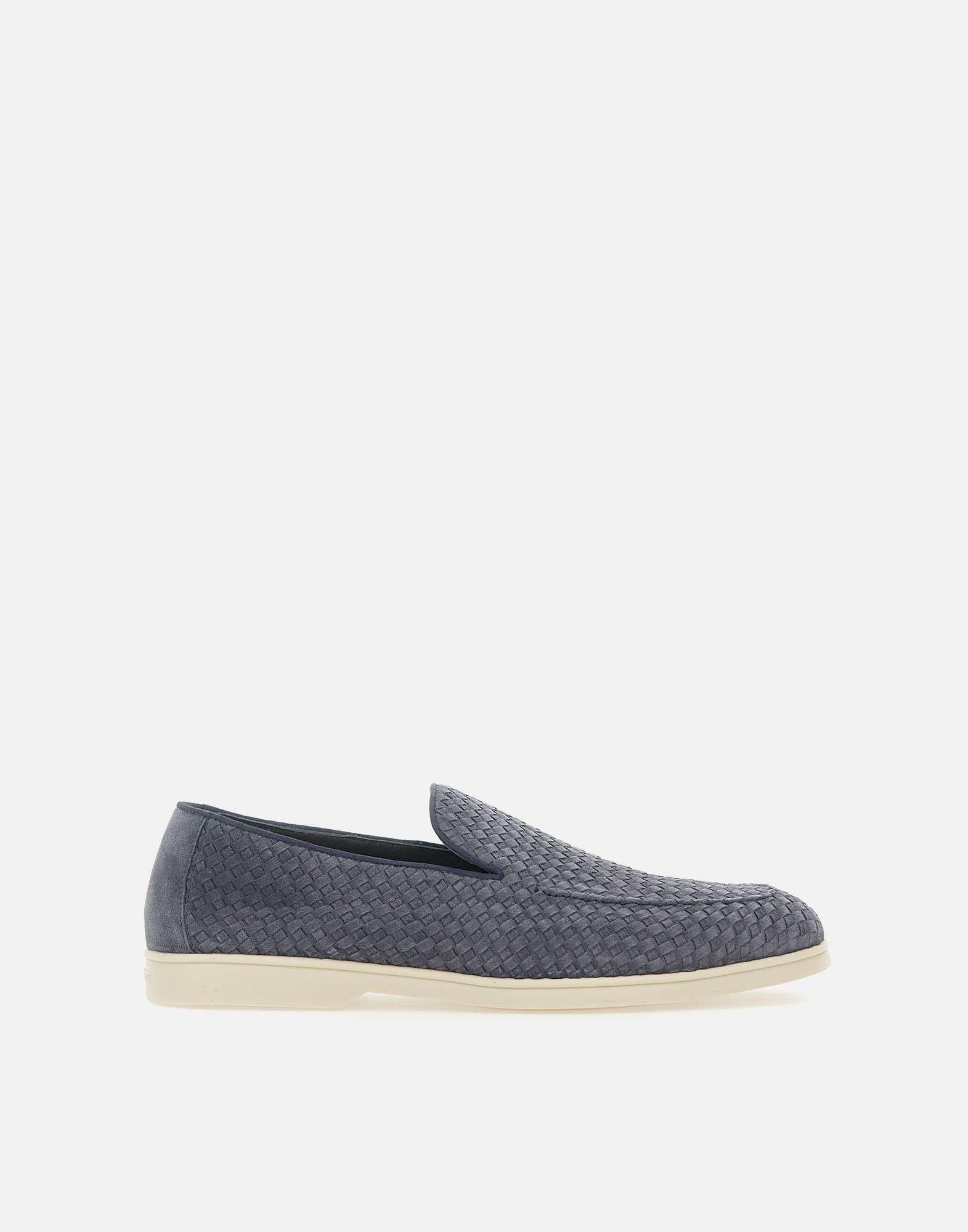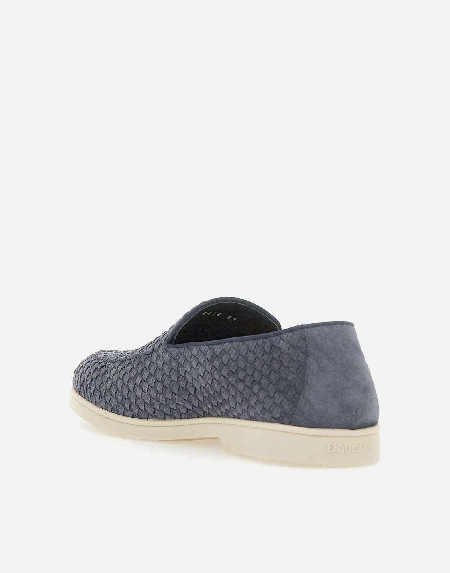 Mocassini uomo Doucal’s “Sauvage” in pelle scamosciata con motivo ad intreccio, blu avio, impunture artigianali a vista, punta tonda, soletta in pelle logata, suola in gomma color glassa, tacco 2cm, made in Italy, custodia inclusa. Calzata regolare