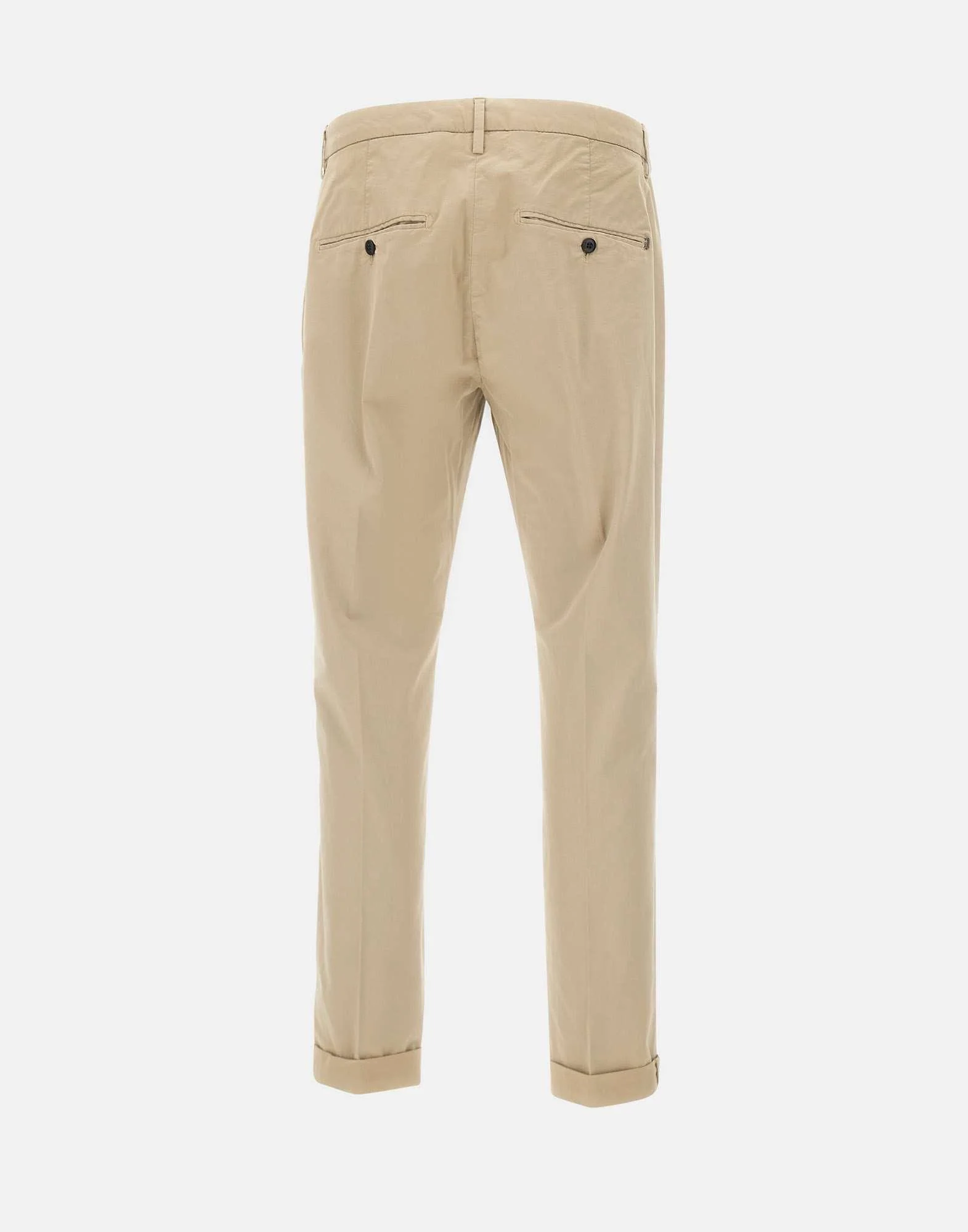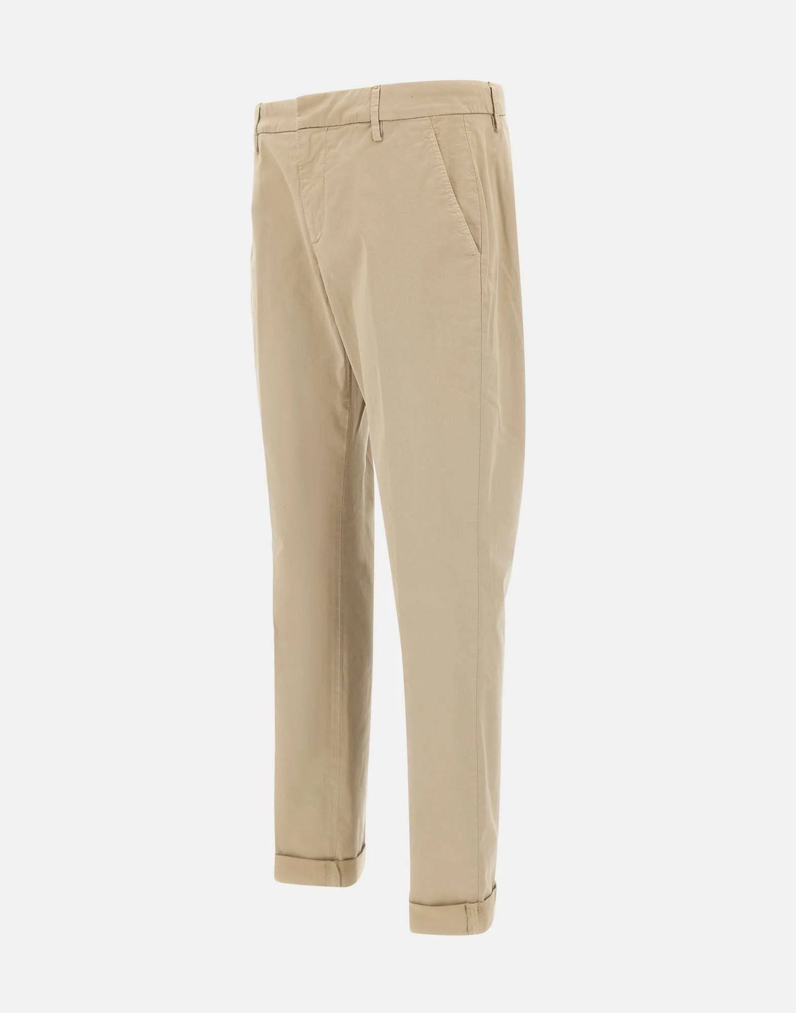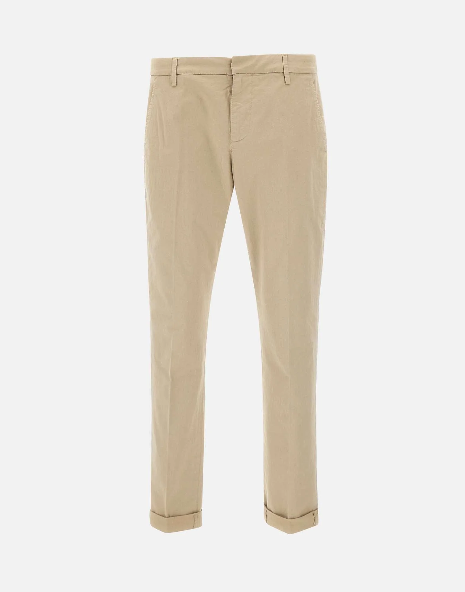 Pantaloni uomo Dondup “Gaubert” in cotone, color sabbia, tessuto extra comfort al tatto e all’indosso, chiusura con bottone e zip, vita regolare con passanti per cintura, tasche laterali oblique, tasche monofiletto sul retro con bottone e mini logo in metallo, slim fit, fondo 17cm, made in Italy.
