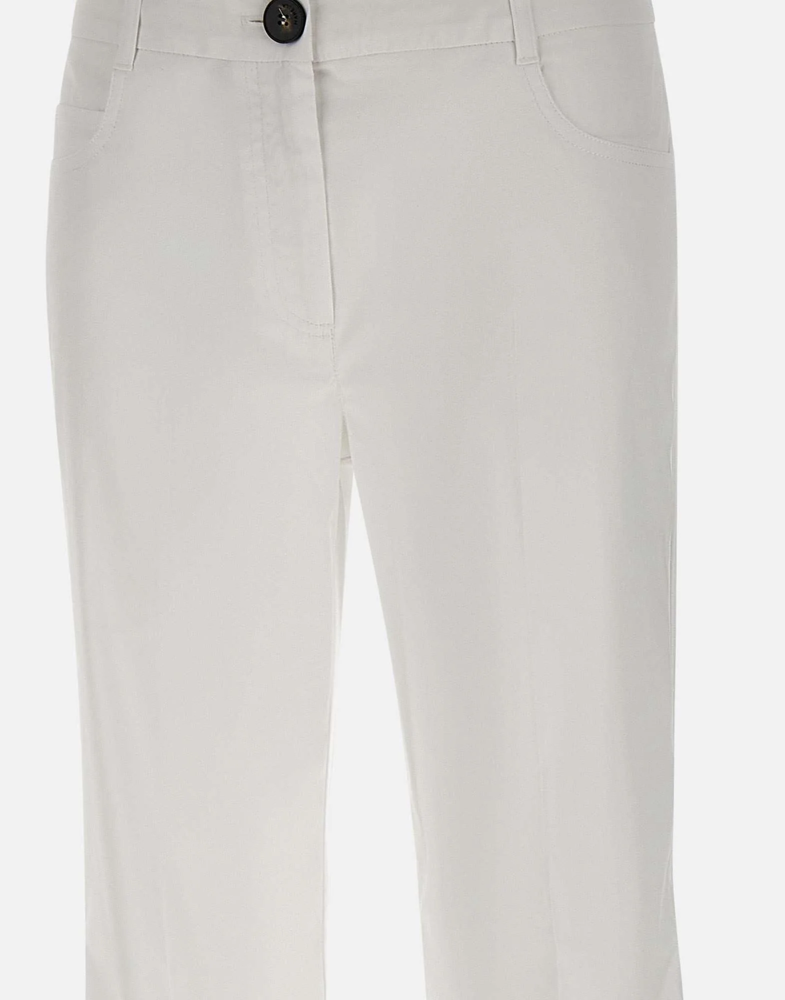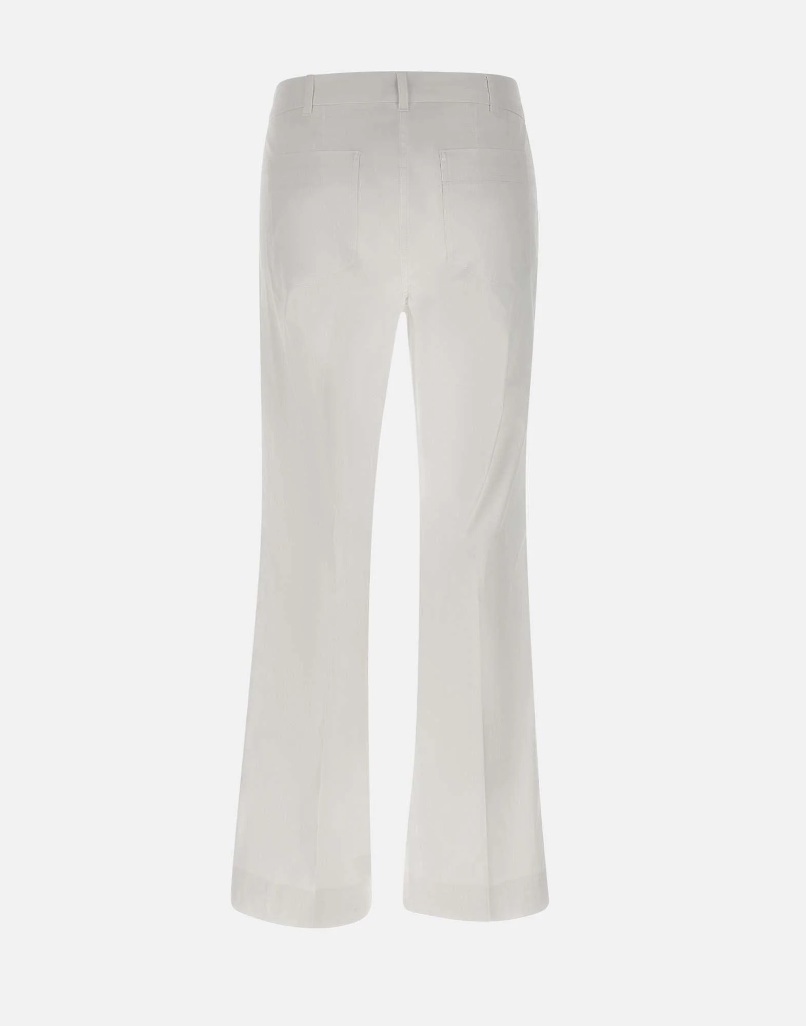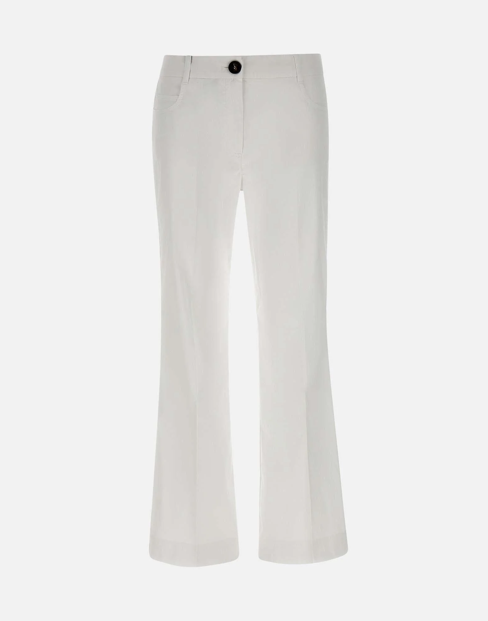 Pantaloni “Girotta” Marella, colore bianco, in fresco popeline di misto cotone stretch, linea flare, cinque tasche, chiusura con bottone logato e zip, piega stirata fronte e retro, fondo 22cm, fit regolare